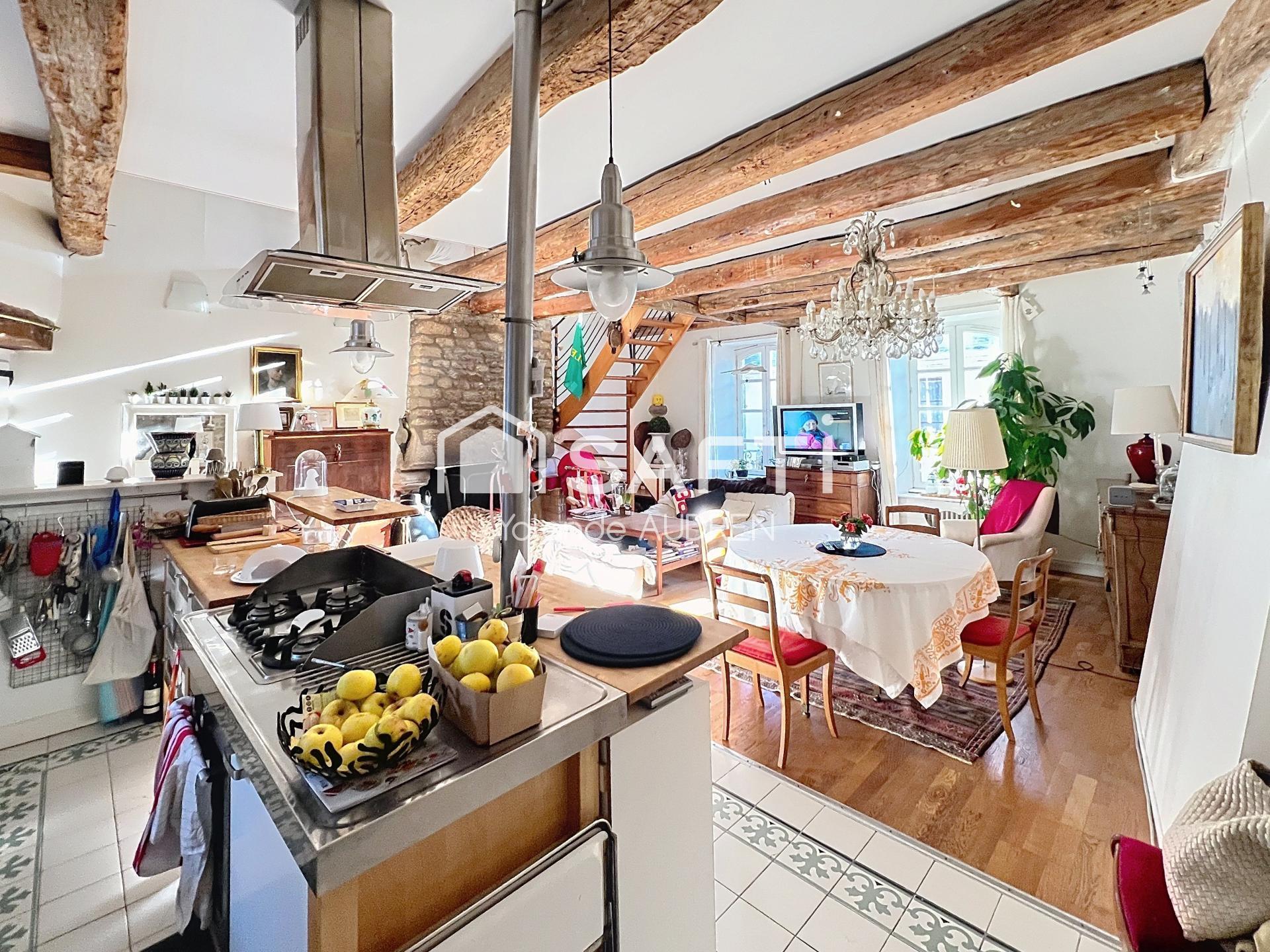 Coup de coeur pour ce duplex unique au 2e étage d'un immeuble ancien en pierre, au coeur des remparts. Alliez prestige historique et confort moderne. L'ESPACE DE VIE : Une vaste pièce de réception baignée de lumière avec un cachet authentique : cheminée monumentale, poutres majestueuses et murs en pierre. Cuisine ouverte, aménagée et équipée, idéale pour la convivialité. AGENCEMENT : Niveau 1 : Une chambre avec dressing, un bureau indépendant (parfait pour le télétravail) et une s