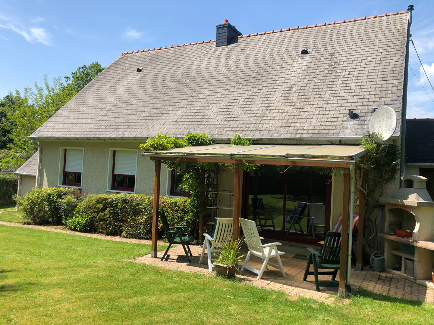MELGVEN , RARE SUR LE MARCHE, MAISON INDIVIDUELLE DE PLAIN PIED ENTIEREMENT RENOVEE comprenant entrée, cuisine aménagée et équipée, salon séjour avec poêle à pellets et accès direct à une terrasse à l'abri des regards, 4 chambres, salle de bain et wc. Garage, remise, carport. Le tout sur terrain de 1300 m². DPE classe D. (5.98 % honoraires TTC à la charge de l'acquéreur.)