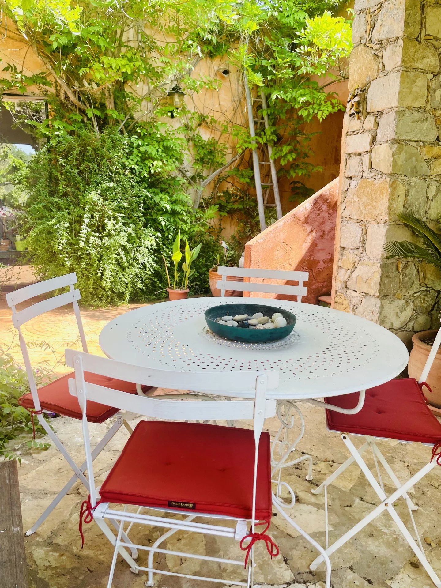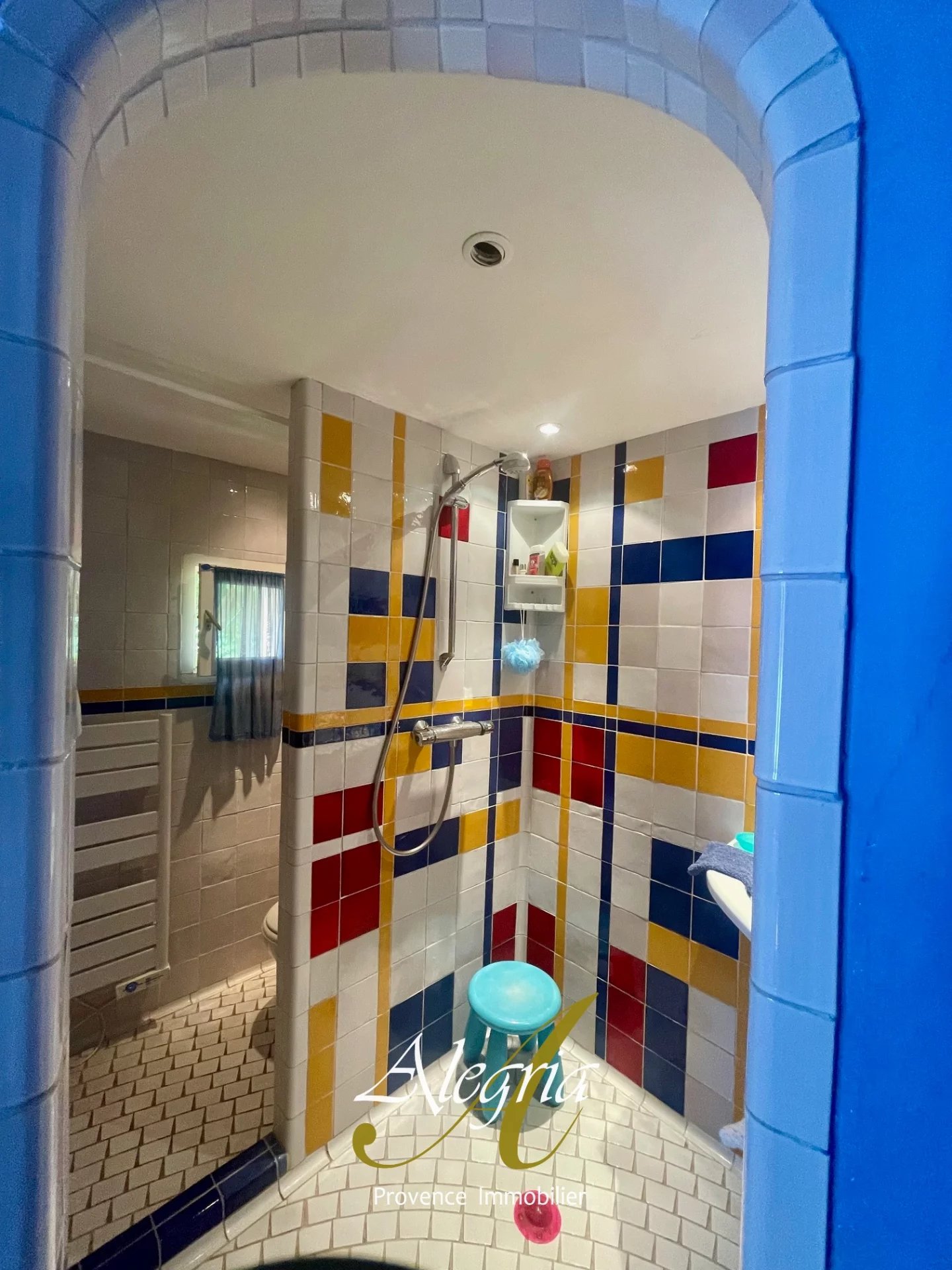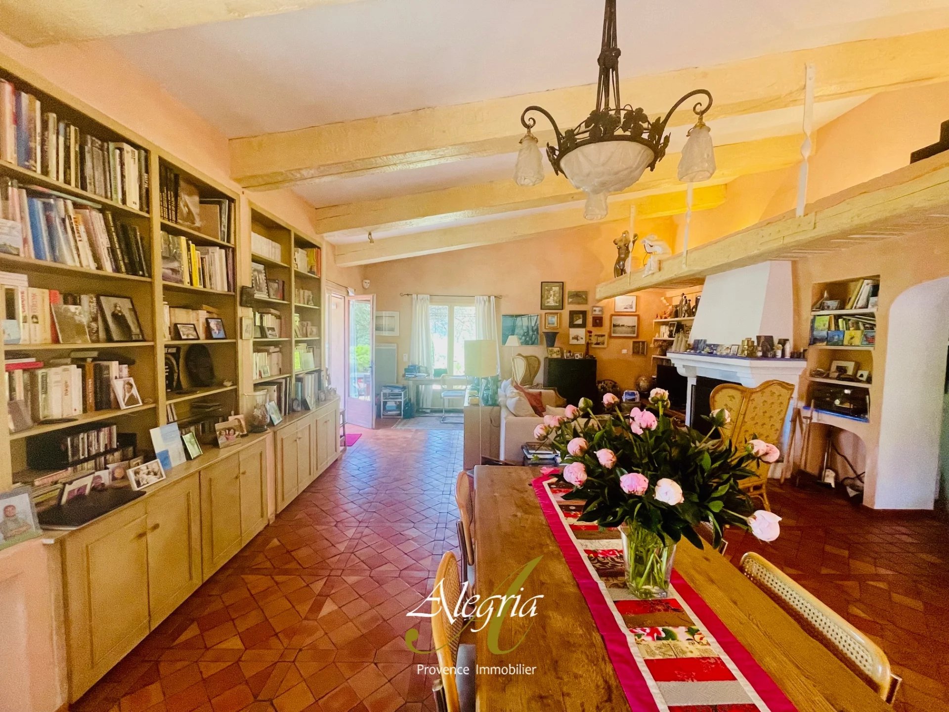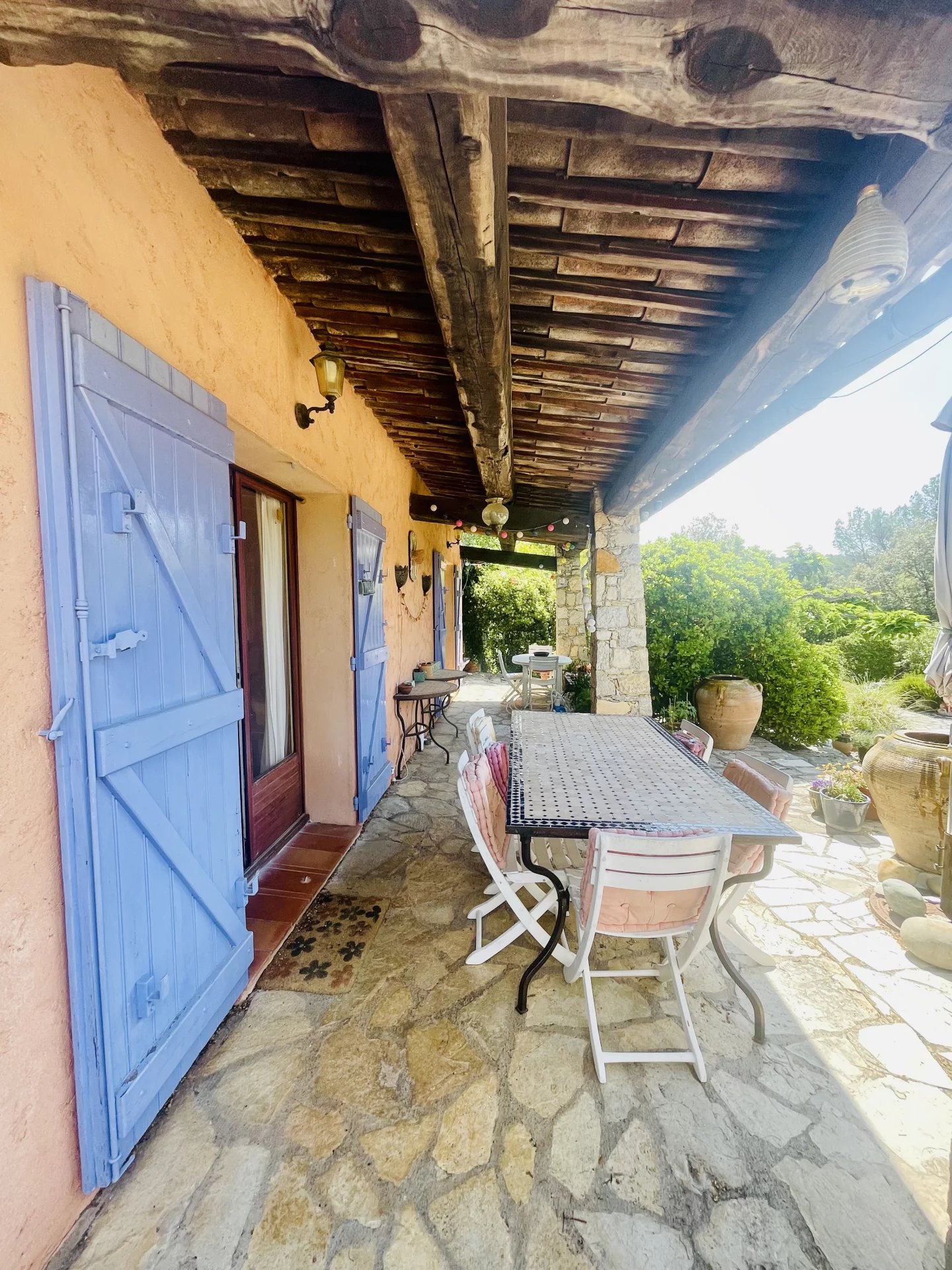 Un chemin sinueux partant de la route forestière, passe sous un grand portail en fer forgé et se fraye un chemin à travers les arbres pour mener à la maison principale. Presque entièrement de plain-pied, cette demeure d'environ 240 m², construite en 1980, dégage un charme ancien et authentique, sublimé par ses poutres apparentes, ses tomettes au sol et ses salles d'eau ornées de carrelages en terre cuite émaillée, œuvre du célèbre céramiste Alain Vagh.