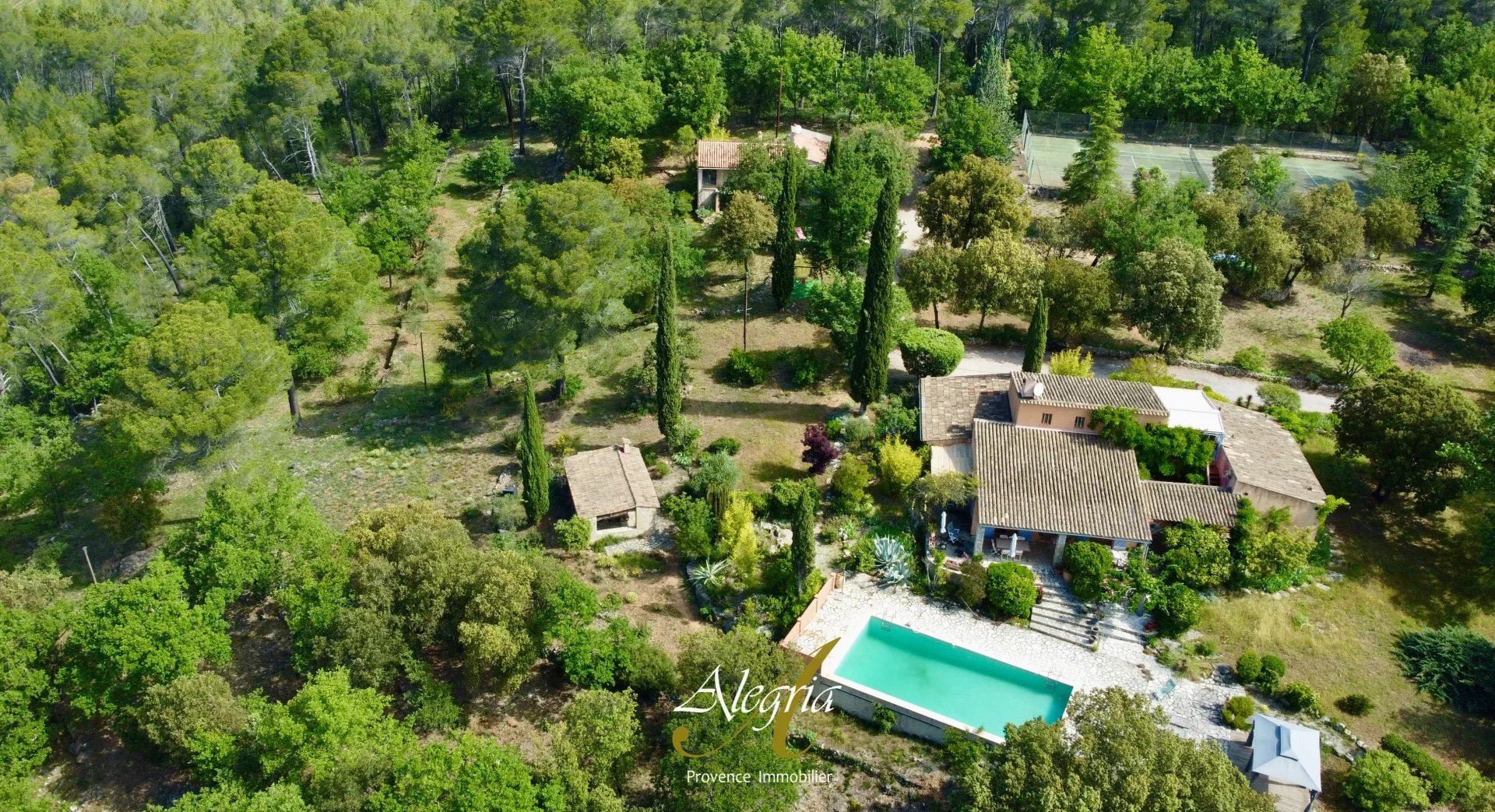 Côté jardin, une ancienne maison de gardien d'environ 90 m² a été aménagée en appartement (55 m²) et studio (environ 35 m²), assurant confort et intimité à ses occupants. Une piscine de 12x6 mètres propose une échappée rafraichissante. Un pool house, théâtre des grillades estivales, et une cuisine d’été invitent à des festins sous le ciel étoilé. Entre ombre et soleil, de vastes terrasses offrent des retraites paisibles. Un court de tennis, un garage spacieux de 42 m² et un parking en plein air complètent ce tableau provençal.