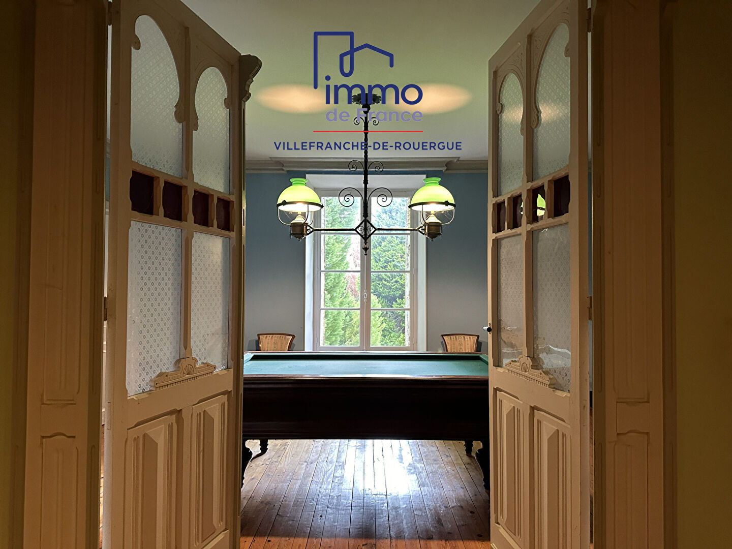 Remarquable propriété début second Empire comprenant une maison de Maître, sa ferme et ses dépendances, piscine (20 x 8.50), ancien tennis, bassin, pièces d'eau, ensemble sur un parc de 8 hectares d'un seul tenant - sans servitudes - de parcelles boisées, verger, prairies, sources... réserve de chasse et chasse privée. Très lumineuse, élevée sur 208 m² de hautes caves voutées (cave à vin exceptionnelle), 380 m² habitables environ, de plain-pied une vaste entrée (34 m²), un salon de 28 m², une salle à manger de 47 m² dotée de hauts plafonds à la Française et d'une belle cheminée en pierre, une cuisine équipée (20 m²) ouvrant sur 340 m² de terrasses extérieures, 2 chambres de 28 m² chacune avec sa salle d'eau attenante, une bibliothèque, un cellier... à l'étage, sur 150 m², 4 chambres spacieuses (de 20 à 24 m²), 3 salles de bain, un billard, dressing et environ 150 m² de combles autrefois en partie habitables (chambre de bonnes). La ferme toute proche, à réhabiliter, propose une maison de la même époque 3 chambres (135 m² habitables), hangar (180 m²), grange sur étable (167 m² au sol), four à pain... Résidence principale d'un architecte depuis plus de 30 ans, celle-ci a fait l'objet d'aménagements contemporains de qualité (cuisine, salle de bains, dressings...) et de remise en valeur des éléments architecturaux caractéristiques de l'époque. Domaine d'exception, en situation dominante, à découvrir à seulement 45 minutes de RODEZ et tout proche de VILLEFRANCHE DE ROUERGUE, de ses commerces, commodités, écoles, collèges, lycées, gare et hôpital. Possibilité d'acquérir en sus 30 hectares de terrain attenant. (3.00 % honoraires TTC à la charge de l'acquéreur.) Jérôme PONS (EI) Agent Commercial - Numéro RSAC : 483910717 - RODEZ.