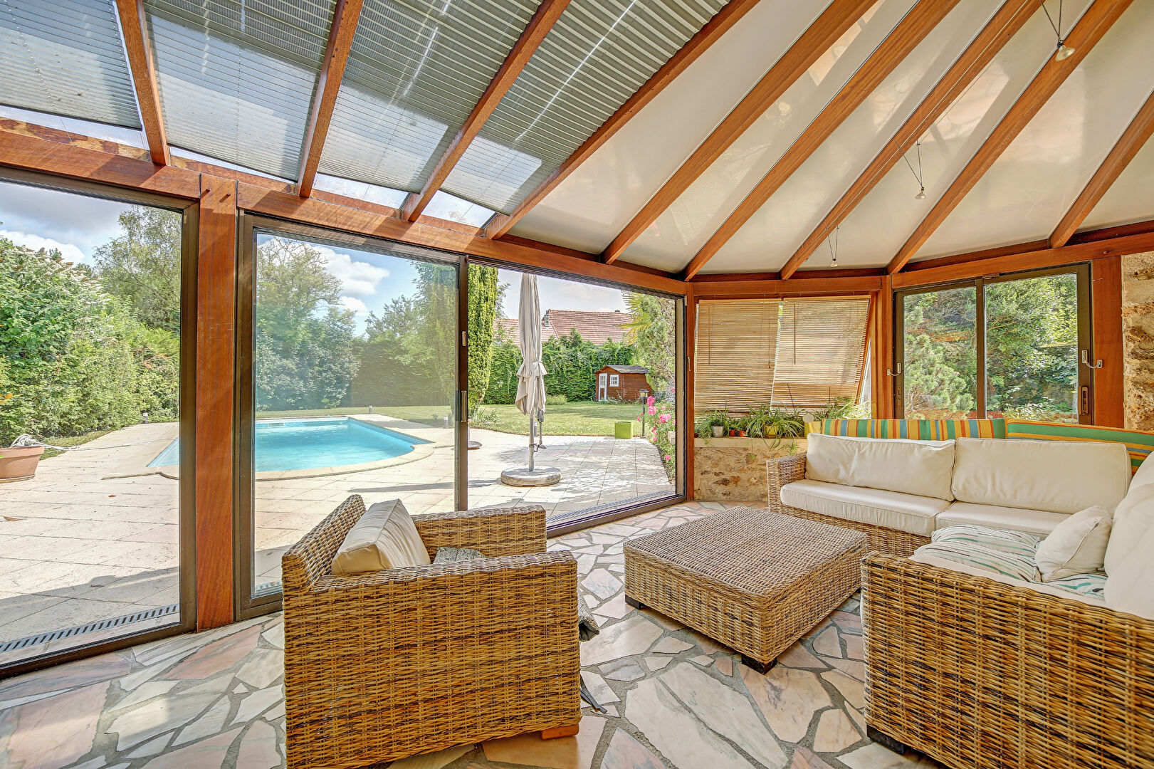 Dans un très bel environnement à l'abri des regards, proche des écoles, de la crèche et du centre du village, jolie maison d'architecte d'environ 240m² habitables, édifiée en 1994 sur un beau terrain plat de 980 m², dans lequel s'intègre une jolie piscine de 10 M X 5 M chauffée. Le rez-de-jardin vous accueille avec une entrée traversante prolongée d'un vaste séjour en L de 69m² avec une cheminée et un accès direct à la véranda donnant sur le jardin, une cuisine équipée indépendante avec un coin repas , une arrière cuisine, un bureau ou une chambre, une salle d'eau, une buanderie et un WC. Au premier étage : une mezzanine distribuant quatre belles chambres dont une suite parentale confortable avec une loggia , un dressing et une salle de bains /WC; une salle de douches et un WC indépendant. Un appentis permettant d'abriter deux véhicules, une cave à vin, une piscine de 10m X 5m équipée d'un système de chauffage solaire, une grande terrasse, un pool house, un abri de jardin, et une dépendance en pierre faisant office de rangement complètent ce bien de qualité. Bus desservant la gare RER de Poissy. En voiture, l'accès vers Paris est rapide via A13 ou A14 . Ravissant jardin, fleuri et arboré au calme absolu. Prix incluant 4.03 % d'honoraires charge acquéreur ( 720 000 euros honoraires exclus ) (4.03 % honoraires TTC à la charge de l'acquéreur.)