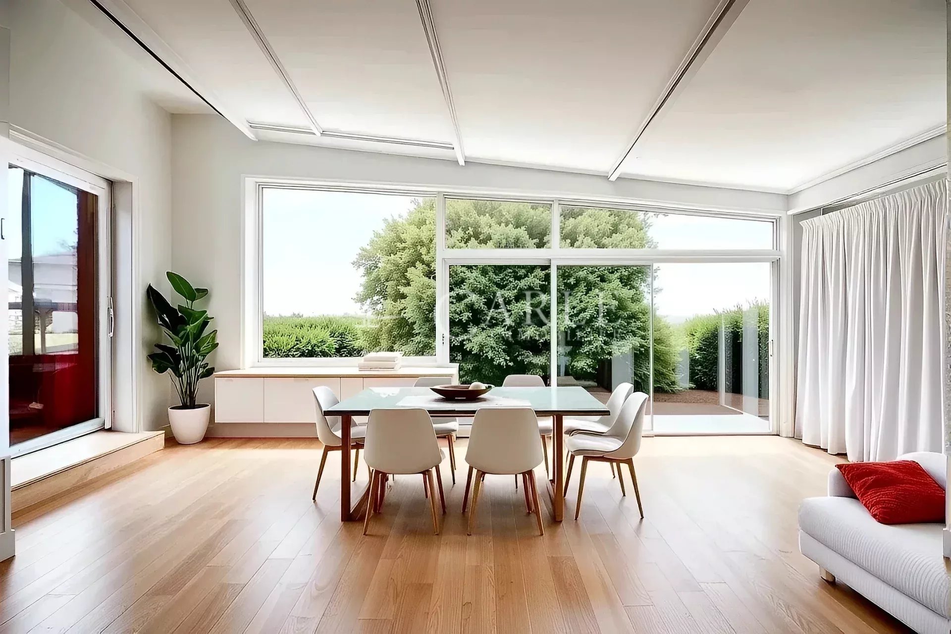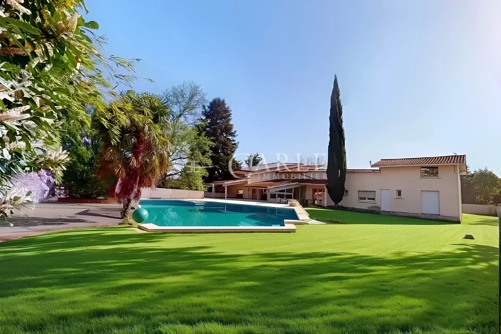 Dans un secteur résidentiel calme et recherché, à proximité du Grand Large et du Groupama Stadium, découvrez cette maison d’architecte située en fond d’impasse, sans vis-à-vis. Édifiée sur un terrain arboré et divisible de 2 250 m², elle développe environ 354 m² de surface incluant une véranda lumineuse, auxquels s’ajoutent environ 80 m² de cave et de sous-sol. La maison propose de grands volumes avec plafonds à la française, un séjour spacieux, un bureau, ainsi que plusieurs chambres et salles d’eau. Une partie de la maison permet de récupérer deux chambres, une salle d’eau et une mezzanine afin de l’utiliser comme dépendance pour accueillir famille ou invités, tout en restant communicante avec la maison principale. Un garage double, un carport pour deux véhicules et un espace extérieur généreux avec piscine complètent l’ensemble. Les visuels proposés sont non contractuels et présentés à titre d’idées d’aménagement. Pour obtenir plus d’informations, des photos complémentaires ou organiser une visite, contactez Thibaud QUINCHEZ. Les informations sur les risques auxquels ce bien est exposé sont disponibles sur le site Géorisques : www.georisques.gouv.fr ** Ce bien vous est présenté par Thibaud QUINCHEZ, agent commercial indépendant de CARLE IMMOBILIER immatriculé au R.S.A.C. de Lyon sous le numéro 897 407 607 - Titulaire de la carte de démarchage immobilier pour le compte de CARLE IMMOBILIER