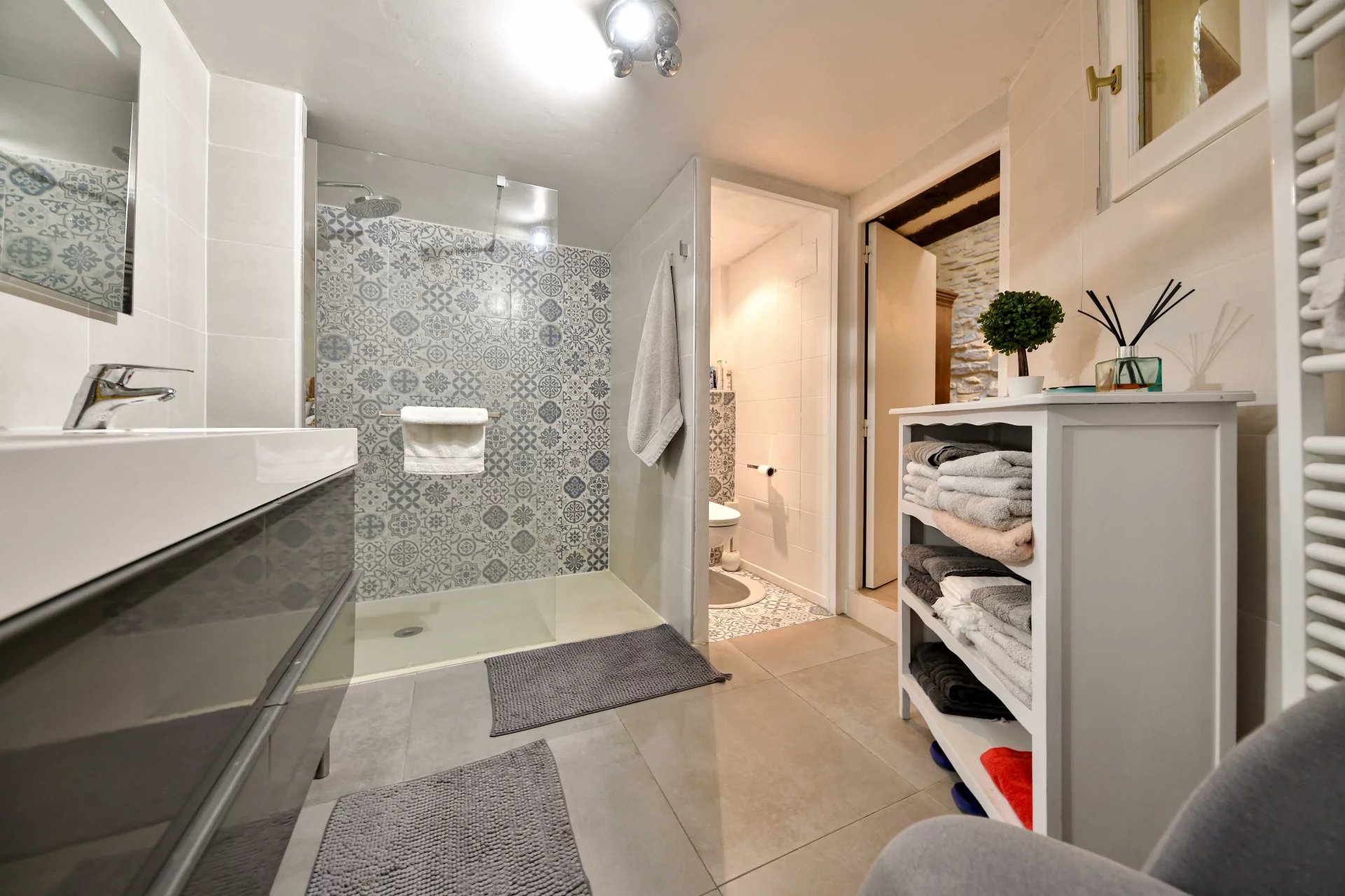 Maison en pierre entièrement restaurée Pièce de réception lumineuse avec poêle à bois 3 chambres, 2 salles de bains Terrasse. Garage et cave