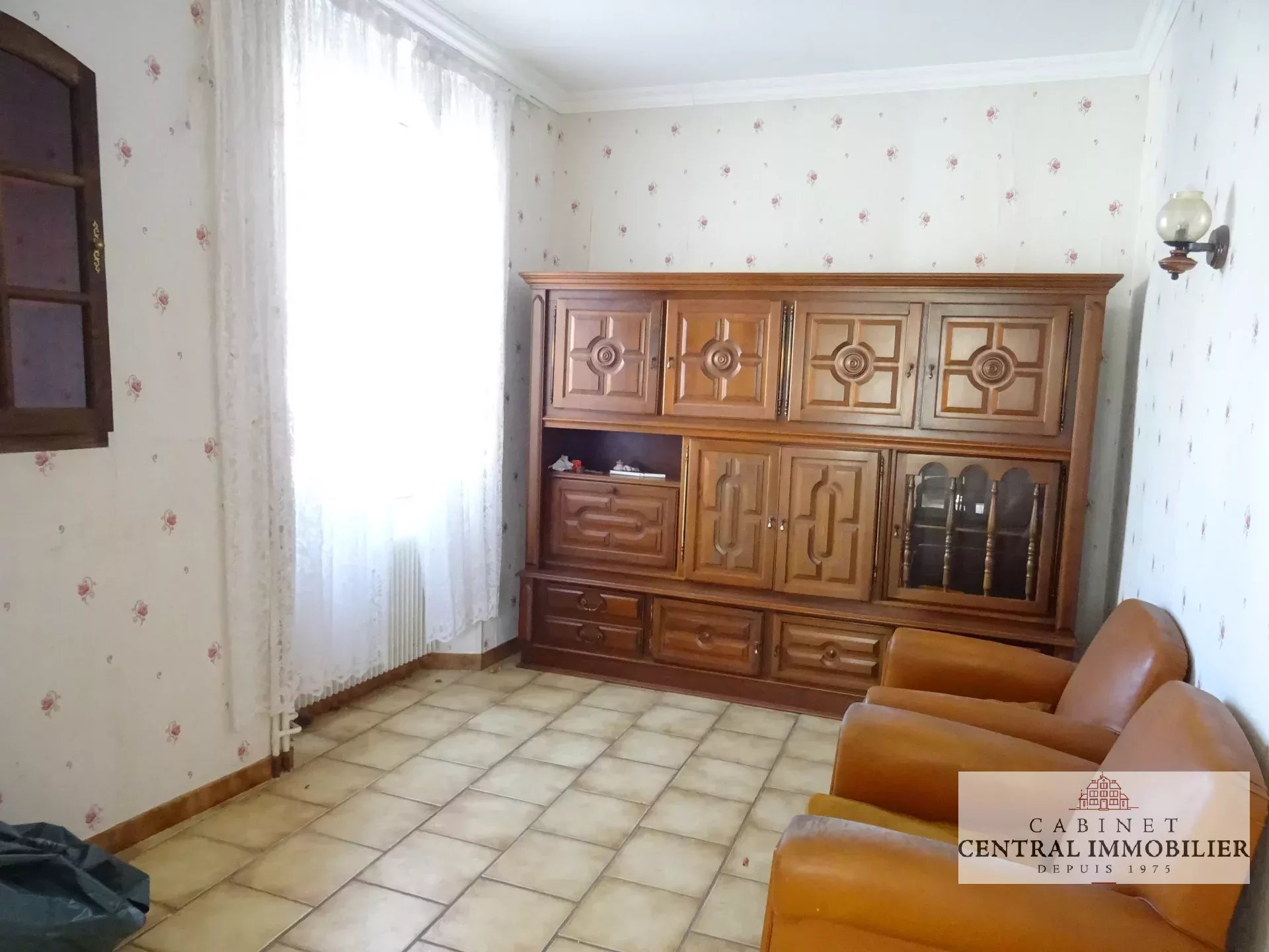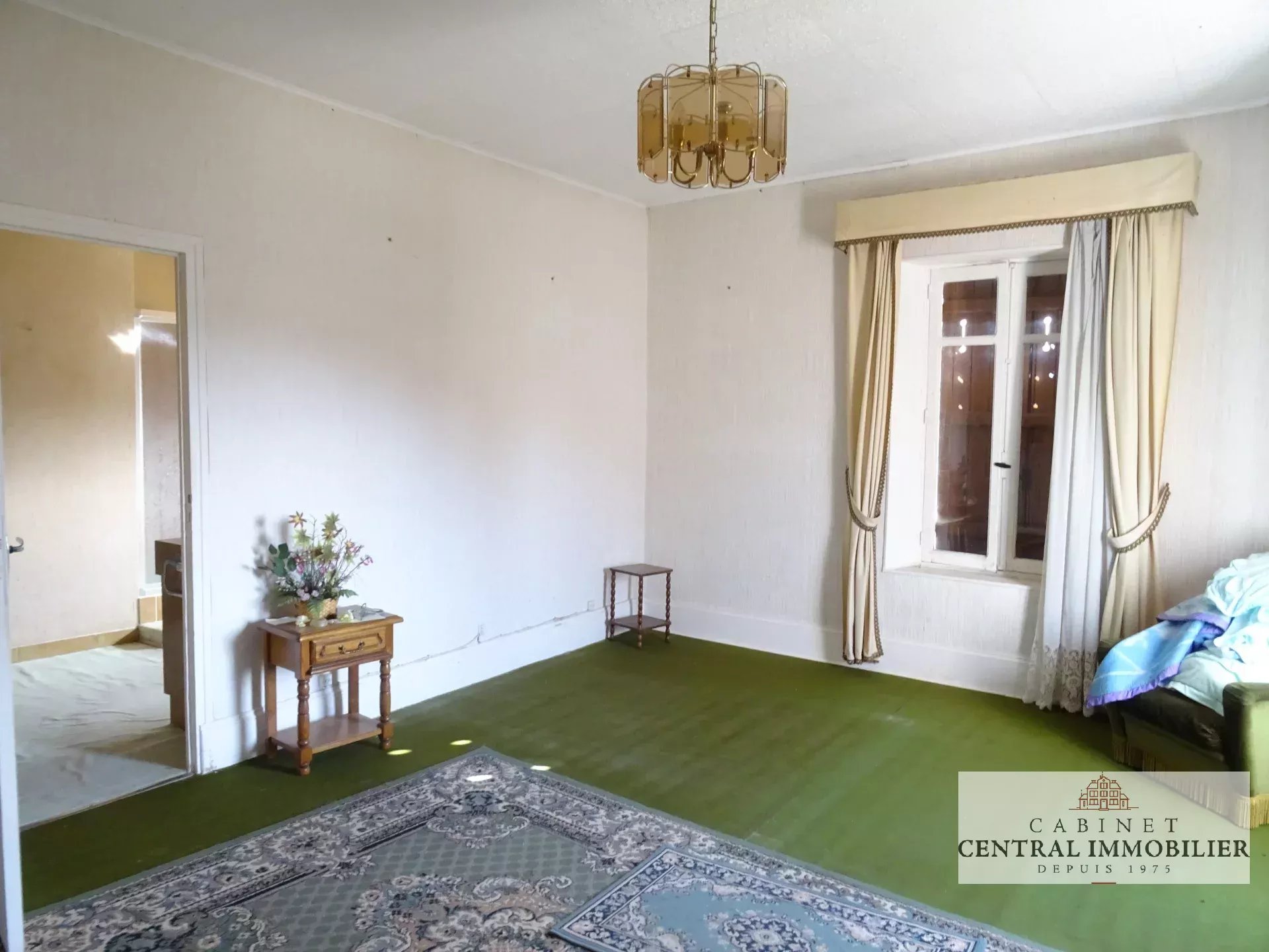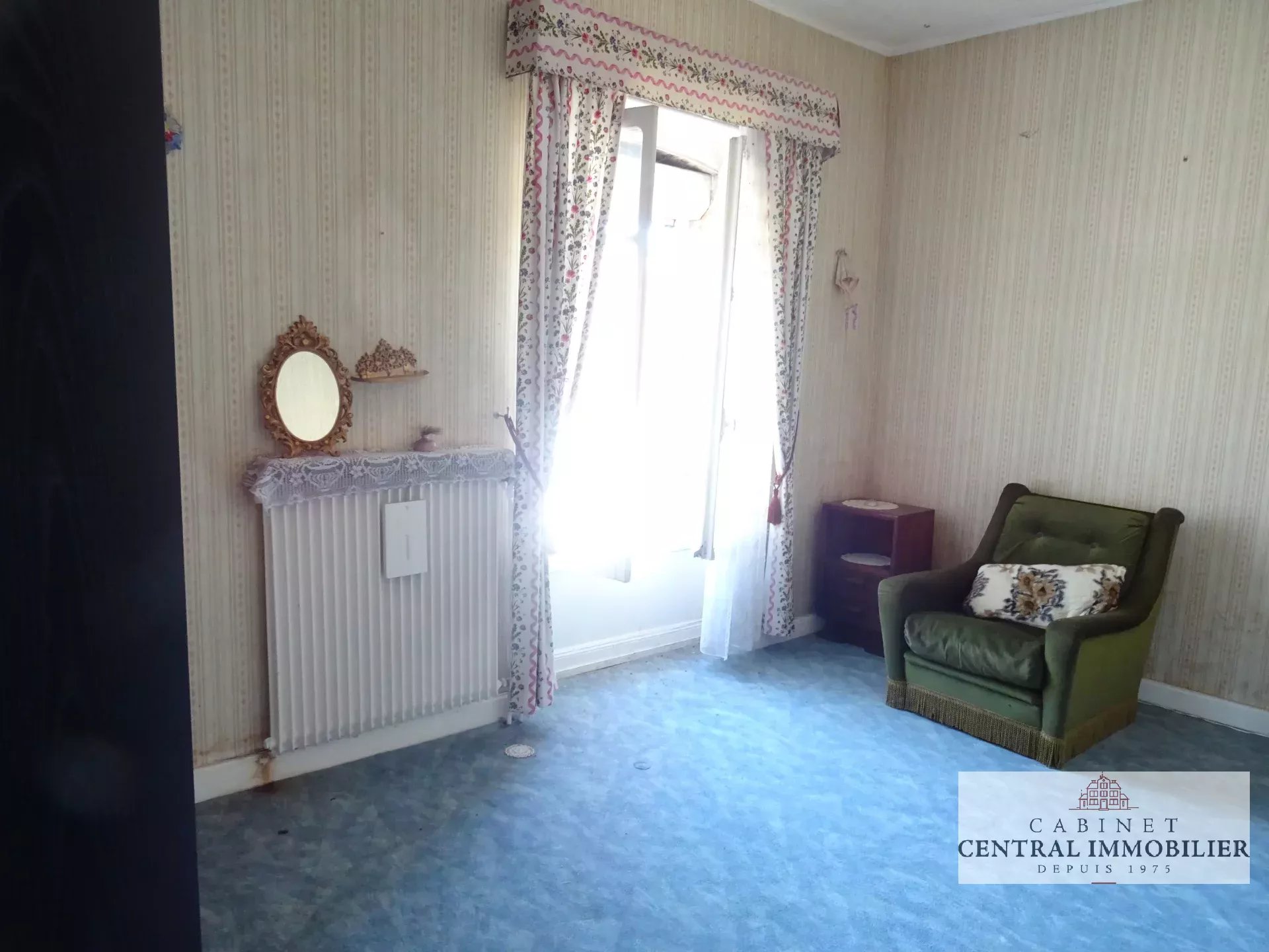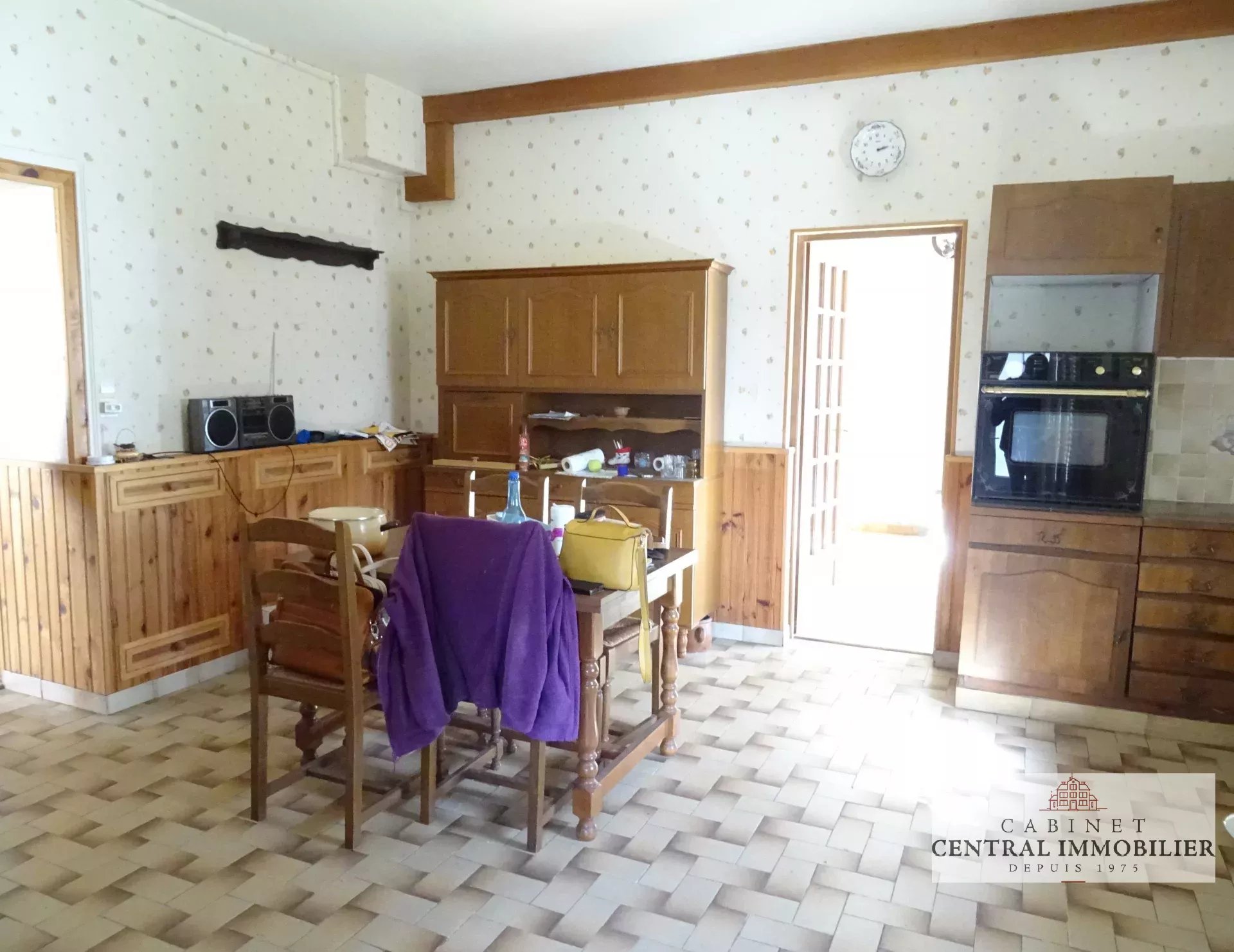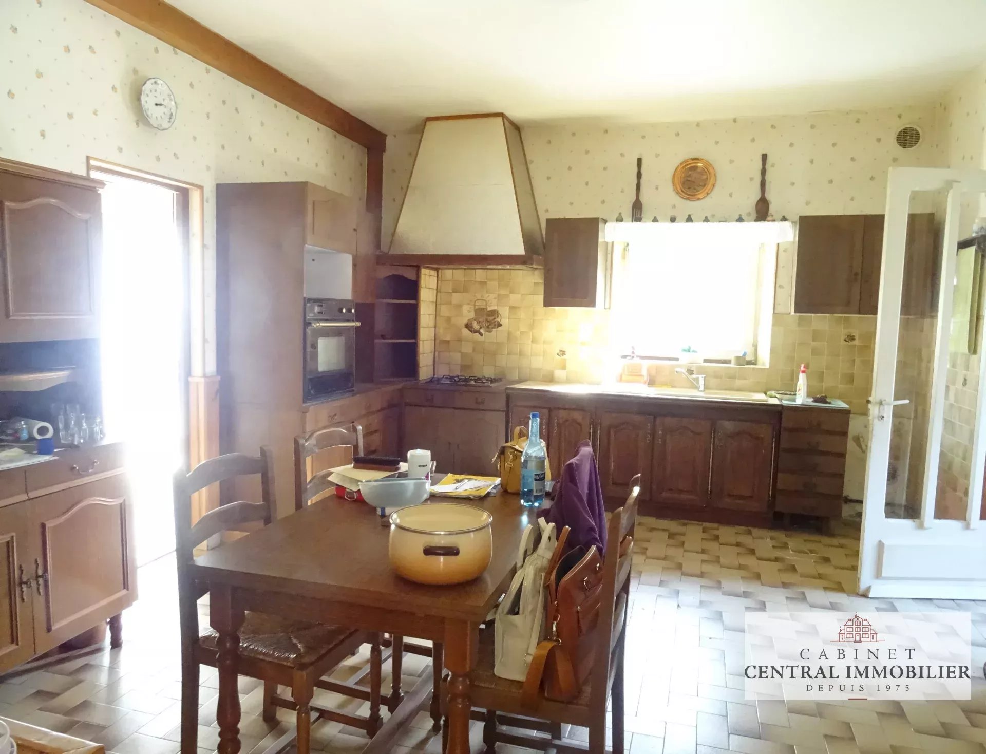 Maison à rafraichir comprenant : sas d'entrée, cuisine de 22m² carrelée aménagée équipée, salon de 16.80m² carrelé avec cheminée et baie vitrée accès jardin, séjour de 30m² carrelé (avec possibilité de cloisonner pour une 4ème chambre), wc. À l'étage : vaste palier, 3 chambres de 9.40m²/11m² et 21m², salle de bains avec baignoire, douche, double vasque, wc et dressing. Chauffage central fuel. Remise en dur. Garage avec atelier. Grange avec cave et belle pièce aménagée au dessus. Terrain clos de 456m².
