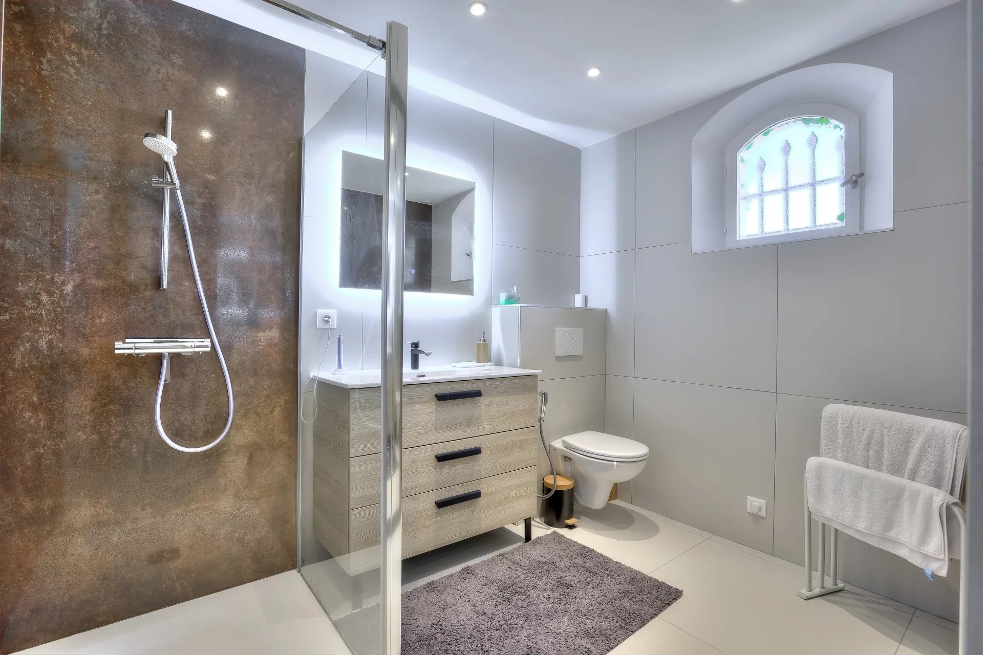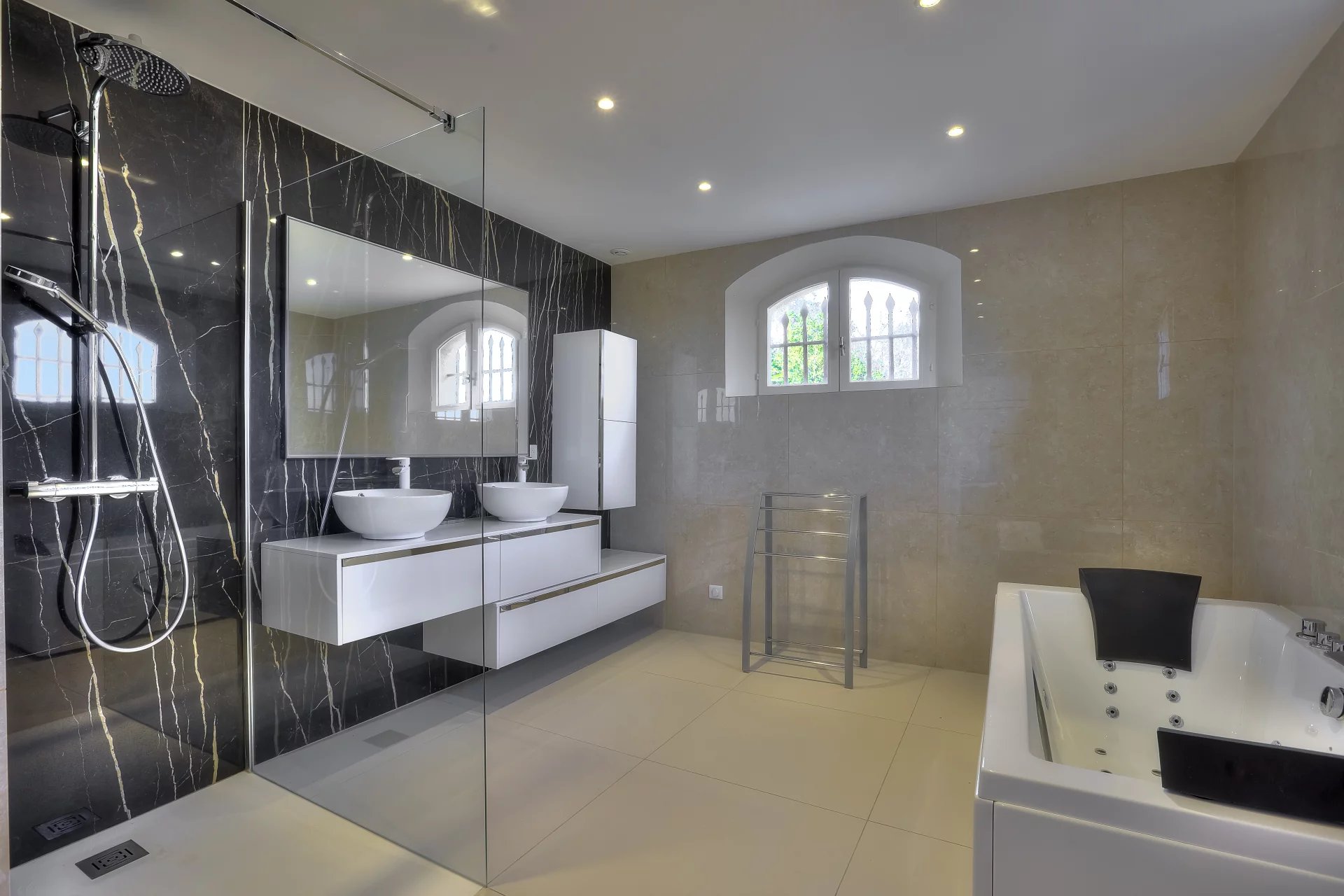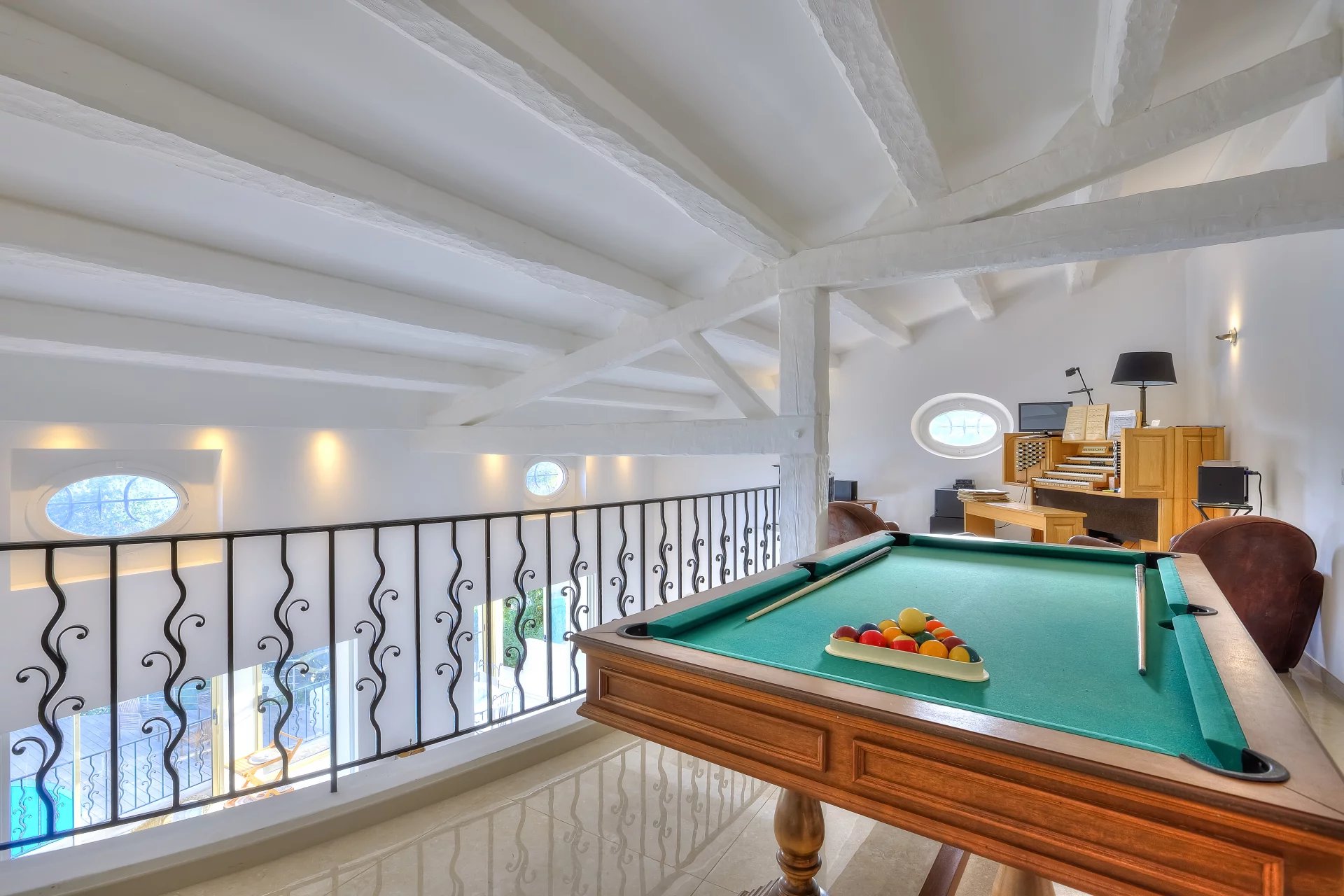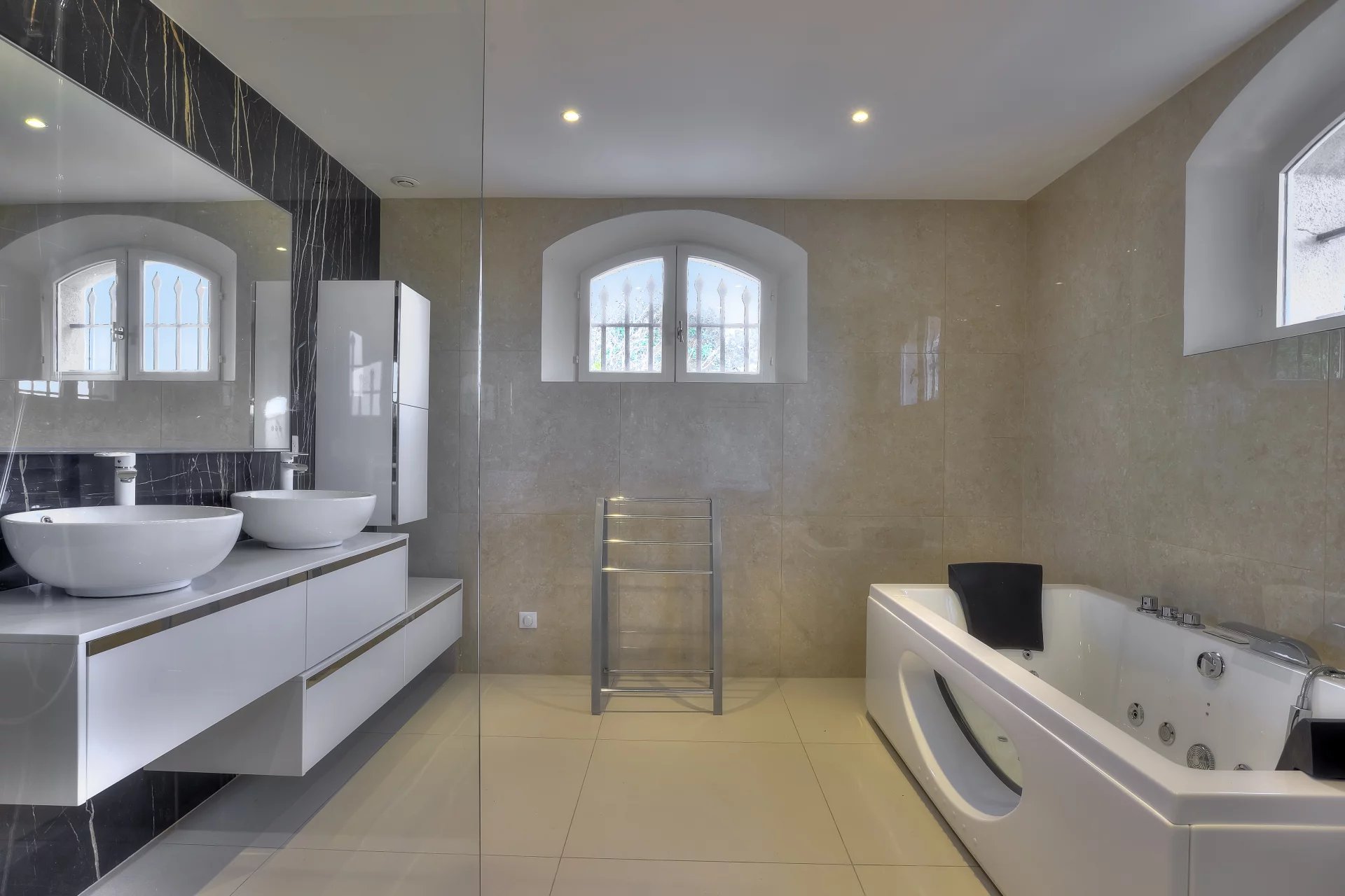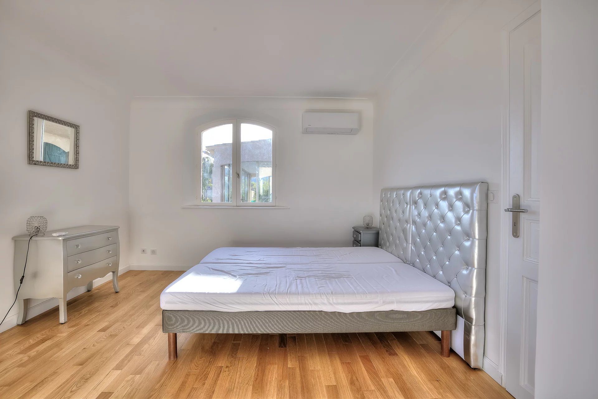Position dominante pour cette villa de presque 300 m² habitable avec belle vue mer et dégagée sur le Cap d'Antibes, quartier au calme absolu mais pas excentré. Sans aucun vis à vis. Construction traditionnelle sur deux niveaux avec garage, terrasses, piscine sur terrain en restanque de 1500 m². Espace de réception de 136 m². Vendue entièrement rénovée, carrelage dans la partie jour, parquet dans les chambres, 3 salles de bains, cuisine neuve équipée avec ilot, sauna, grande piscine avec plage en bois exotique de 150 m². Intégration de la véranda dans le séjour et changement des menuiseries. climatisation dans toutes les pièces.