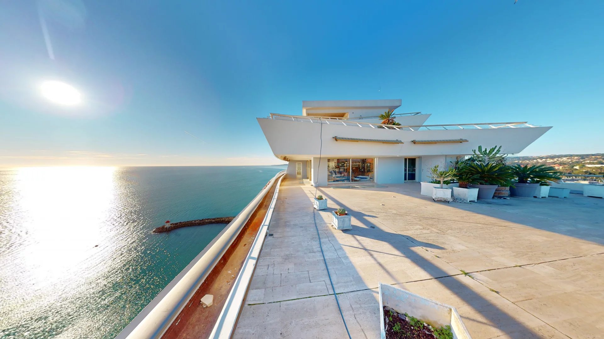 VILLENEUVE-LOUBET - MARINA BAIE DES ANGES - APPARTEMENT 3/4 PIECES de 110 m² situé en étage élevé dans une résidence FRONT DE MER, les pieds dans l'eau avec accès direct à la plage ! Le bien dispose d'un spacieux séjour, d'une cuisine indépendante avec possibilité US, d'une chambre avec placard, d'une salle de bains, WC invités et d'une suite parentale avec salle de bains, WC et dressing. Le tout s'ouvrant sur une terrasse d'angle de 150 m² avec une vue mer panoramique, exposée EST / OUEST. Vendu avec une cave et un garage.