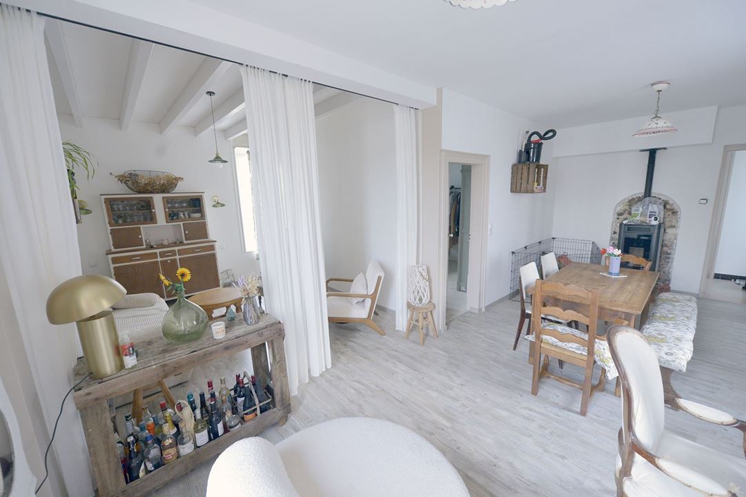 Rez-de chaussée: Salon/salle à manger, Cuisine ouverte équipée avec cheminée à bois, Trois chambres, dont deux avec accès direct au jardin et à la piscine, Salle de bains, buanderie, WC séparé