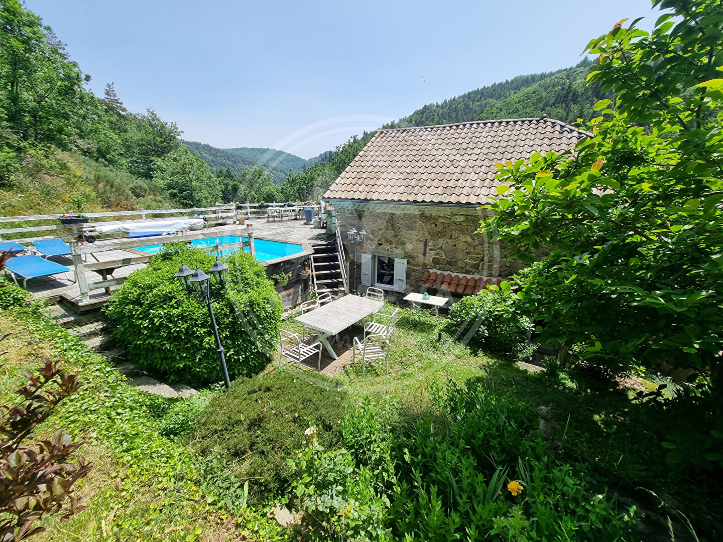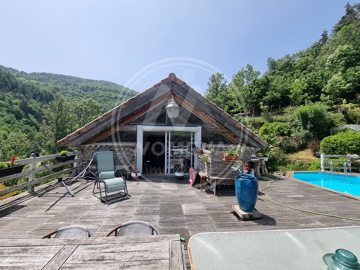 NOMÉVA vous présente sa nouvelle pépite ! Une magnifique maison en pierre de caractère, d'une superficie habitable de 263 m², située en Ardèche, à environ 10 min de Saint-Bonnet-le-Froid. Elle se compose : * Au RDC : d'un grand hall d'entrée de plus de 35 m², desservant 3 chambres, une SDE/WC, une buanderie, ainsi qu'une cave. * Au 1er étage : vous accédez à la partie jour avec sa cuisine/salle à manger de plus de 40 m², son agréable et spacieux salon d'environ 47 m² exposé sud-est. Vous trouverez également à ce niveau, une 4ème chambre et une SDE/WC. * Enfin au second étage vous bénéficiez d'une 3ème SDE/WC, d'un bureau et d'un 2ème salon d'environ 39 m² avec un accès direct à la terrasse en bois de 70 m² avec piscine et vue imprenable sur la nature ! Un vrai havre de paix ! Un jardin, un appentis de 29 m² puis deux cabanes de rangement viennent compléter cette charmante maison. Fenêtres bois double vitrage - Volets bois - Mode de chauffage : PAC + deux poêles à bois - Assainissement individuel. On aime ses volumes qui peuvent faire le bonheur d'une grande famille ou d'un projet touristique. Informations complémentaires et visites au : 04 71 75 71 75. Référence annonce : 237