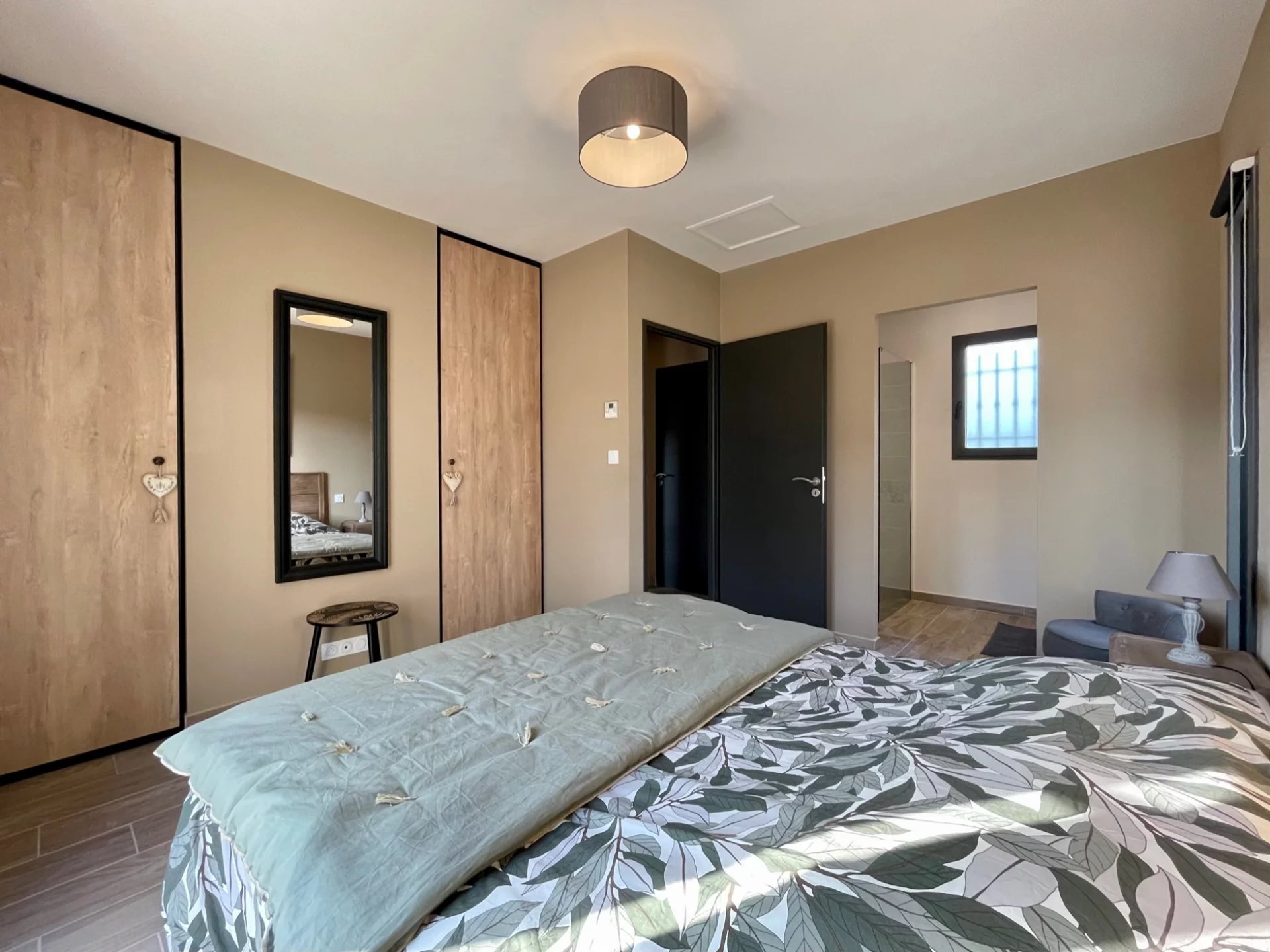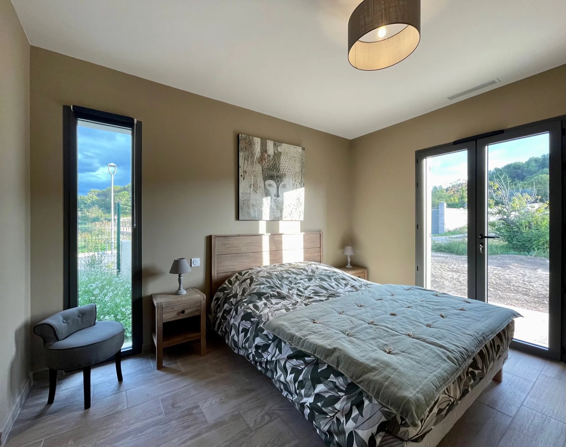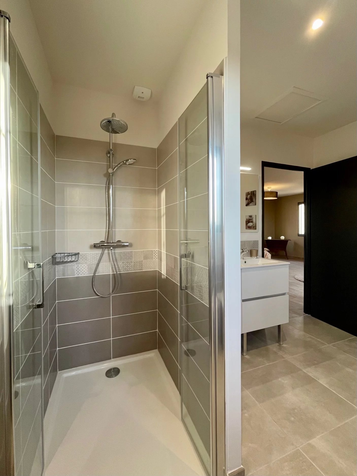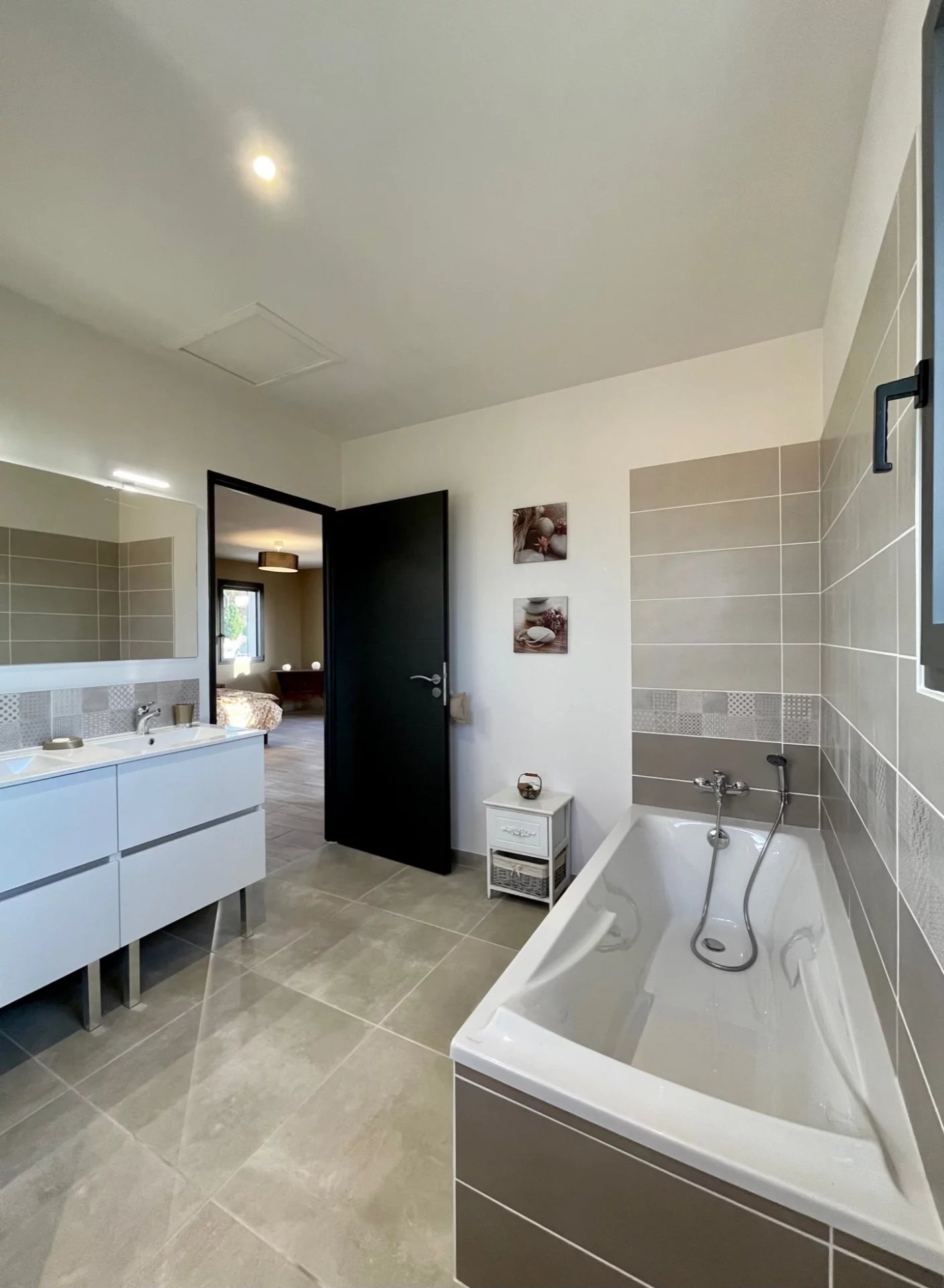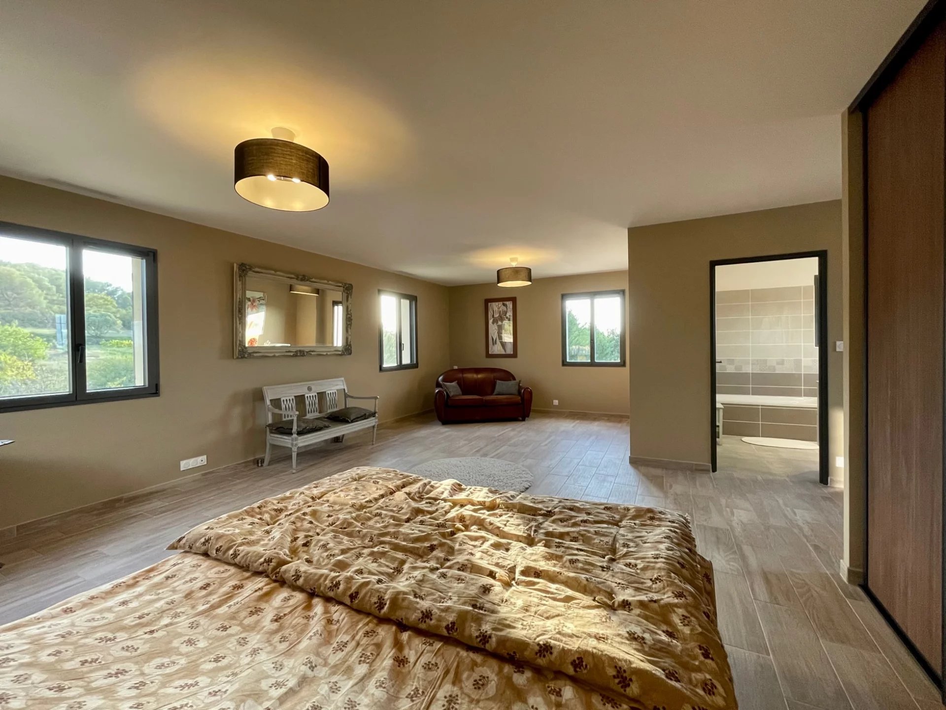 Au calme, en position dominante et non isolé, 35 mn d'Avignon TGV, 5 mn à pieds du village de Saint Didier tous commerces à l'année, Villa de construction de 2023 tout confort d'environ 139 m² sur deux niveaux, Hall d'entrée, salon séjour cuisine équipée d'environ 58 m² ouvert au Sud et à l'Ouest par de grandes baies vitrées en vue dominante sur la colline et la vallée et les oliviers, chambre salle d'eau, wc indépendant avec lave mains, garage doublé, isolé et carrelé, buanderie. A l'étage, palier, dégagement, wc indépendant, salle de bain et douche à l'italienne, suite parentale d'environ 37 m² avec placard dressing (fenêtres et électricité prévu pour une chambre supplémentaire). Climatisation réversible gainée en plafonds, assainissement collectif, eau de ville, edf, alarme caméras, téléphonie fibre optique, carrelage grés, menuiseries aluminium double vitrage, volets roulants automatisés, volets bois pour les chambres, tonnelle au Sud, alarme caméras, piscine 4 x 8 m. sur 1,5 m. de hauteur avec plage immergée, plages piscine bois, local technique, l'ensemble sur un terrain clos et arboré d'environ 1100 m² en position dominante. Golf de Saumane à 15 mn, Fontaine de Vaucluse 15 mn, Gordes 20 mn, L'Isle-Sur-La-Sorgue 20 mn, Dentelles de Montmirail 30 mn, Aéroport Marignane-Marseille 90 mn.