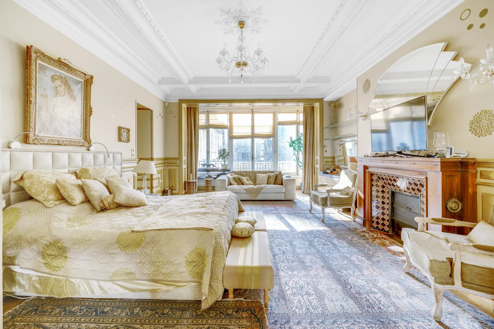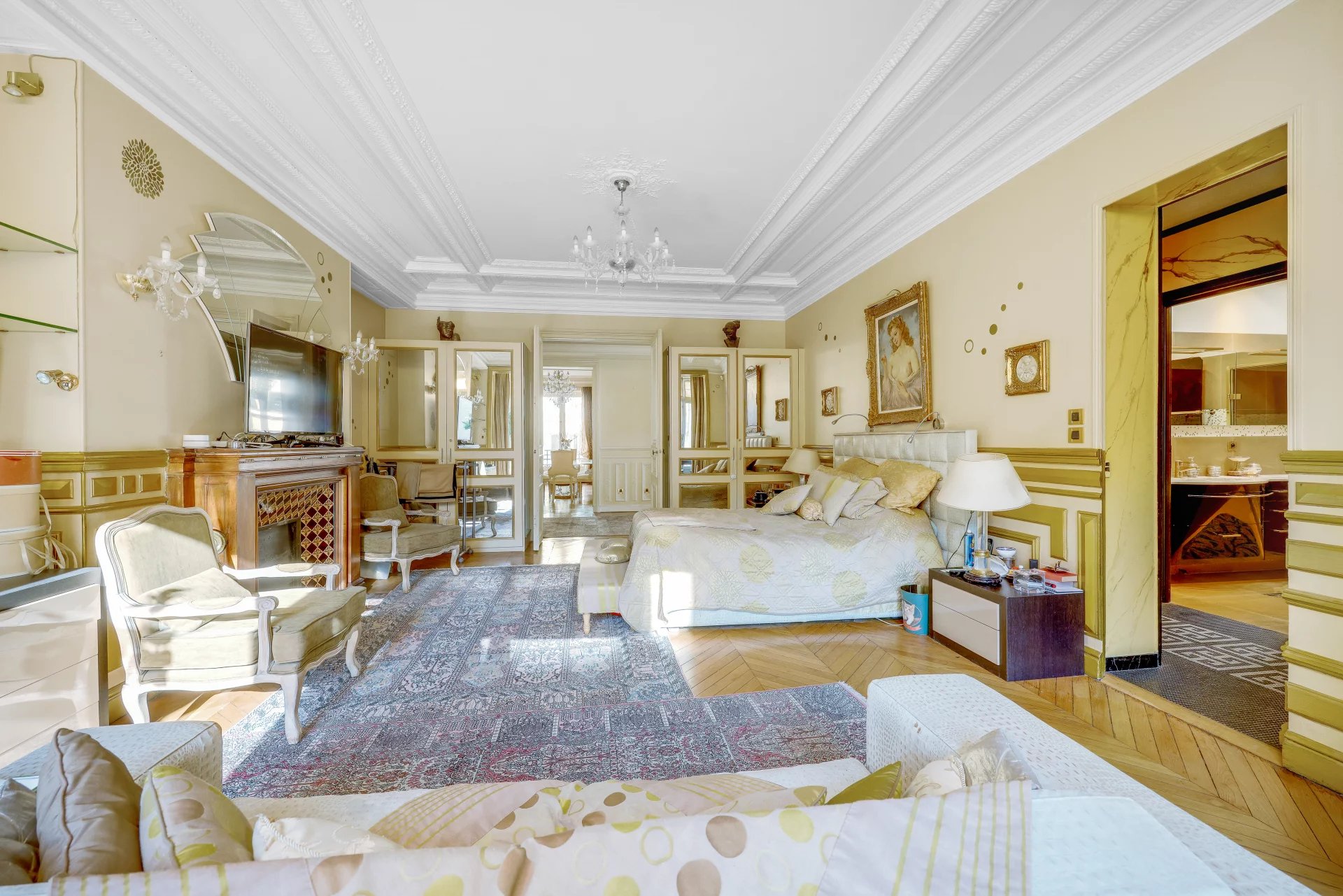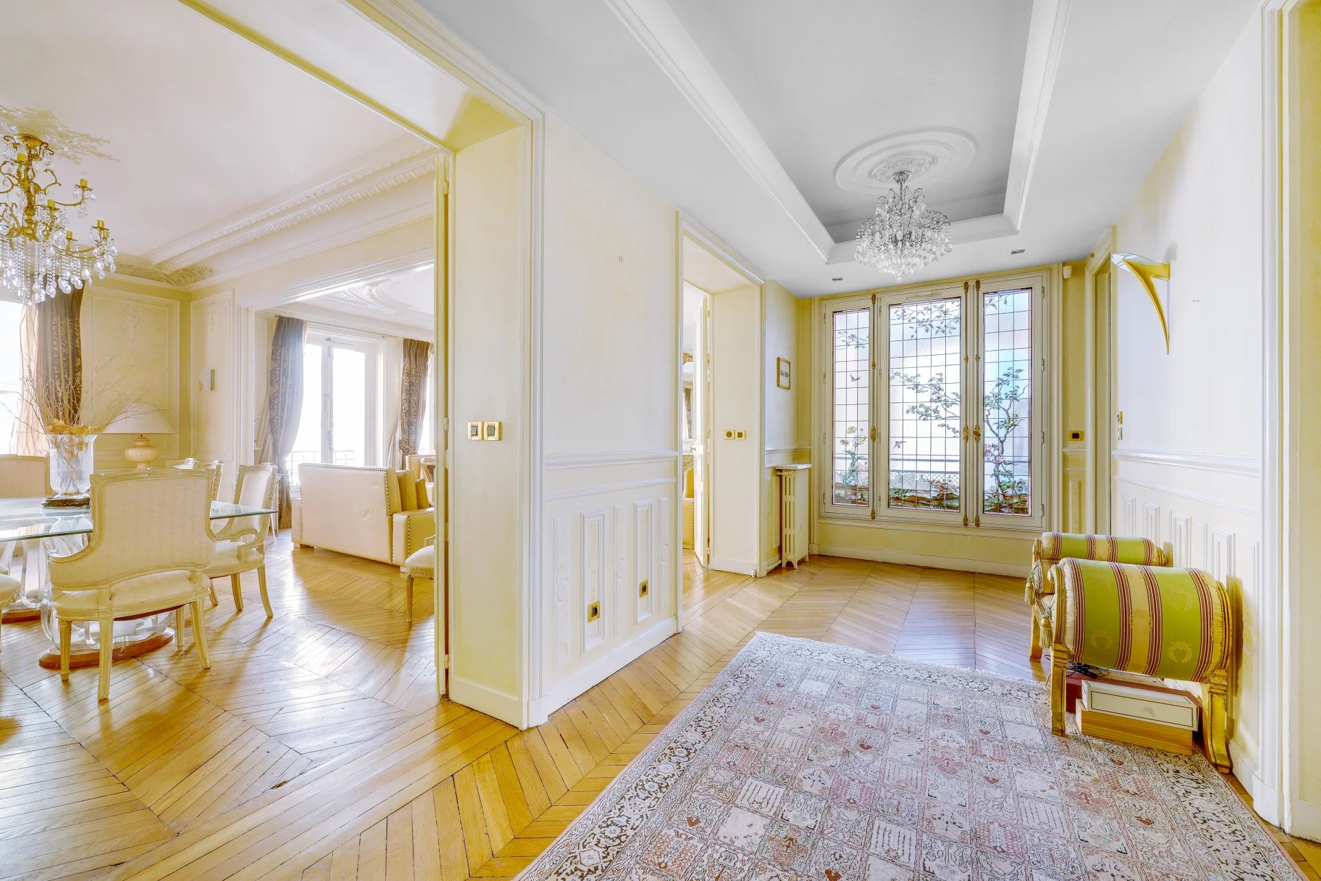 Situé dans un prestigieux immeuble haussmannien à proximité de l'avenue des Champs-Élysées, cet élégant appartement de 5 pièces offre une superficie de 232 m² (loi Carrez). Il se compose d’une galerie d'entrée, d’un double séjour lumineux avec cheminée, d'une grande cuisine dînatoire entièrement équipée, d’une suite parentale avec cheminée et vue sur un jardin arboré, ainsi que de trois chambres supplémentaires. (possibilités 4 chambres). L'appartement bénéficie de nombreux équipements de luxe, tels que des sols en carrelage Bizzaza, un parquet en point de Hongrie, et des vitraux restaurés. Deux salles de bains (dont une avec baignoire balnéo et douche hammam), des toilettes séparées et de nombreux rangements ajoutent au confort de ce bien. Le bien est situé dans une copropriété de 9 lots principaux, avec une atmosphère luxueuse renforcée par les parties communes en cuir de Cordoue. Des meubles peuvent être inclus, tels qu’une table Lalique et des luminaires en cristal italien. Une chambre de service ainsi que deux places de parking sont également également proposée en supplément du prix. Pour tous renseignements, appeler L'AGENCE DES ARTS ET MÉTIERS au 01 44 61 04 04.