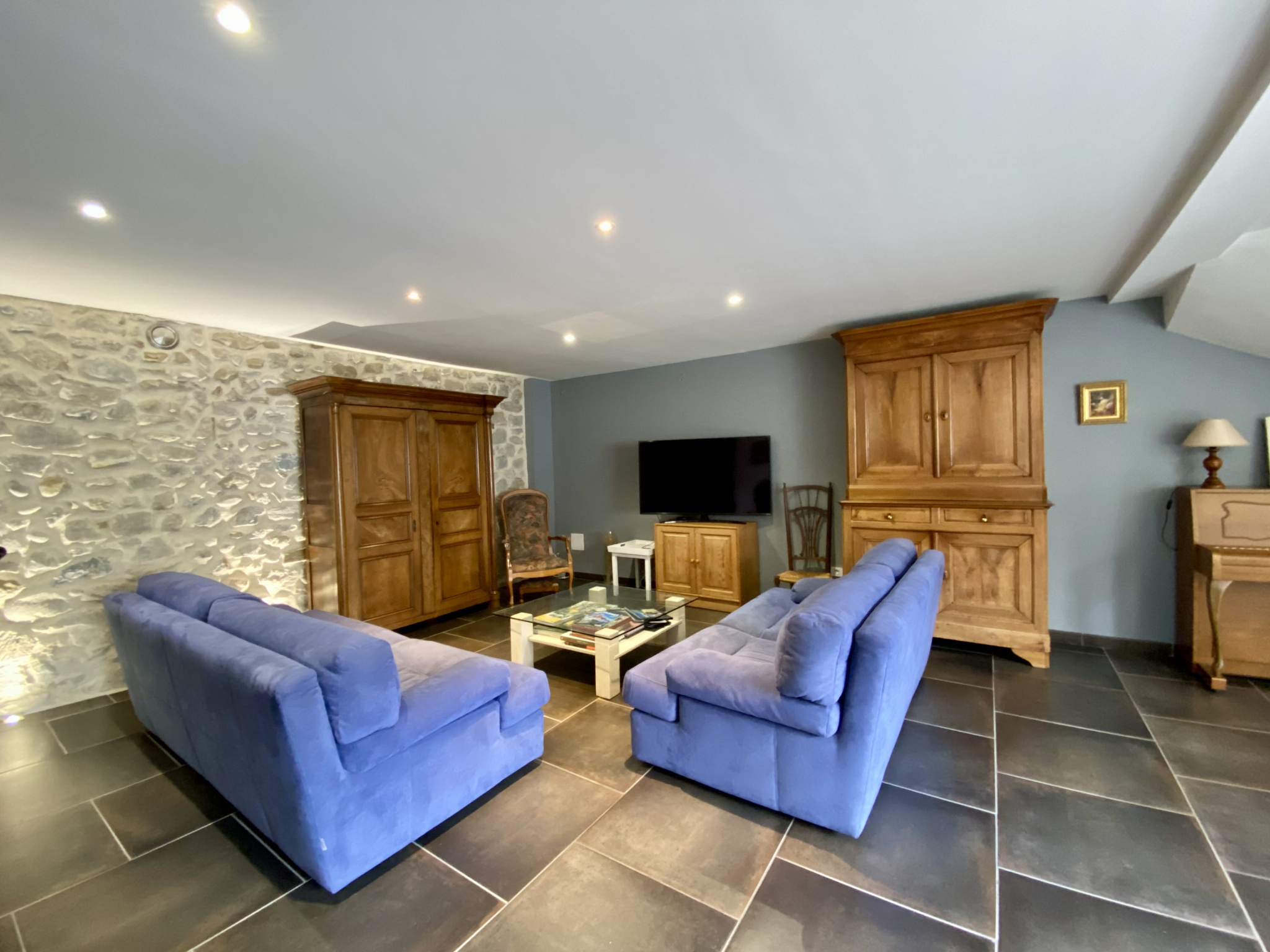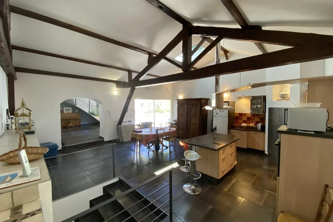 Séjour lumineux de 75 m2, pierres et poutres apparentes, cuisine ouverte, 2 terrasses sans vis à vis, 3 chambres, 3 salles d'eau, bureau, salle de sport et double garage carrelé.