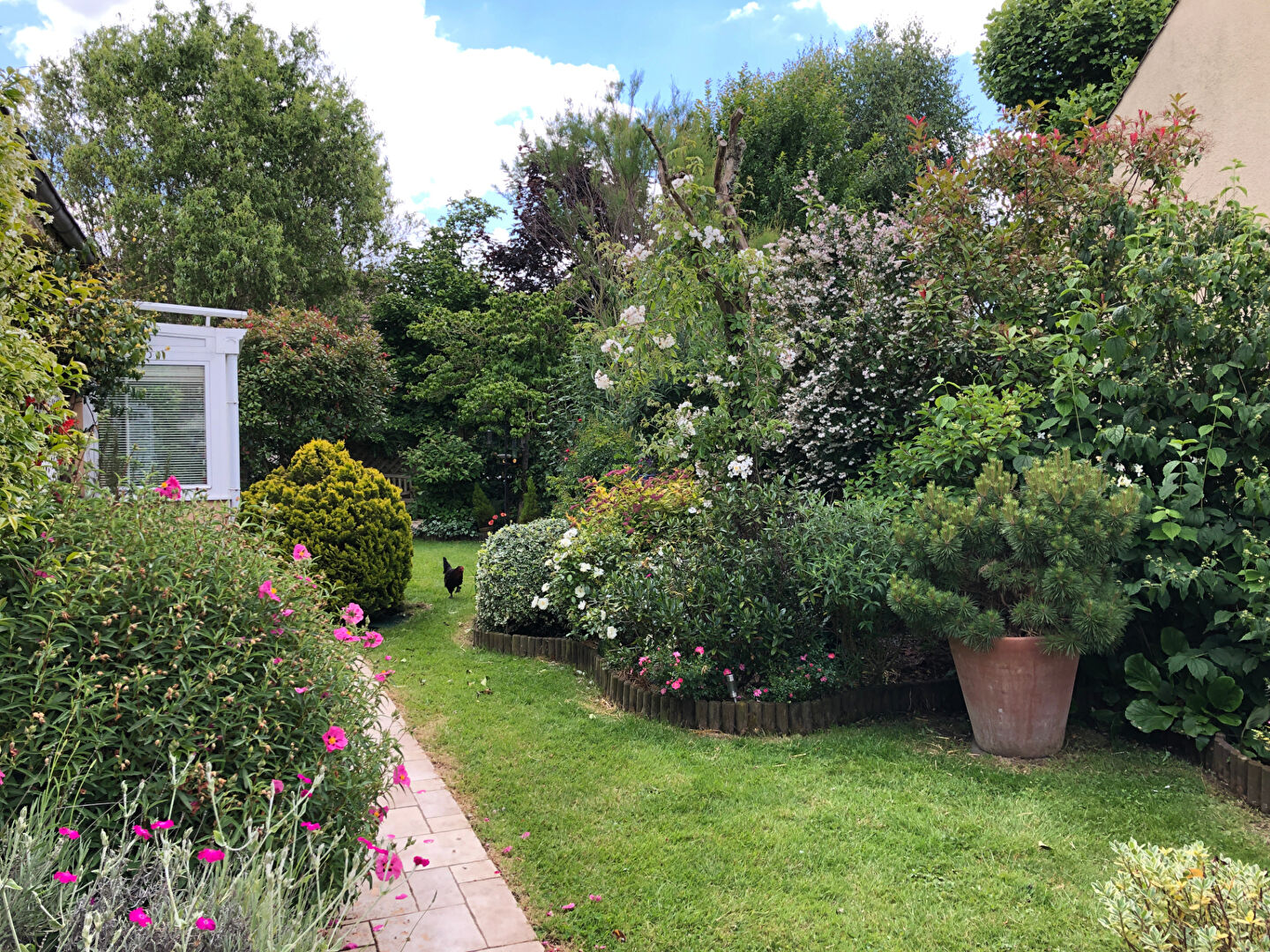 Haut Buc, dans résidence calme recherchée (faibles charges) , maison individuelle de 121,21m² carrez (144m² au sol) avec véranda et garage noyée dans joli jardin arboré et fleuri de 400m² environ comprenant : entrée avec vestiaire, séjour traversant avec cheminée ( insert) , chambre de plain-pied avec dressing, salle de douche avec WC et coin buanderie, cuisine équipée sur véranda sud, cellier avec cave, garage un véhicule. Etage : couloir desservant deux chambres avec placards, une troisième, un placard, une salle de bains avec WC. Une place de stationnement dans le jardin. Terrasse fleurie et ombragée, plusieurs abris de jardin. Agréable maison individuelle bien entretenue. VENDU (2.31 % honoraires TTC à la charge de l'acquéreur.) Copropriété de 50 lots (Pas de procédure en cours). Charges annuelles : 300 euros.