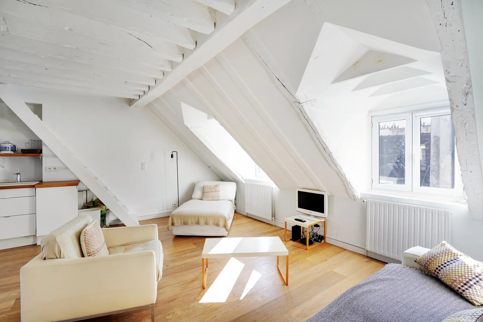 Au sixième et dernier étage, sans ascenseur, d'une jolie copropriété avec gardienne, typique du vieux Paris, Villaret Immobilier vous propose ce très bel appartement en duplex de 58 m2 de surface pondérée (45 m2 Carrez / 70m2 au sol) Ce bien, traversant, baigné de lumière, propose au premier niveau une grande pièce de vie de plus de 29 m2 avec une cuisine aménagée et équipée, une chambre parentale sur cour avec sa salle d'eau, une seconde salle d'eau et un wc complètent ce premier niveau. Les combles ont été aménagés en une seconde grande chambre de plus de 20 m2 au sol. Ce bien atypique a su conserver le charme de ses origines. Implanté au coeur de Paris: le Marais est à deux pas ainsi que les lieux de sorties et les commerces de la rue Montorgueil, ce duplex sera un parfait pied à terre ou premier achat.
