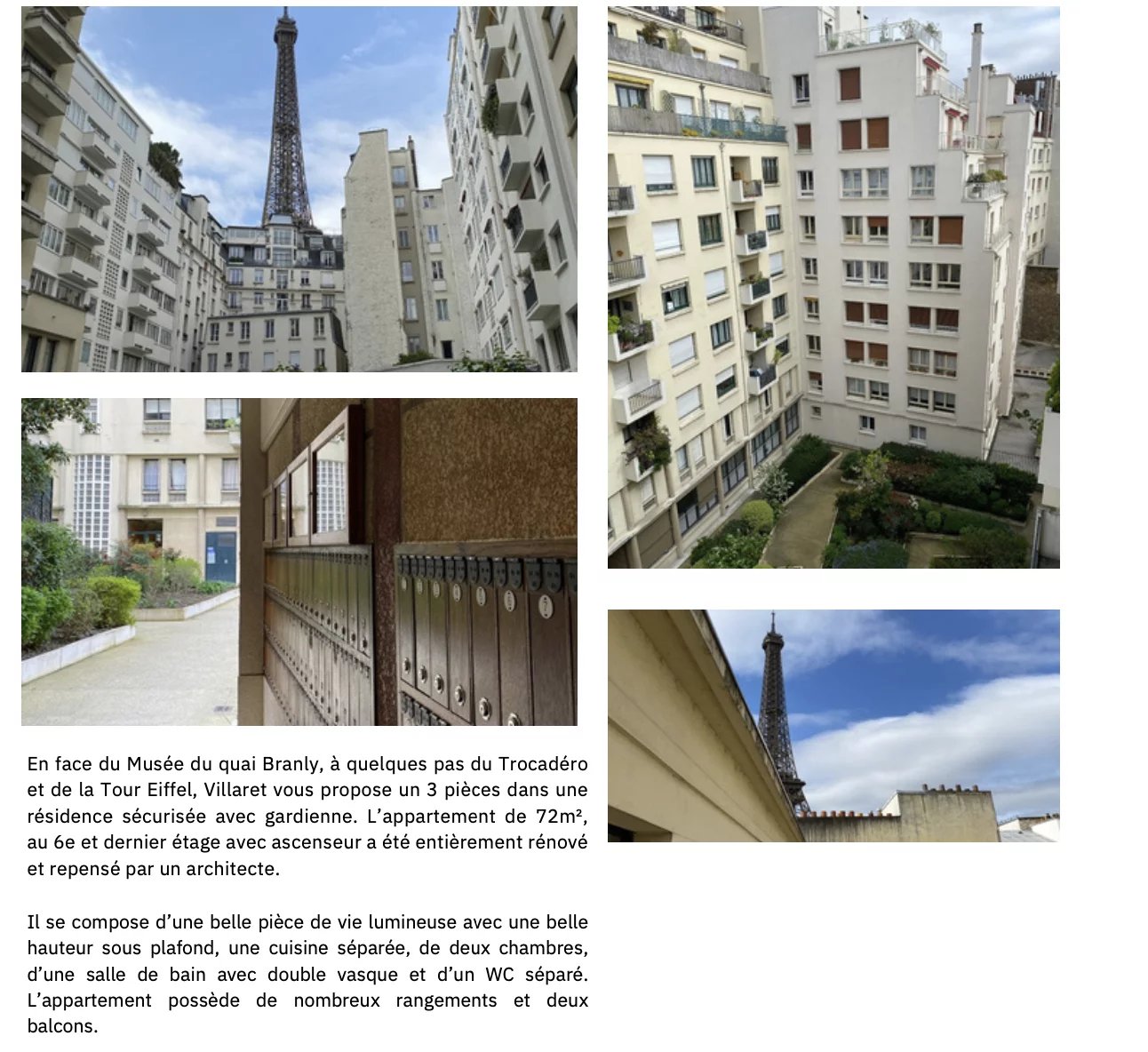 En face du Musée du quai Branly, à quelques pas du Trocadéro et de la Tour Eiffel. Dans une résidence de bon standing avec gardienne. Situé au 6ème et dernier étage avec ascenseur. Il se compose d'une belle pièce à vivre avec une belle hauteur sous plafond, d'une cuisine séparée, de deux chambres, d'une salle de bain avec double vasque et d'un wc séparé. L'appartement possède de nombreux rangements et de deux balcons. DPE C.