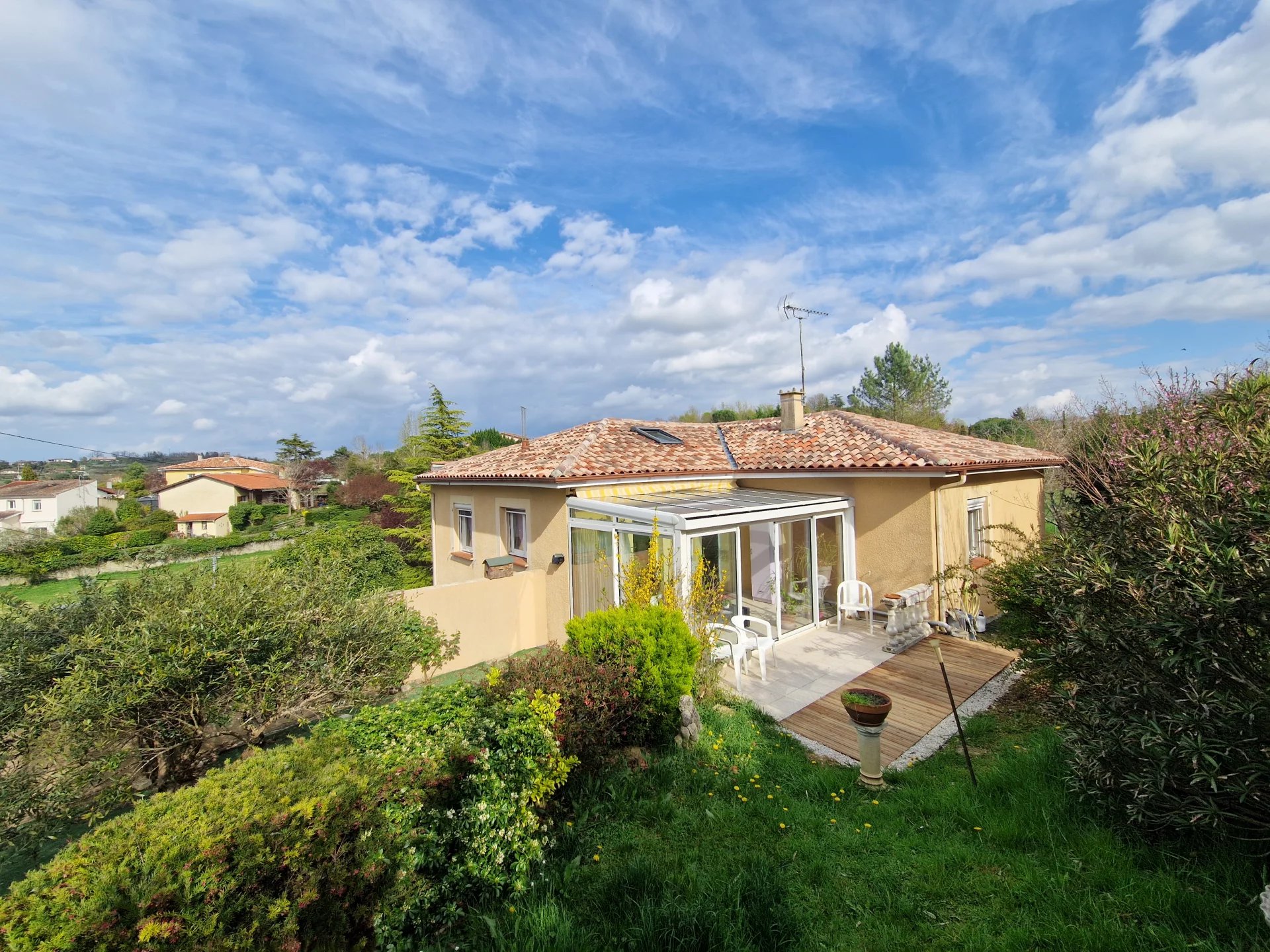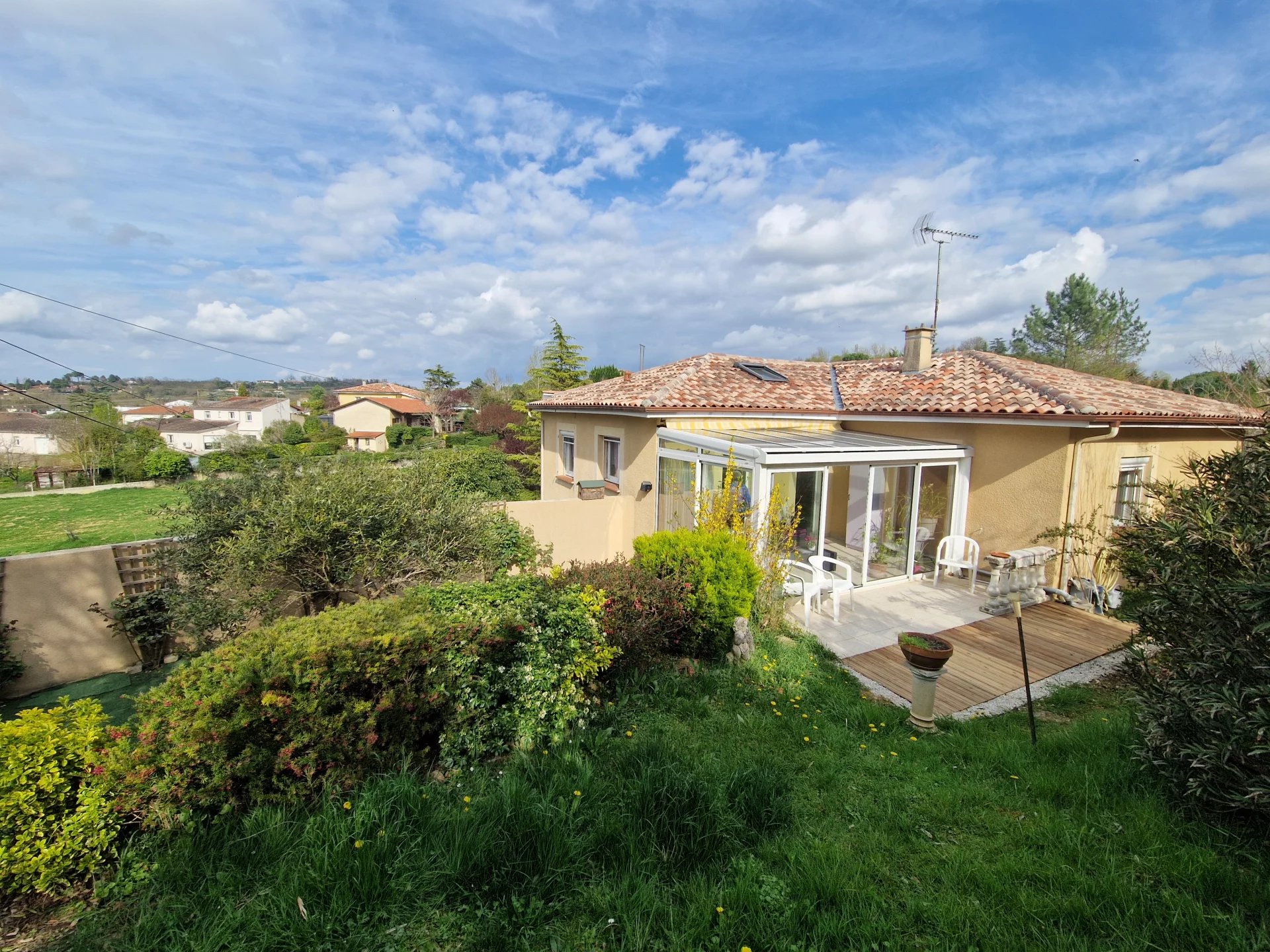 Auch, proche centre basse ville Maison T4 de plain pied avec sous-sol semi-enterré Environ 94m² habitables Agréable véranda communiquant sur la pièce de vie et la cuisine équipée, 3 chambres dont une avec dressing, salle d'eau avec douche à l'italienne, wc indépendant. Grand sous-sol avec garage et portail électrique, coin buanderie, cave. Chauffage central au gaz de ville. Volets électriques Jardin clôturé et arboré d'environ 500m².