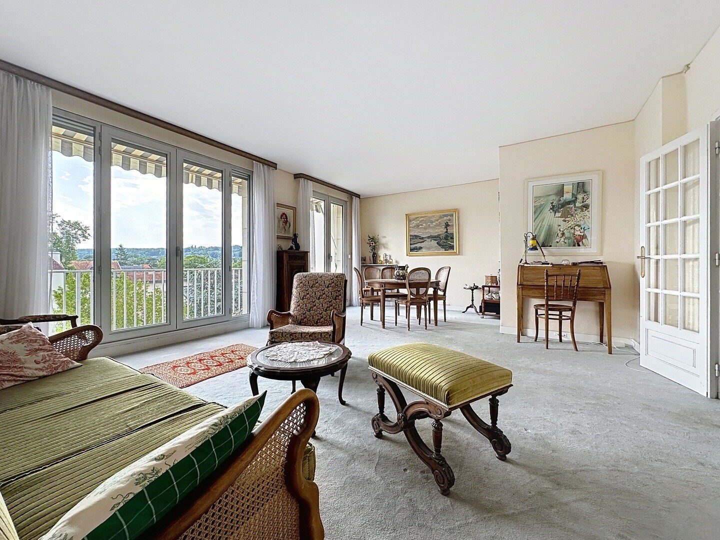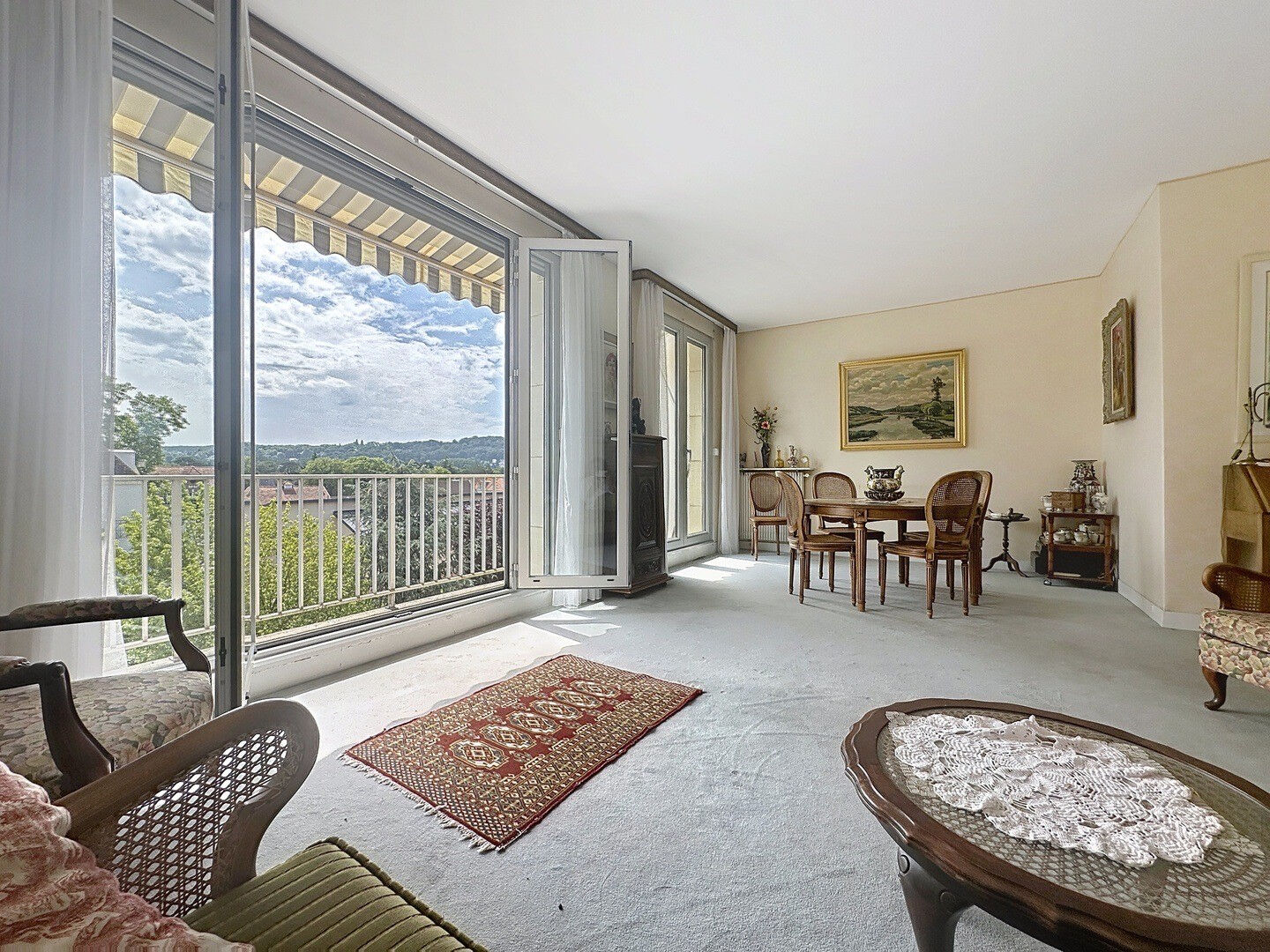Rare. Centre ville dans une petite rue calme, et au pied des commerces, bel appartement familial de 92 m² ,traversant est/ouest avec balcons au 3ème étage d'une résidence bien entretenue . Une entrée donnant sur un séjour-double orienté Est avec balcon et vue dégagée sur les coteaux de la Celle Saint Cloud , 3 chambres dont une avec salle d'eau et l'autre avec balcon ouest avec vue dégagée sur St- germain -en- laye, une salle de bains, des wc séparés , une cuisine séparée . Une cave et un très grand box de 40 m² complètent ce bien . Chauffage collectif . Fenêtres double vitrage en aluminium récentes .Volets électriques. Store électrique. Des Travaux de remise aux goûts du jour sont à prévoir . (3.92 % honoraires TTC à la charge de l'acquéreur.) Copropriété de 70 lots - dont 50 lots habitation. Charges annuelles : 5280 euros.