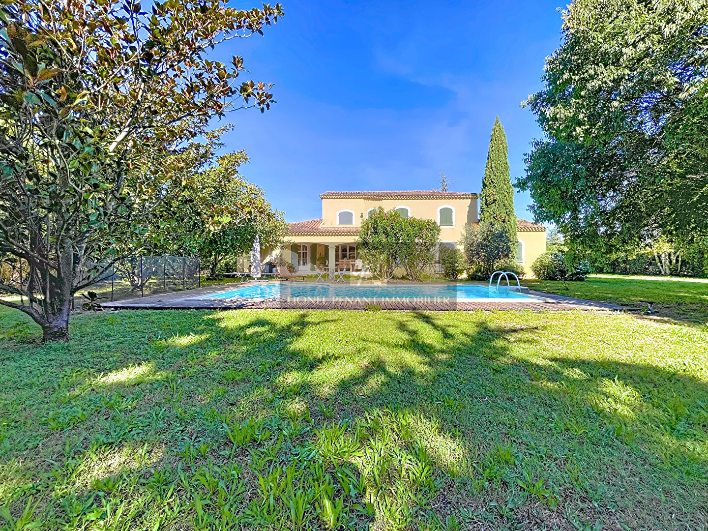 CAMPAGNE DE CARPENTRAS-CAROMB VILLA T6 205M² AVEC DOUBLE GARAGE, TERRASSE, PISCINE SUR 2500M² DE TERRAIN ARBORE. En fond d'impasse, dans un quartier hyper prisé pour son calme et la proximité immédiate de la nature, venez vous installer dans cette chaleureuse maison de construction traditionnelle de 1993. Dès la porte d'entrée franchie, vous contemplerez le superbe et ensoleillé espace extérieur. Au rez-de-chaussée, l'espace de vie d'une surface totale de 85m², entièrement exposé au Sud et ouvrant sur la terrasse par plusieurs baies vitrées, se décompose en cuisine aménagée et équipée, salle à manger, salon et salon décaissé. La suite parentale avec placard et salle d'eau privative possède son propre accès à la terrasse. Vous accédez à l'étage par un bel escalier en bois massif. A ce niveau, 3 chambres, dont 2 ouvrant sur un solarium, un bureau de 18m² qui saura se muer en espace de lecture ou encore en 5ème chambre, et une salle de bains avec douche, baignoire et double vasque. Côté pratique, 20m² de buanderie et de cellier en guise d'arrière cuisine, un garage et un abri voiture transformable en garage, 2 terrasses couverts au Sud et à l'Ouest, 1 wc indépendant par niveau. Côté confort, Construction sur vide-sanitaire, chauffage central fioul, possiblement évolutif en pompe à chaleur, x2 vitrage bois, volet bois, conduit de cheminée, forage, isolation des combles récentes, portail électrique, tout à l'égout. A l'extérieur, le parc est entièrement clôturé et arboré. L'espace piscine reçoit un bassin de 4,5 x 9m agrémenté d'une terrasse bois en Iroko, et entièrement protégée. Le PLU vous permet d'envisager de belles évolutions sur ce foncier: extension de l'existant, construction d'une seconde habitation indépendante, détachement de parcelle à bâtir (sous réserve de l'obtention des autorisations d'urbanisme). C'est alors tous vos projets familiaux ou d'exploitation en location saisonnière qui peuvent trouver leur place ici. EMPLACEMENT, VOLUMES, POSSIBILITES D'EVOLUTION, PARC... ELLE A TOUS LES ATOUTS POUR VOUS SEDUIRE! TF: 3255 euros Carpentras, Mazan Aubignan, Loriol du Comtat, Sarrians, Bedoin, Le Barroux, Pernes les Fontaines.