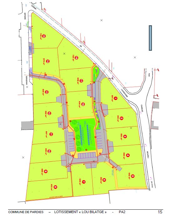 Pardies centre, situé à 10mm de la sortie Artix de l'autoroute Bayonne Pau Toulouse et Bordeaux, près de l'aéroport international Pau-Pyrénées, le village de Pardies est une porte ouverte pour l'aventure & le loisir en Béarn. A une 40mm des pistes de ski des Pyrénées et 1h des plages de l'Océan Atlantique, à la périphérie de Pau, dans un environnement calme et à proximité de toutes les commodités, le lotissement 'Lou Bilatge' à Pardies propose 18 lots de terrain à bâtir, libres de constructeurs, d'une surface de 581 m2 à 933 m² à partir de 48 000 euros. Les terrains sont entièrement viabilisés : Eau potable, Electricité, Téléphone, Tout à l'égout. Renseignez vous sans tarder.