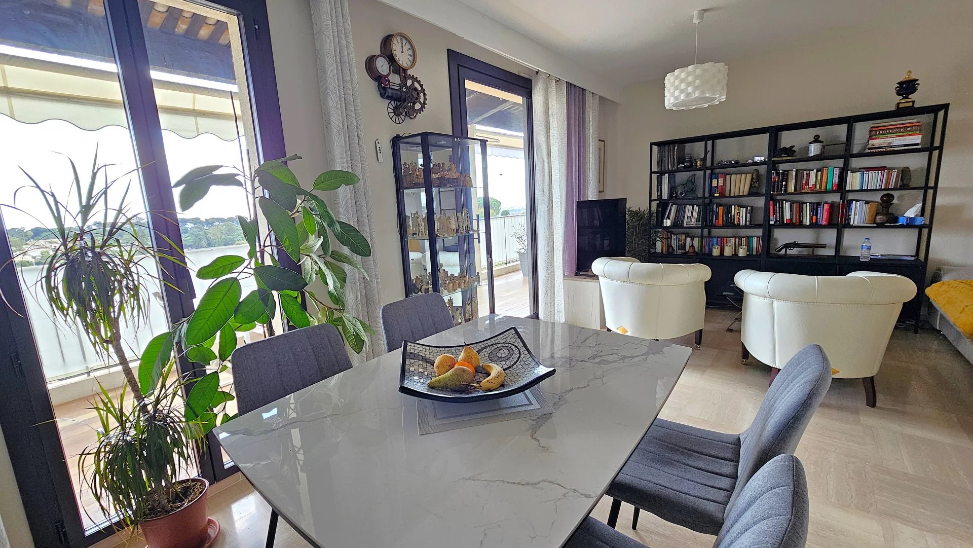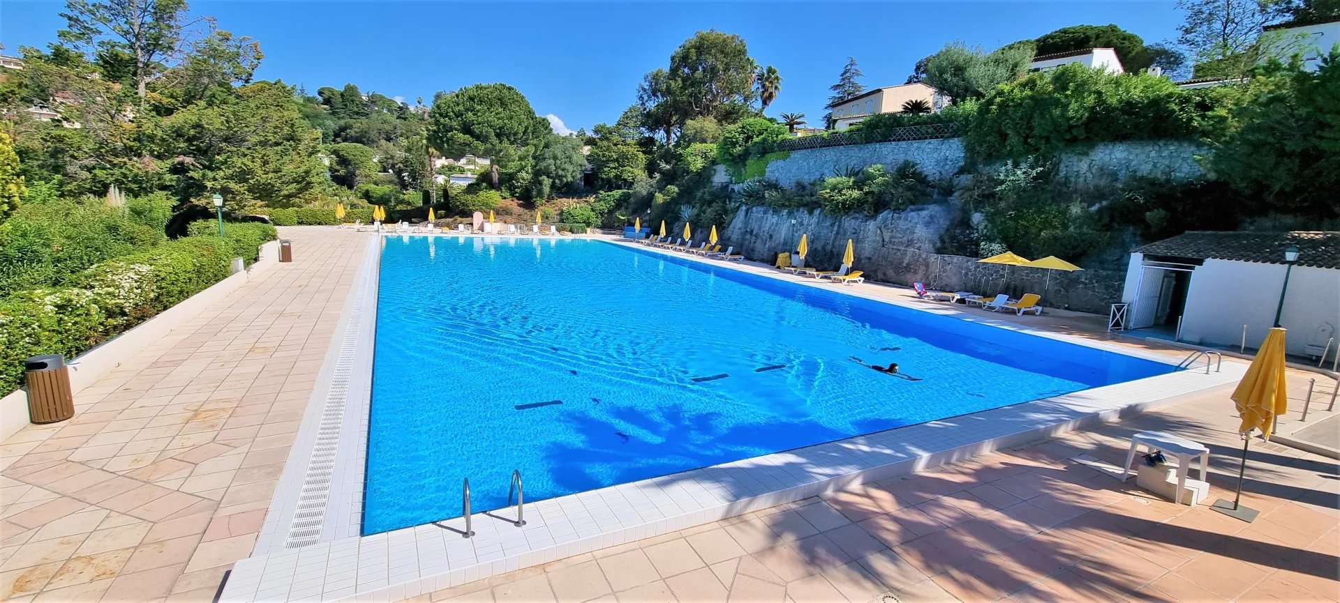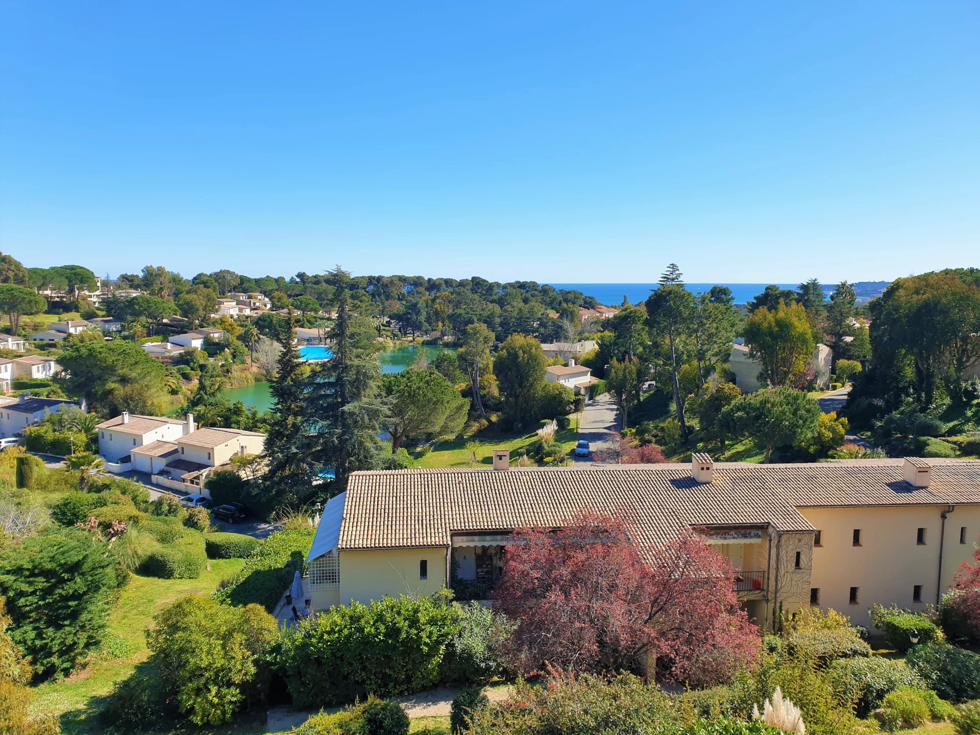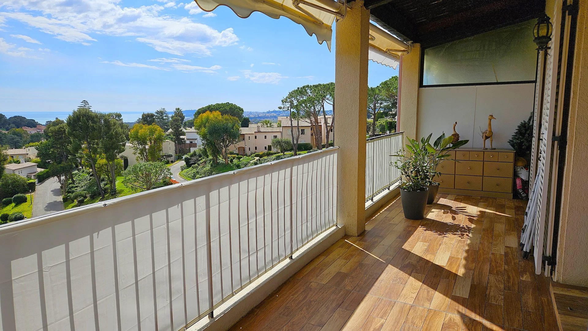 VENDU PAR L'AGENCE Très belle vue en position dominante sur le Domaine et la mer. Idéalement situé, au calme, dans un hameau recherché proche village, appartement 3 pièces traversant de 63 m², (grand 2 pièces transformé), situé en dernier étage. Après quelques marches (demi étage), vous accédez à une première terrasse de 10 m² menant à l'entrée. L'appartement offre un séjour lumineux ainsi qu'une chambre de 12 m², tous deux ouverts sur une magnifique terrasse de 19 m² exposée Sud Est, offrant une vue dégagée sur le Domaine et jusqu'à la mer. La cuisine est indépendante et entièrement équipée. Elle bénéficie d'une belle luminosité naturelle grâce à une verrière intérieure ouvrant sur le séjour, apportant à la fois clarté et convivialité. Une seconde chambre/bureau avec placards, une salle de bains/ buanderie, une salle d'eau et des toilettes invités complètent ce bien. Climatisation réversible, stores électriques neufs, ouvrants récents, chauffe eau neuf. Nombreuses places visiteurs. Idéalement situé entre Cannes et Nice (accès autoroutes en moins de 5 minutes), à proximité des plages et de toutes commodités, ce Domaine sécurisé s'étend sur 130 hectares de parc arboré sur lequel se répartissent 11 hameaux. Vous y trouverez un restaurant Club House, des courts de tennis, une piscine Olympique, des commerces et une école maternelle. Bien soumis au statut de la copropriété. Charges générales annuelles courantes : 3.600€/an soit 260€/mois. Nombre de lots: en cours. Procédures en cours : 0. Honoraires d'agence inclus de 5% à la charge de l'acquéreur. Les informations sur les risques auxquels ce bien est exposé sont disponibles sur le site Géorisques : georisques.gouv.fr.