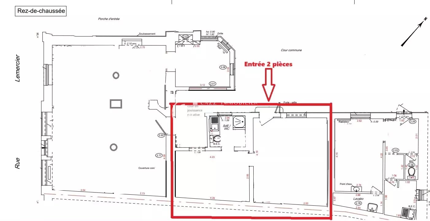 26 rue Lemercier (quartier Batignolles) - Au sein d'une magnifique et grande cour (pavée et arborée), profite d'un calme olympien - Ce 2 pièces de 37m² à rénover (en cours de curage), au fort potentiel, à un accès indépendant depuis la cour - Actuellement, il est composé d'une porte d'entrée vitrée + fenêtre pour le séjour/cuisine (sans vis à vis), une chambre avec fenêtre sur courette, une salle d'eau avec wc (fenêtre) - Charges 141€/mois - Chauffage électrique