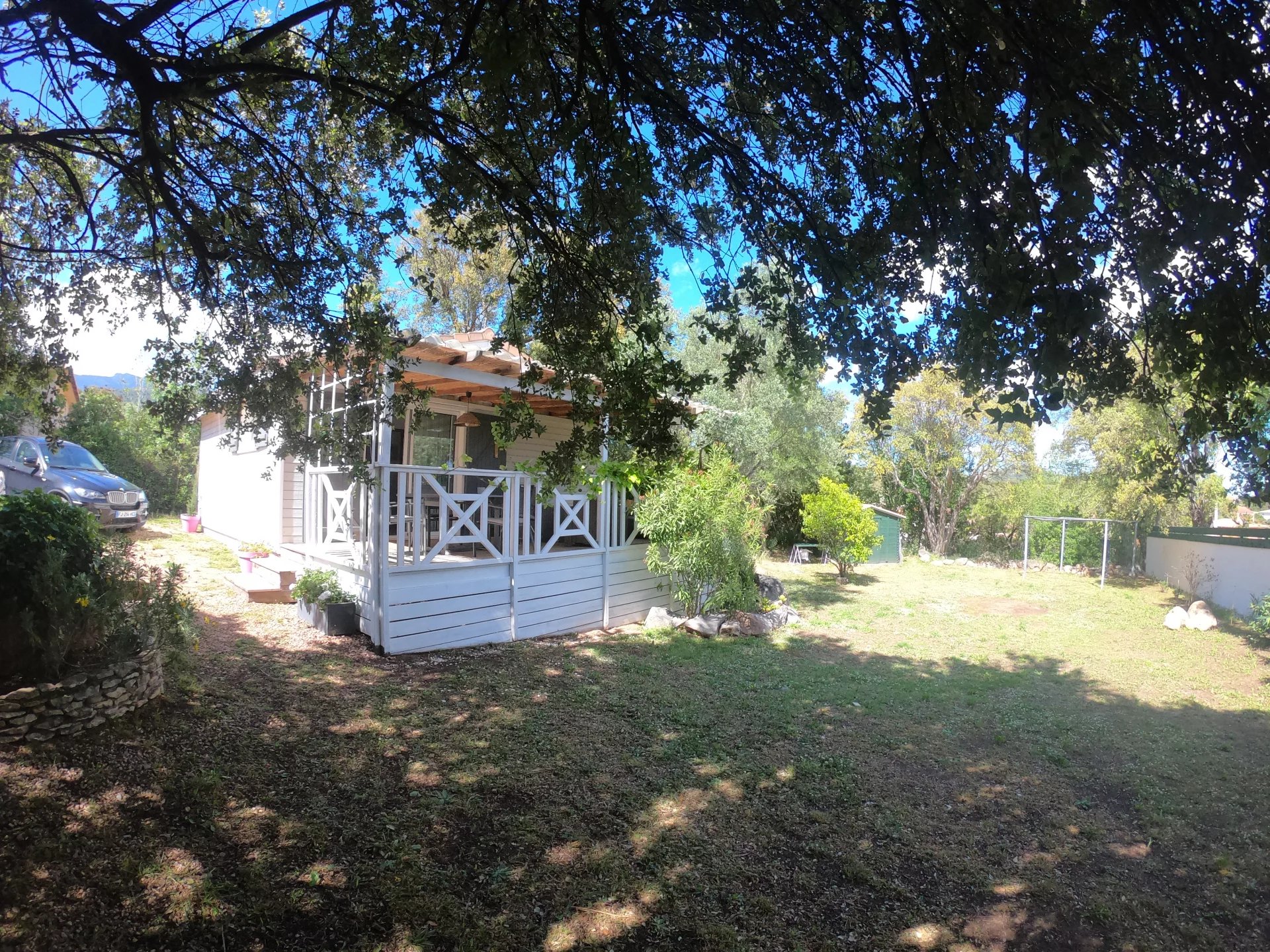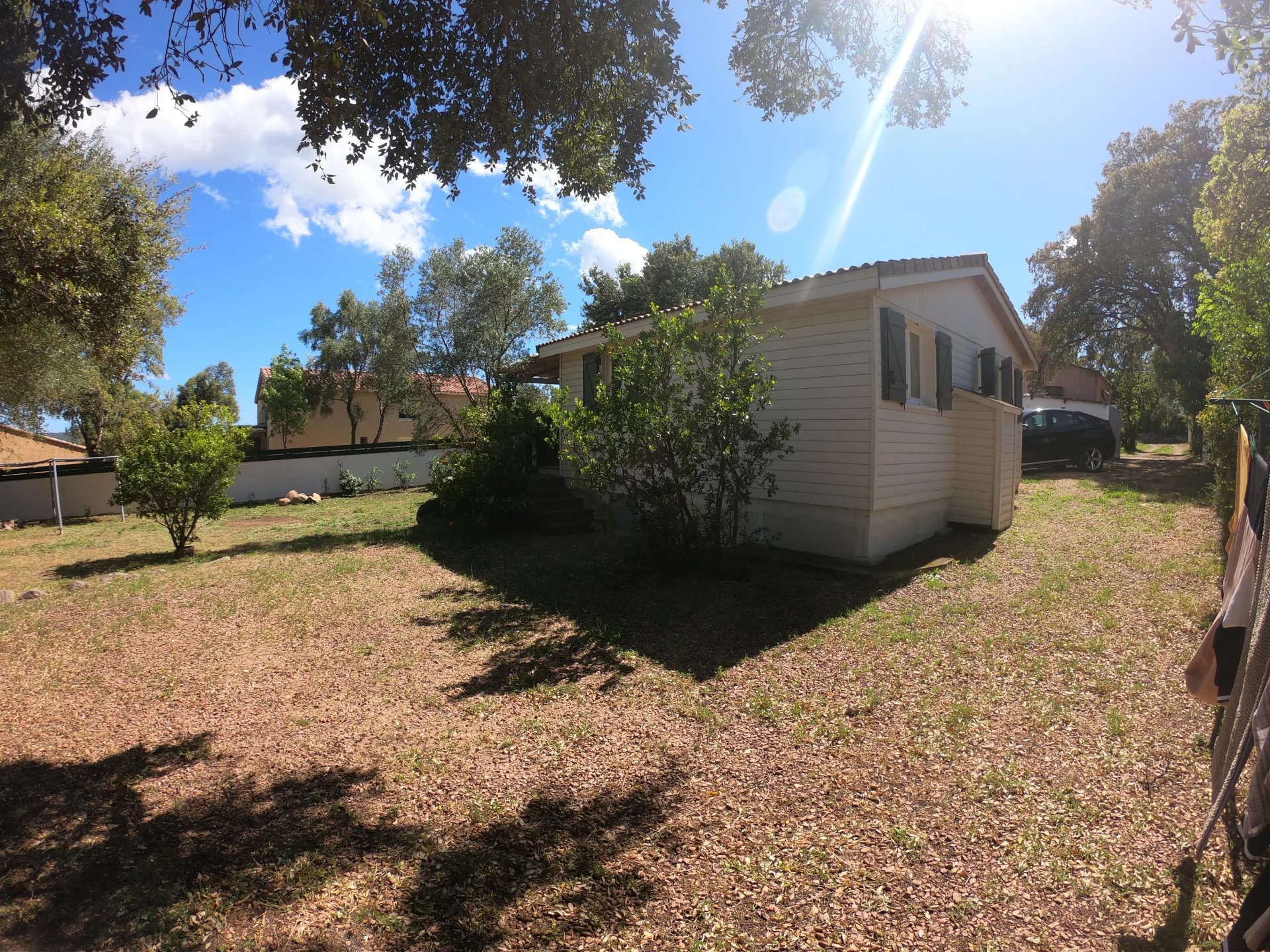 EXCLUSIVITE VILLA 3P en structure bois Terrasse couverte de 20M2 sur un terrain plat entièrement clos avec un cabanon et portail de 800m2 Exposée Sud EST Possibilité de d extension de 30% (Cos de 15% avoir avec le nouveau PLU) Dispose d'une climatisation, une cuisine équipée et aménagée ouverte sur le séjour, 2 chambres avec placards, une SDE avec WC laissez-vous charmer par cette maison chaleureuse Située à 10 minutes du centre de Porto Vecchio et des plus belle plages A proximité des commerces