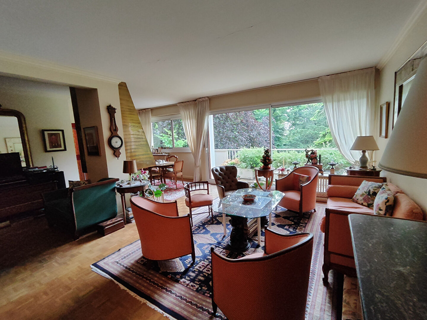 Dans une résidence de standing, au coeur d'un ravissant Parc arboré avec court de tennis et bâtisse historique, bel appartement 5 pièces entièrement parqueté au 3ème et dernier étage, en bon état général, avec quelques rafraîchissements à prévoir, dans la verdure, sans vis-à-vis, 3 chambres, possibilité 4. Entrée avec placards, vaste séjour avec cheminée de 39m² donnant sur un beau balcon, cuisine aménagée avec coin repas ouvrant sur une loggia, dégagement avec nombreux placards, 3 chambres, salle d'eau avec wc, salle de bains avec wc. cave et parking double en sous-sol. Double vitrage sauf 2 chambres. A 5mn du tram 13 pour Saint Germain en Laye RER A et son Lycée international, et à 15mn de la gare ligne L pour Paris Saint Lazare ou la Défense. Ecoles maternelles et élémentaires à 12mn, centre -ville et son marché à 6mn à pied. (3.50 % honoraires TTC à la charge de l'acquéreur.) Copropriété de 250 lots. Charges annuelles : 6377 euros.