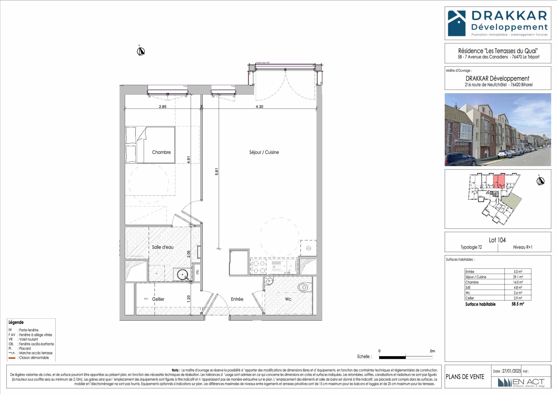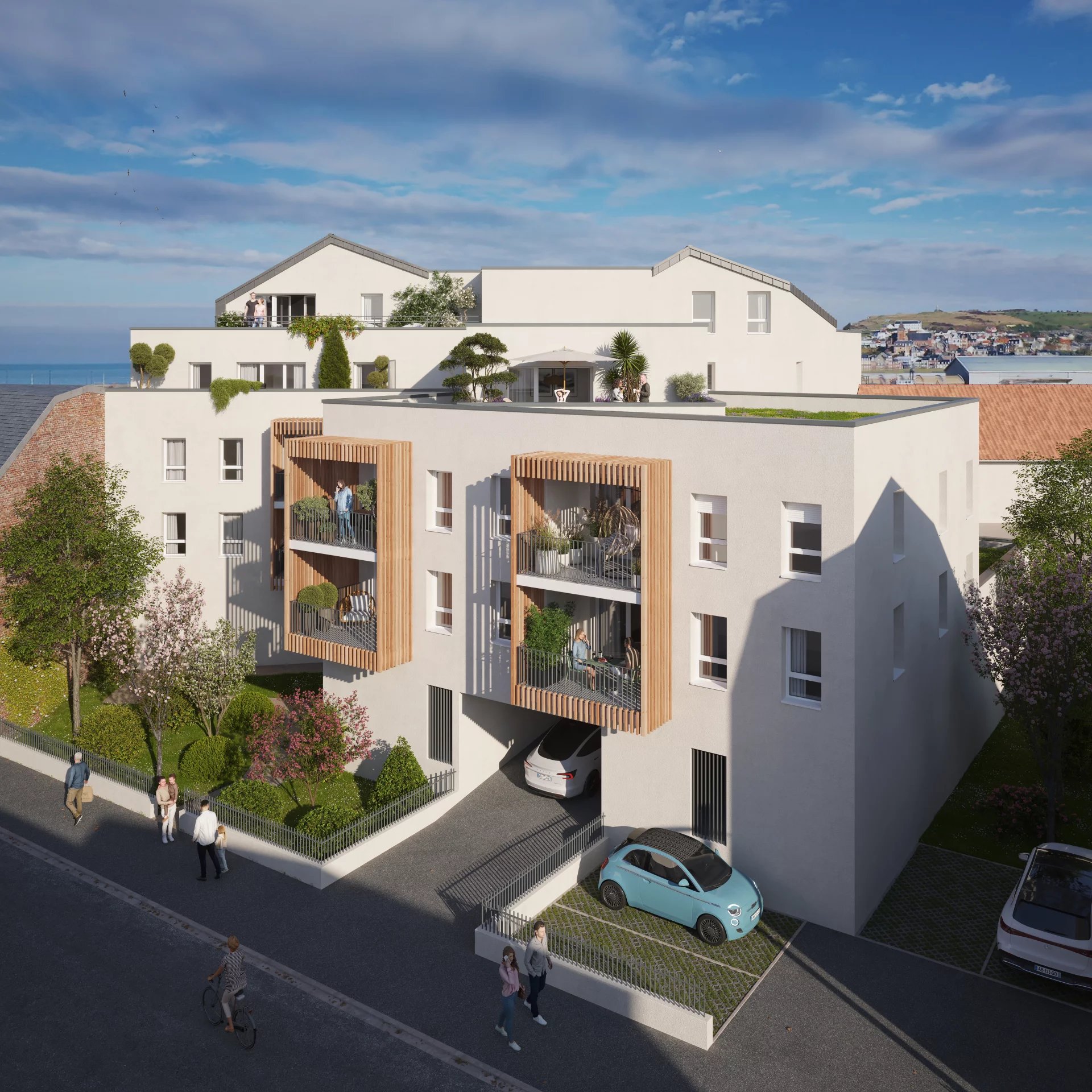 Drakkar Développement vous propose un bel appartement de type T2 de 58,5 m², situé au 1er étage avec ascenseur d'une résidence neuve au Tréport. Il se compose d’un grand séjour avec bow-window et cuisine ouverte de 29,1 m², d’une chambre spacieuse de 14 m², d’une salle d’eau moderne, WC suspendus, d’un cellier et d’un extérieur privatif (bow-window selon configuration). Idéal pour y vivre à l’année : volumes confortables, belle luminosité et prestations modernes. Chauffage individuel par pompe à chaleur avec plancher chauffant, parquet contrecollé, spots encastrés dans les pièces d’eau… tout est pensé pour votre confort. Accès sécurisé par vidéophone et Vigik, parking et local vélo. Ce logement fait partie de la résidence neuve Les Terrasses du Quai, composée de seulement 21 appartements, située en plein cœur du Tréport, entre le Quai de la Retenue et l’Avenue des Canadiens. Conforme à la réglementation RE2020, la résidence offre : Ascenseur Accessibilité PMR Chape acoustique (norme NRA) Local vélos Parking privatif Espaces extérieurs pour chaque logement Emplacement idéal : commerces, port, plage et gare accessibles à pied. Plusieurs logements sont disponibles, du T2 au T4, pour des surfaces allant de 51m2 à 86m2 ! Pour plus d’informations, contactez-nous vite !