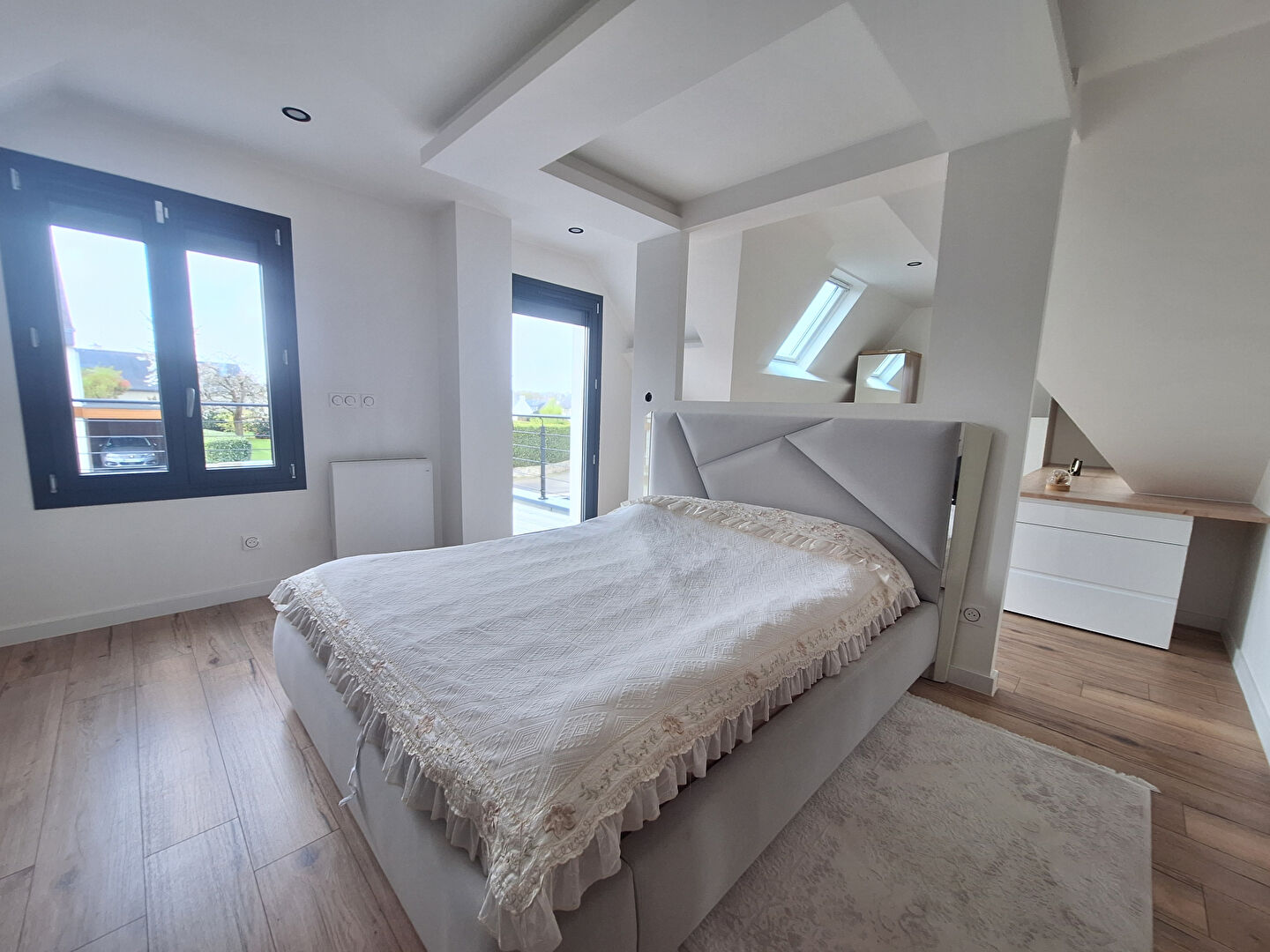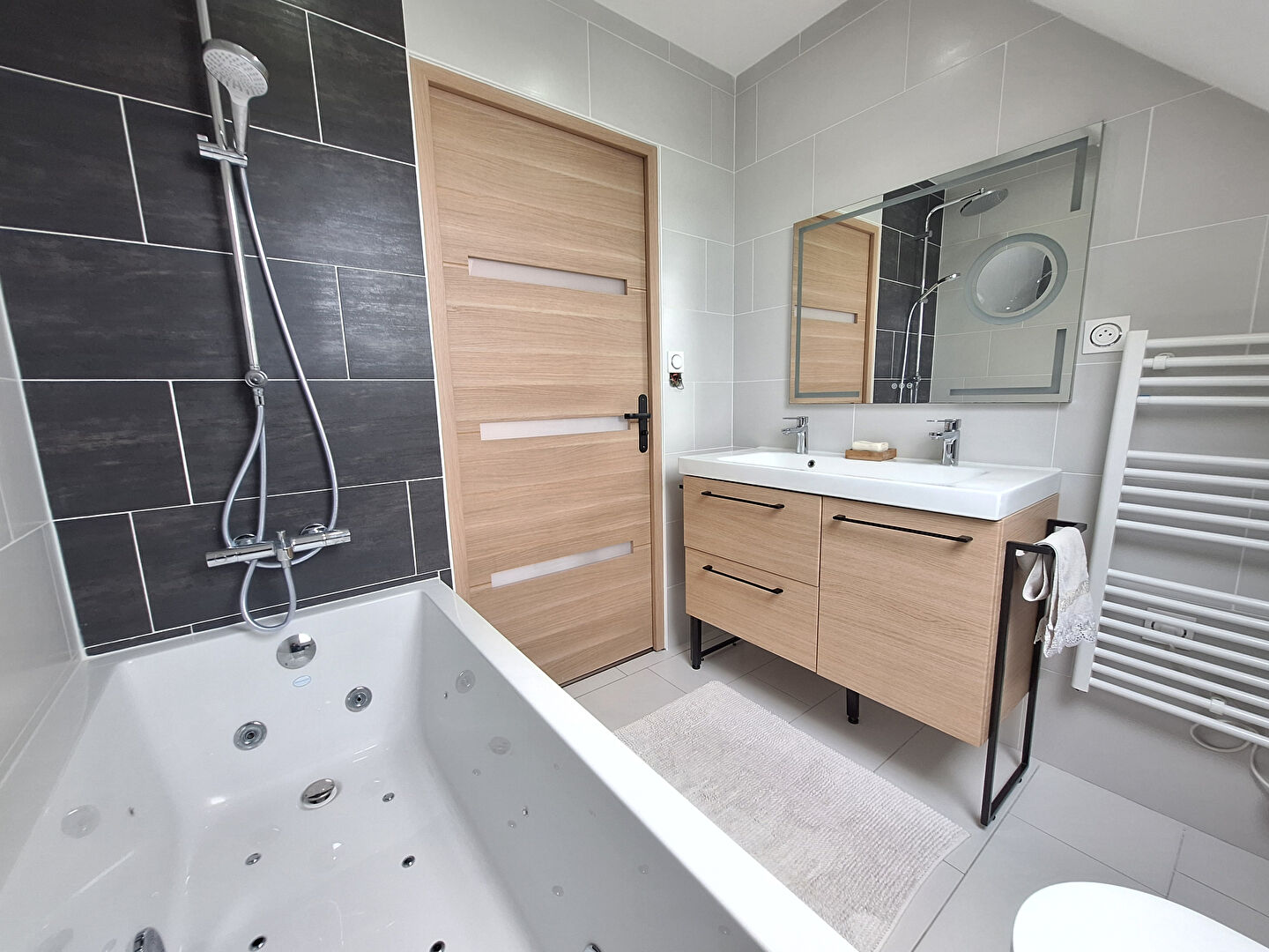 ACCÈS CONSEIL IMMOBILIER vous présente cette belle maison traditionnelle entièrement rénovée en 2021, édifiée sur un terrain de 610m² et distribuée comme suit: Au rez-de-chaussée: Une entrée, un salon-séjour avec poêle à granulés, une extension comprenant une véranda, une cuisine aménagée et équipée, une chambre, salle d'eau/WC. Deux garages avec portails motorisés. A l'étage: Palier distribuant trois chambres dont une avec espace dressing et accès terrasse exposée SUD, et salle de bains avec WC. A l'extérieur: Stationnements en enrobé. Jardin paysagé entièrement clos. Terrasse avec pergola. BELLES PRESTATIONS. MAISON TRÈS LUMINEUSE. PROCHE COMMERCES ET ÉCOLES A PIEDS. (3.70 % honoraires TTC à la charge de l'acquéreur.)