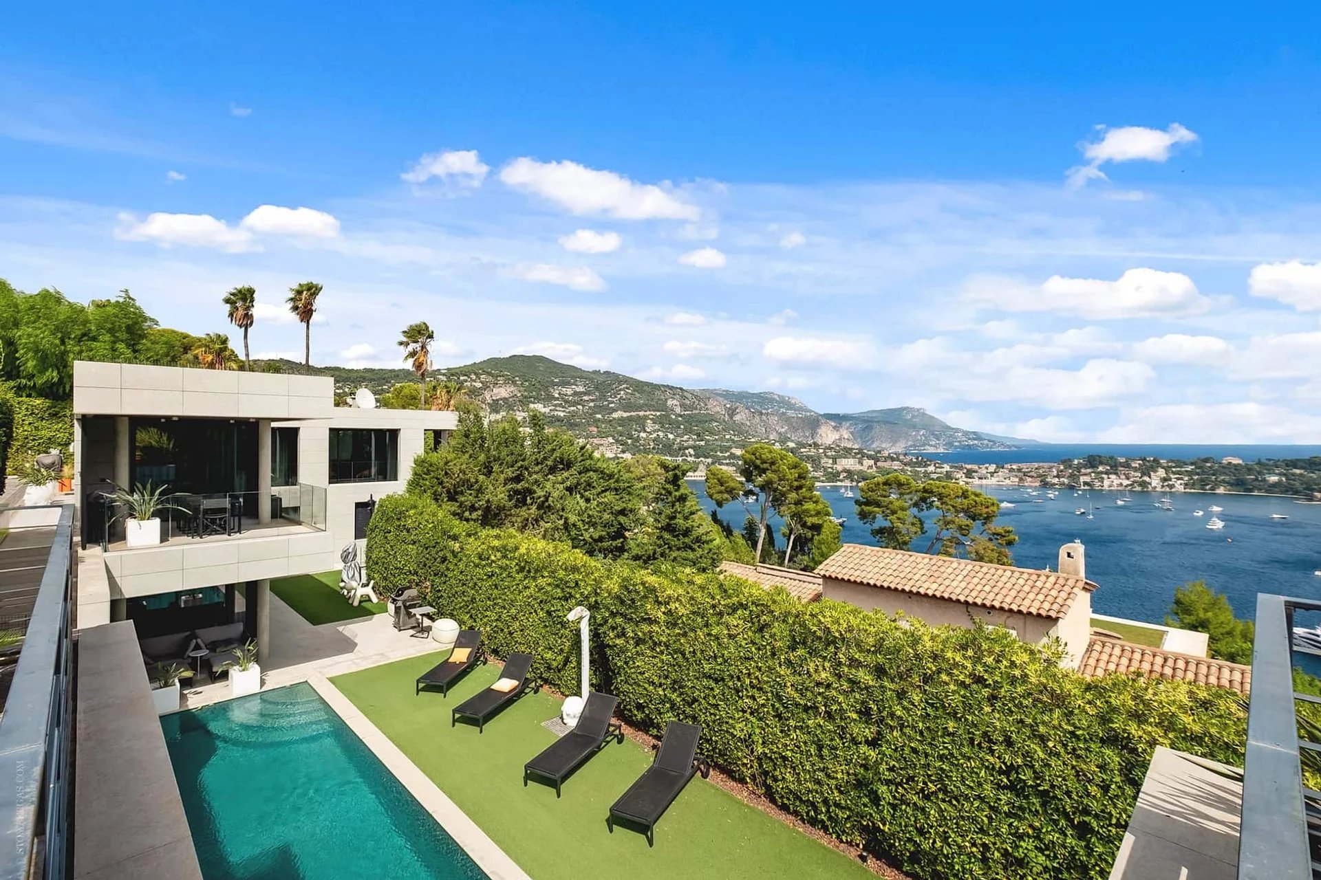 Idéalement située dans le prestigieux quartier de Mont Boron proche de Cap Ferrat et bénéficiant d'un emplacement privé, cette luxueuse villa moderne d'environ 300 m² est présentée en excellent état. Tout les travaux sont réalisé avec des matériaux de haut gamme et sont fini en 2019. La propriété comprend un spacieux, lumineux salon avec une splendide vue panoramique, une cheminée design et larges terrasses, une cuisine équipée haut de gamme et 3 chambres. Un appartement indépendant et entièrement équipé de 45 m². La villa est édifiée sur un terrain joliment arboré de 1600 m² environ avec une piscine 15/5 avec une système de nettoyage par ionisation avec argent et cuivre. Un garage, un grand parking pour 8 véhicules, cave à vin, un jacuzzi sur la terrasse et un spa complètent cette villa californienne.