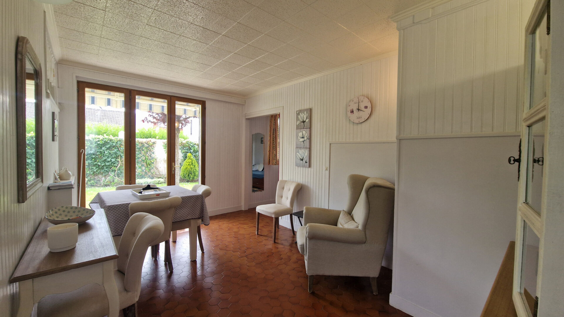Proche du centre ville et de la plage, dans un cadre verdoyant, une maison de 7 pièces principales, comprenant : une chambre au rdc, une salle de bains wc, une cuisine, une salle à manger, un salon, au 1er étage : 3 chambres, une salle de bains. Un jardin de 700 m2 avec garages. (4.53 % honoraires TTC à la charge de l'acquéreur.)