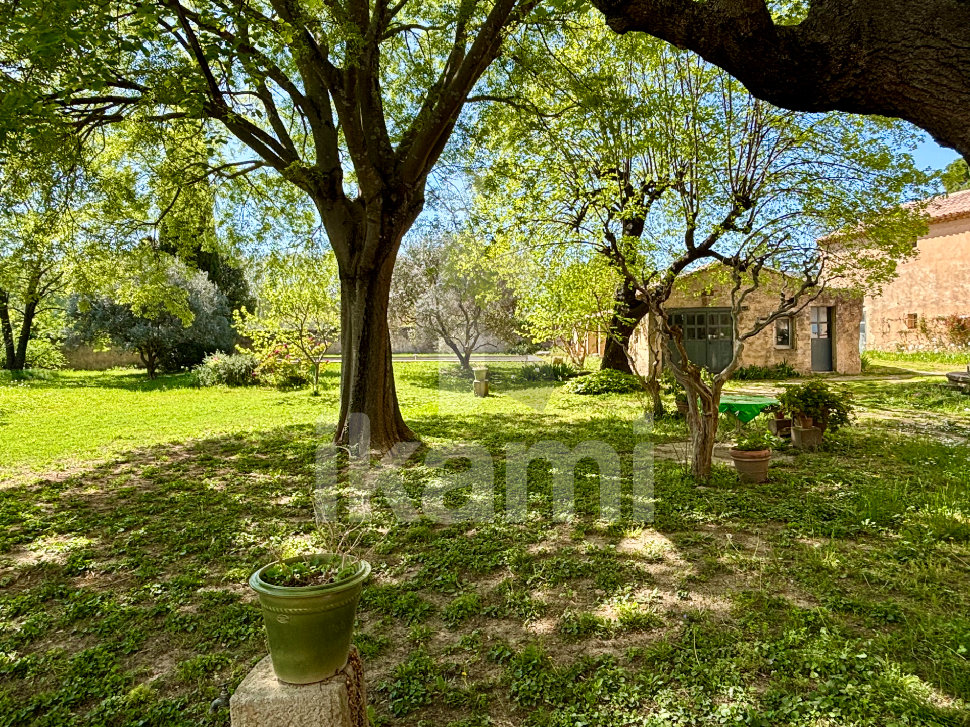 Son parc clos de plus de 2200 m2, arboré de multiples essences méditerranéennes, invite à ralentir. Ici, tout évoque le calme et les beaux jours : les déjeuners sous les arbres, les rires autour de la piscine, les apéritifs prolongés sur la terrasse. La bâtisse impose sa présence avec élégance. Une façade de caractère dotée d'une exceptionnelle terrasse couverte à plancher voûtain, impressionnante, soutenue par d'authentiques piliers en fonte des anciennes mines d'Alès ; un détail architecturale qui souligne le chic de la demeure.