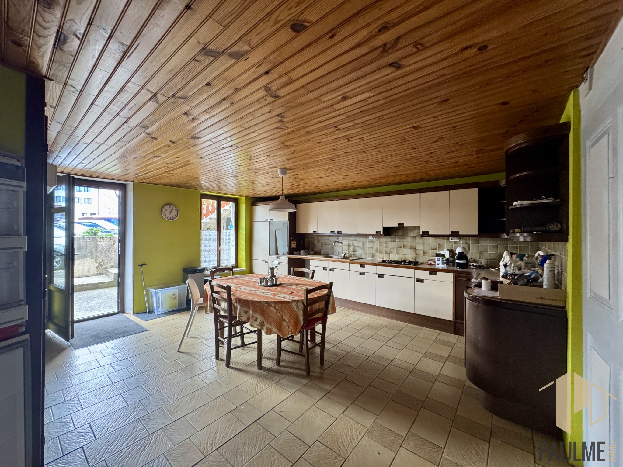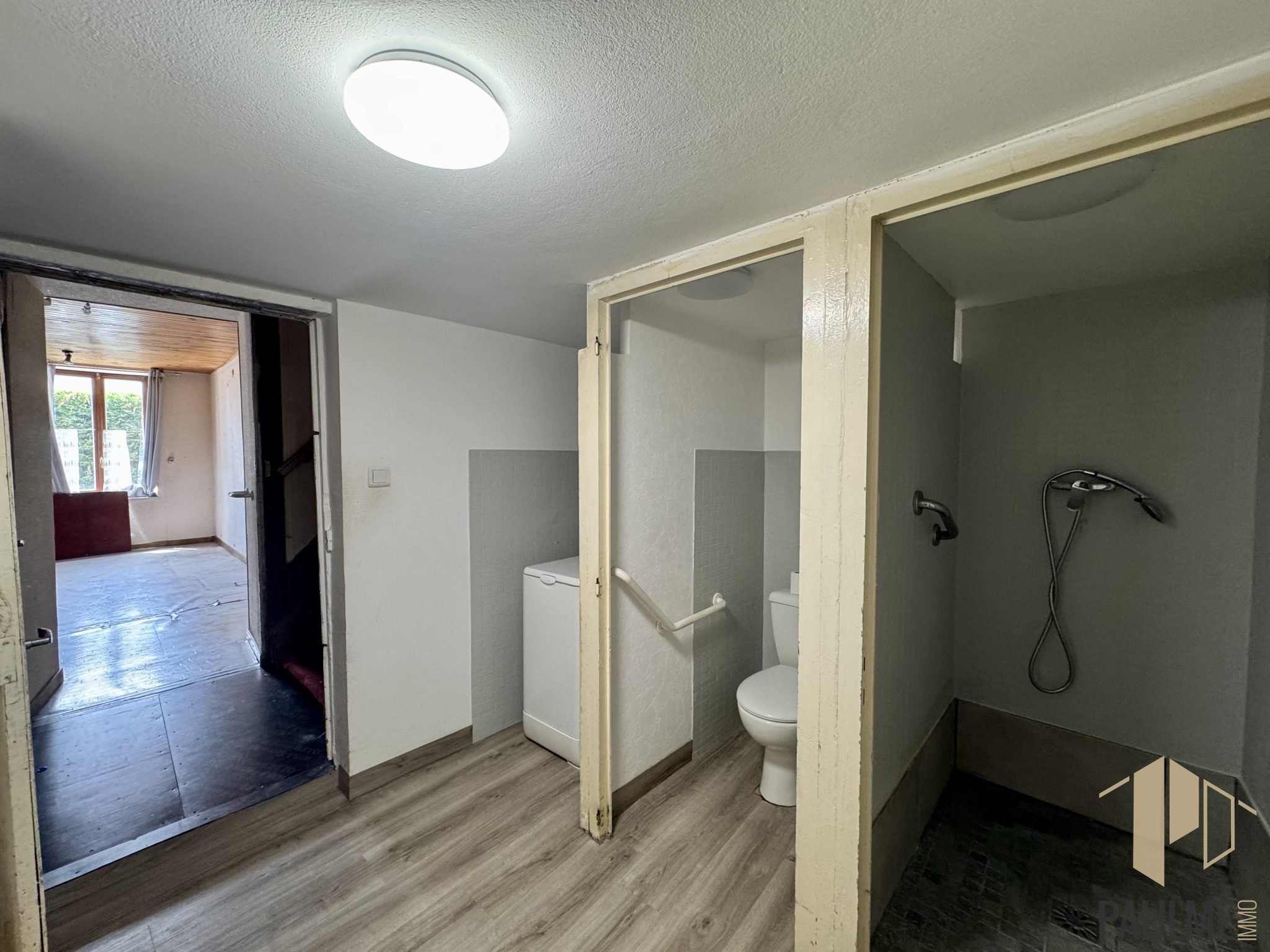 Il se compose comme suit : une entrée donnant sur la grande cusine avec cellier de 26 m2, un espace de vie d'environ 35 m2, une chambre ainsi qu'une salle d'eau avec WC et raccordement lave-linge.