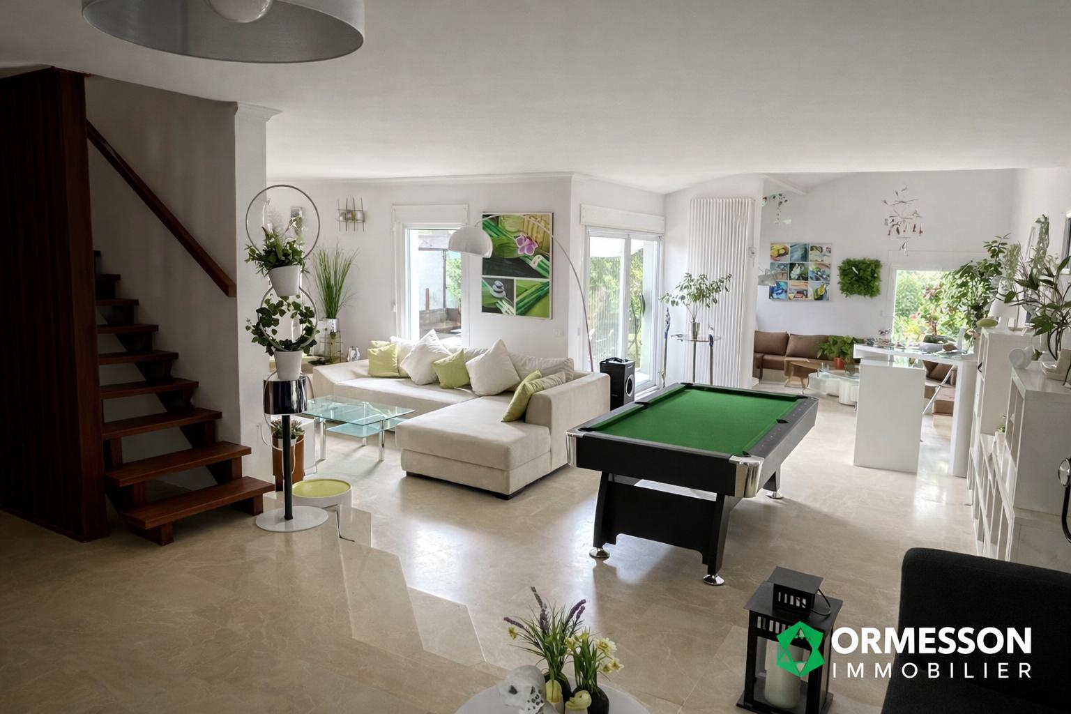 Ormesson Immobilier vous présente cette maison d'architecte de plain pied d'une superficie 180 m², à l'abri des regards, située dans un quartier recherché, à proximité de la gare de la Barre Ormesson. La maison se compose d'une entrée ouvrant sur un vaste séjour baigné de lumière, prolongé par un coin salle à manger et un espace cosy avec cheminée. La cuisine, entièrement équipée, est indépendante. Un WC séparé ainsi que de nombreux rangements complètent ce niveau. L'architecte a habilement travaillé les différents niveaux pour délimiter les espaces et offrir une circulation fluide. A l'étage, un palier dessert cinq chambres, dont une suite parentale avec salle d'eau, WC et balcon privatif. Une seconde salle d'eau ainsi qu'un WC indépendant complètent cet espace nuit. Un sous-sol de plus de 100 m² vient compléter ce bien, offrant un vaste garage pouvant accueillir deux véhicules, une cave à vin, une buanderie/chaufferie ainsi qu'une grande salle de jeux. Côté extérieur, vous profiterez d'un grand jardin arboré et sans vis-à-vis de plus de 1 200 m², agrémenté d'une petite dépendance d'environ 20 m². Le bien bénéficie également d'une seconde entrée, permettant de rendre la dépendance totalement indépendante si souhaité. A 5 minutes à pied de la gare de La Barre - Ormesson. Double vitrage, fibre. Venez visiter cette magnifique demeure remplie de surprises.