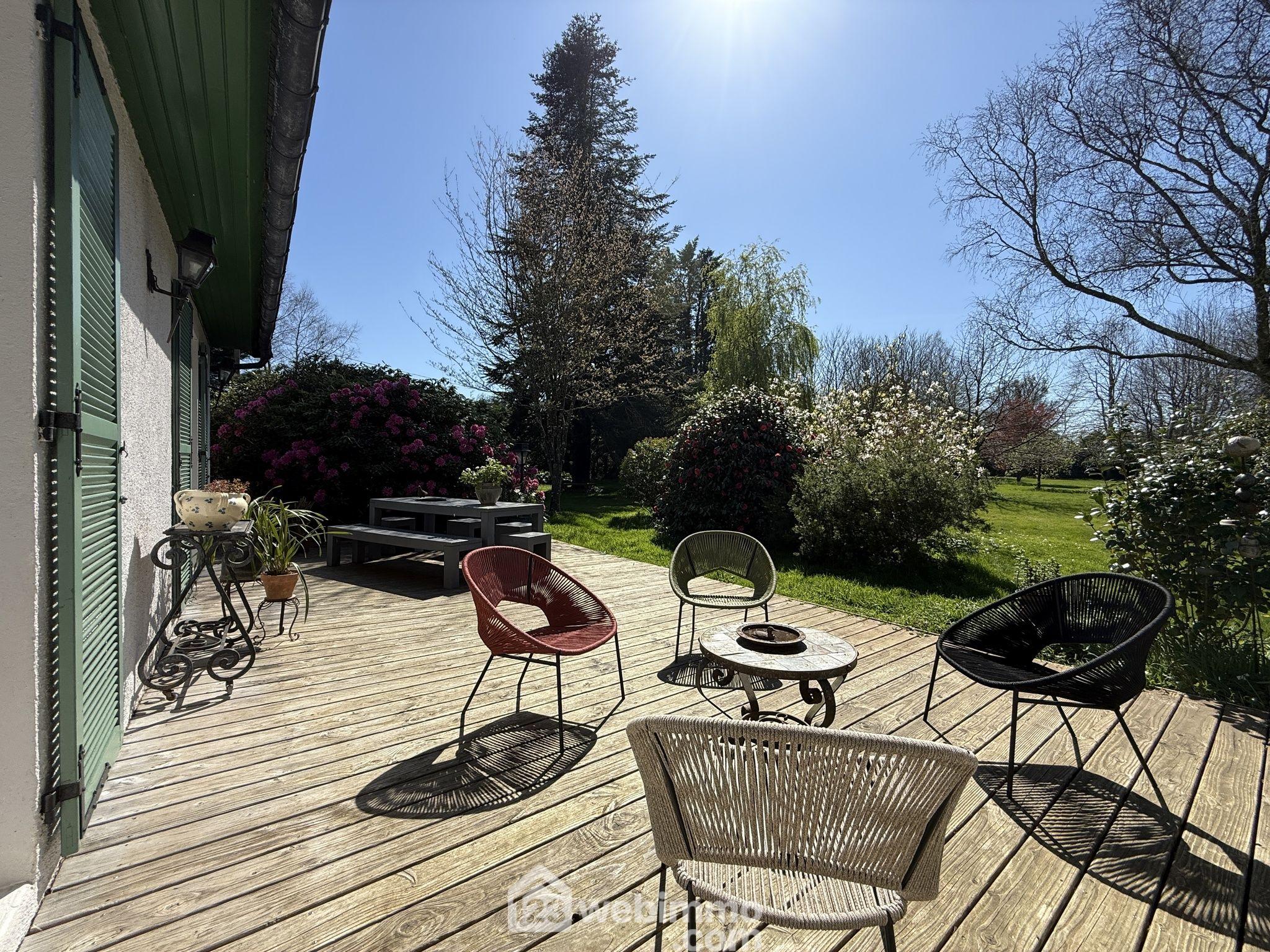 À l'extérieur, au calme et sans voisin immédiat, un magnifique jardin plat, paysager et arboré de 12283 m² renferme un verger et un bois, une terrasse orientée sud-ouest de 40 m² accessible depuis le salon, la salle à manger et la bibliothèque / bureau et une dépendance de 70 m² restant à aménager.