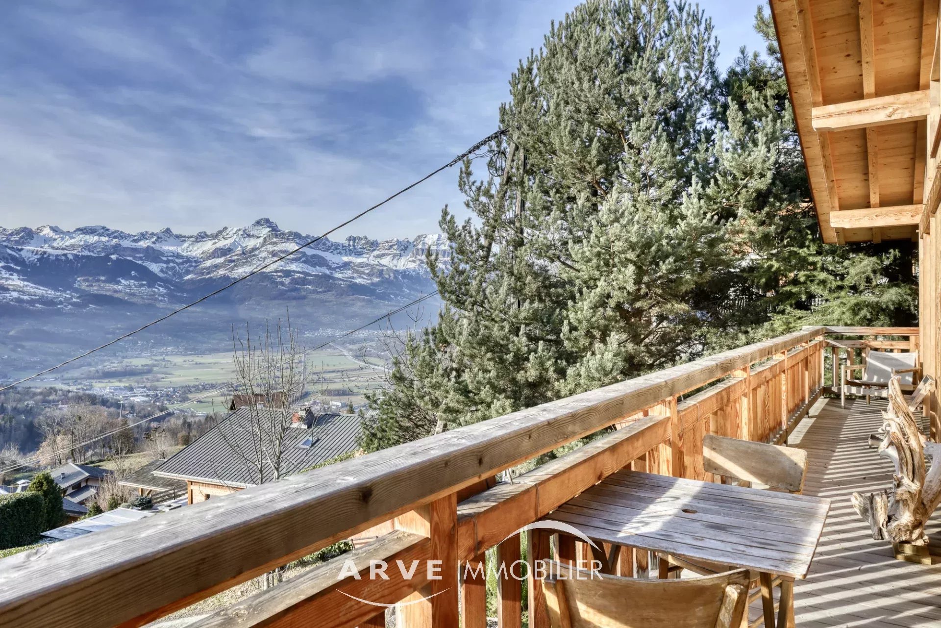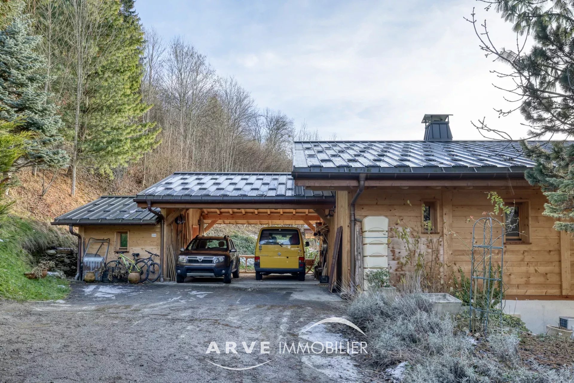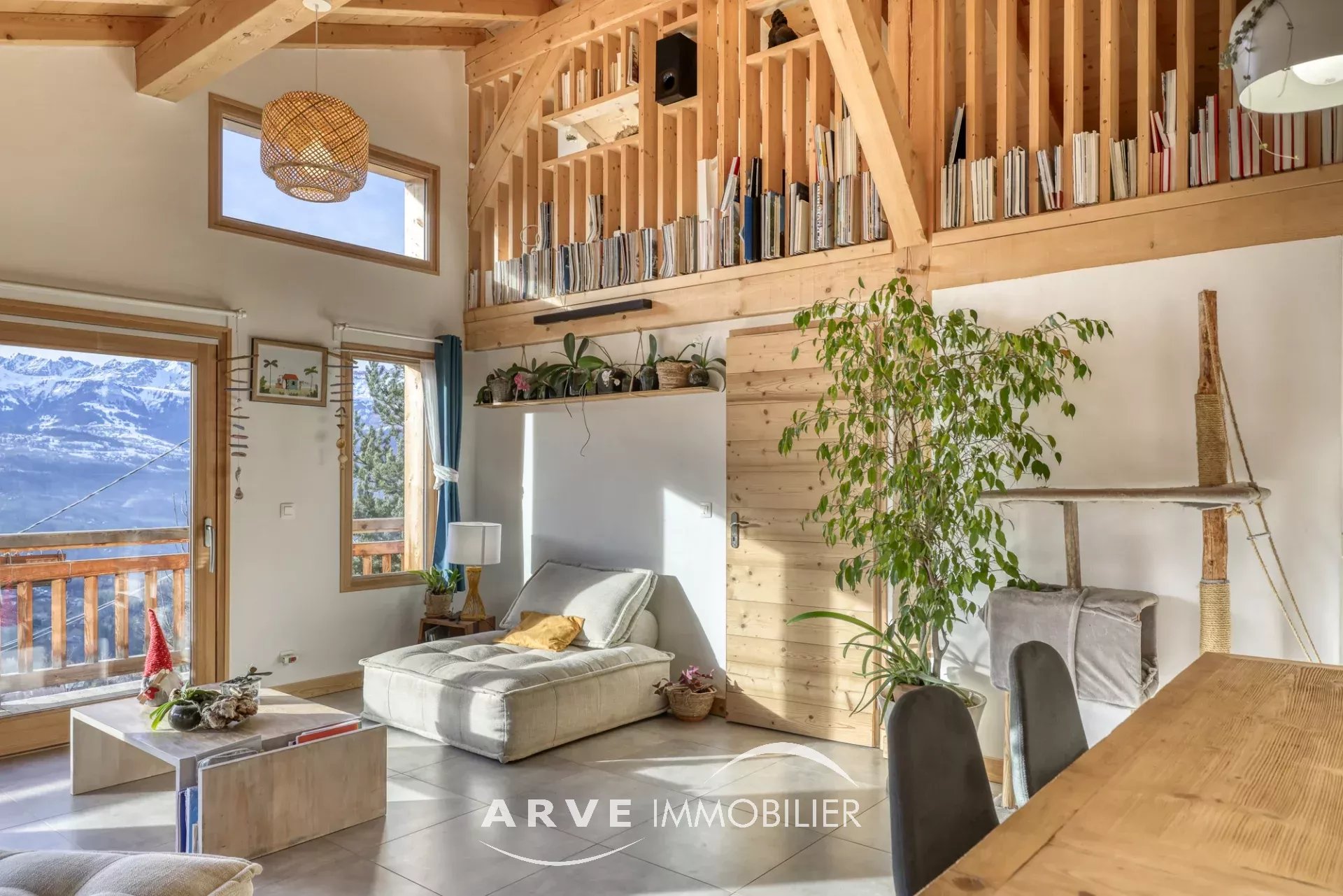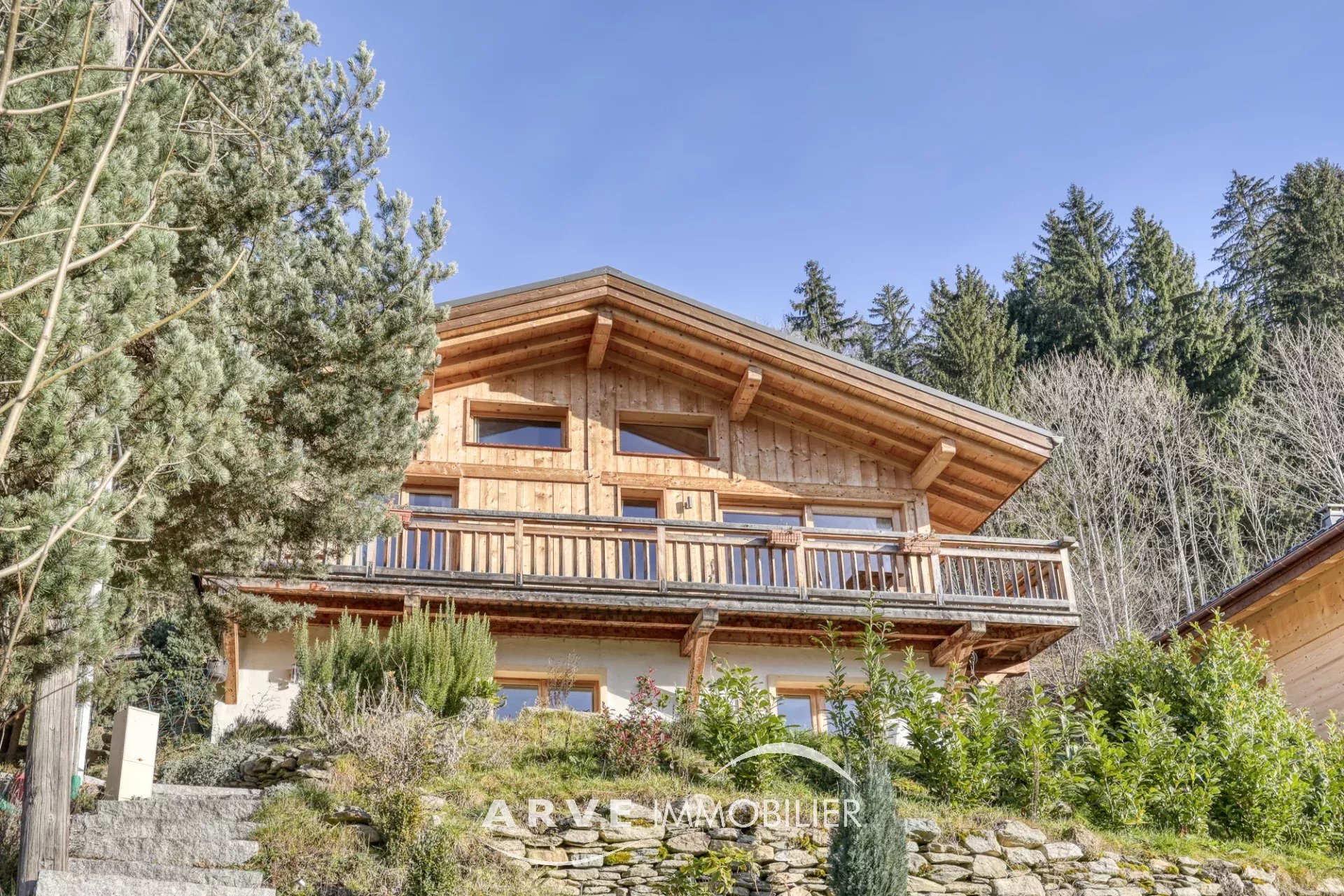 Chalet de type poteau poutre construit en 2019 par des artisans locaux reconnus, il est situé sur les hauteurs du village avec une vue panoramique sur les montagnes environnantes et la vallée, ensoleillement maximal jusque tard en soirée grâce aux orientations Sud et Ouest. Il peut être habité dans sa totalité ou en deux appartements. En rez-de-chaussée : un atelier, un double emplacement de parking protégé, le chalet qui est composé : une entrée donnant sur une belle pièce de vie très lumineuse grâce aux nombreuses ouvertures, belle hauteur sous plafond cathédrale, une cuisine américaine, un balcon d'angle donnant sur un jardin, une chambre donnant également sur le balcon, une salle d'eau et WC, un WC invités, une mezzanine, un accès par l'intérieur pour l'appartement du bas. En rez-de-jardin, une pièce de vie avec une kitchenette, deux chambres, tous trois donnant sur un jardin, une salle d'eau, un WC, une cave, un local technique. Plusieurs places de parking extérieur.