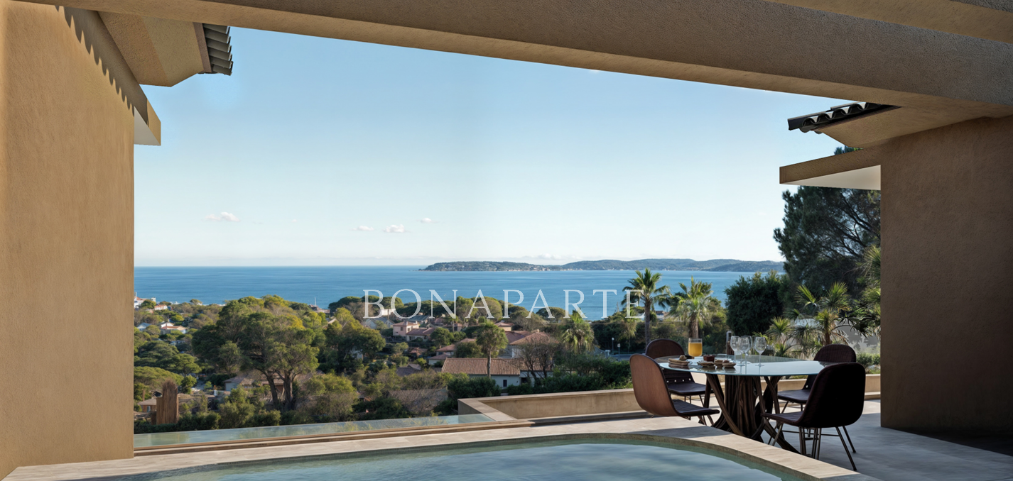 Au sein d'un domaine privé et sécurisé, en bout d'impasse et en position dominante, cette villa neuve d'architecte vous propose un cadre de vie exceptionnel, mêlant calme absolu, proximité des commodités et prestations de luxe. Édifiée sur un terrain paysager de 2 250 m2, cette propriété d'environ 317 m2 habitables allie à la perfection élégance contemporaine et confort moderne. Elle reflète tout le savoir-faire d'un constructeur maximois reconnu, dont chaque réalisation se distingue par une signature architecturale audacieuse, singulière et originale. Dès l'entrée, vous serez séduit par les volumes et la fluidité des espaces. La vaste pièce de vie d'environ 145 m2, ouverte sur de larges terrasses, offre une belle perspective vers la mer et les collines environnantes, dans une atmosphère de sérénité totale.