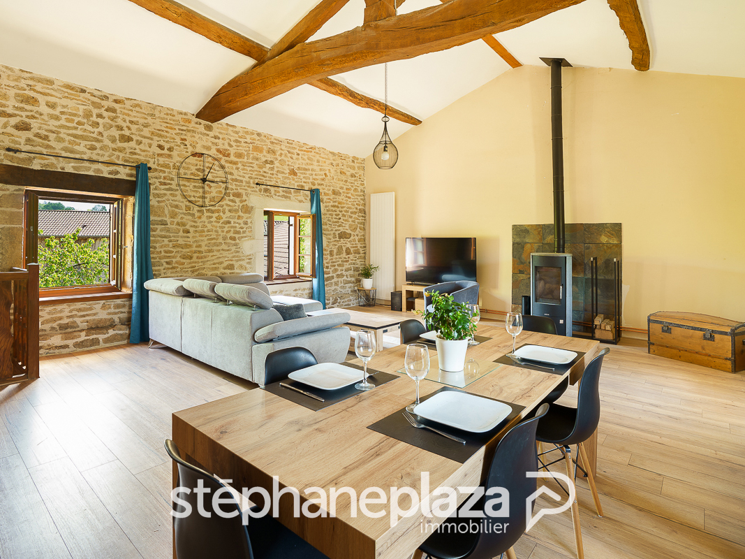 EXCLUSIVITE STEPHANE PLAZA IMMOBILIER. VISITE VIRTUELLE 100% IMMERSIVE de ce bien : A découvrir sur notre site web ou en agence sur Table KINETI ! Venez découvrir cette magnifique Propriété en pierre de 215 m2 mêlant à merveille le cachet de l'ancien au confort du moderne. Edifiée sur un superbe terrain arboré et intimiste de 535 m2 au coeur du secteur très prisé du Clunysois, dans l'environnement agréable de Jalogny, cette vaste Maison rénovée sur deux niveaux est idéalement située à quelques minutes de Cluny et à seulement 20 minutes de Mâcon. L'entrée, au 1er étage, s'ouvre sur un hall desservant un vaste séjour mêlant poutres et belles pierres, une cuisine aménagée, ainsi qu'un Wc indépendant, une chambre et une salle d'eau. Quelques marches mènent à un beau salon d'été, donnant directement accès à l'extérieur pour profiter des beaux jours en famille ou entre amis sur la terrasse à l'abris des regards. La partie nuit se compose de deux chambres. Le terrain entièrement clos, découpé en plusieurs espaces entourés de pierre, vous offre un cadre exceptionnel entre jardin, espace de vie et espace vert. Une cave, une buanderie et deux espaces atelier / garage complètent cette Propriété. Prestations : Maison rénovée au cours des cinq dernières années, Fibre optique en cours de déploiement, Chauffage bois, Pas de vis a vis, puit Les informations sur les risques éventuels auxquels ce bien est exposé sont disponibles sur le site Géorisques : www.georisques.gouv.fr **Honoraires à la charge du vendeur. Pour toute information complémentaire, contactez l'agence Stéphane Plaza Immobilier Mâcon. Jean-Baptiste BORZYCKI (EI) Agent Commercial - Numéro RSAC : 844 092 320 - Macon.