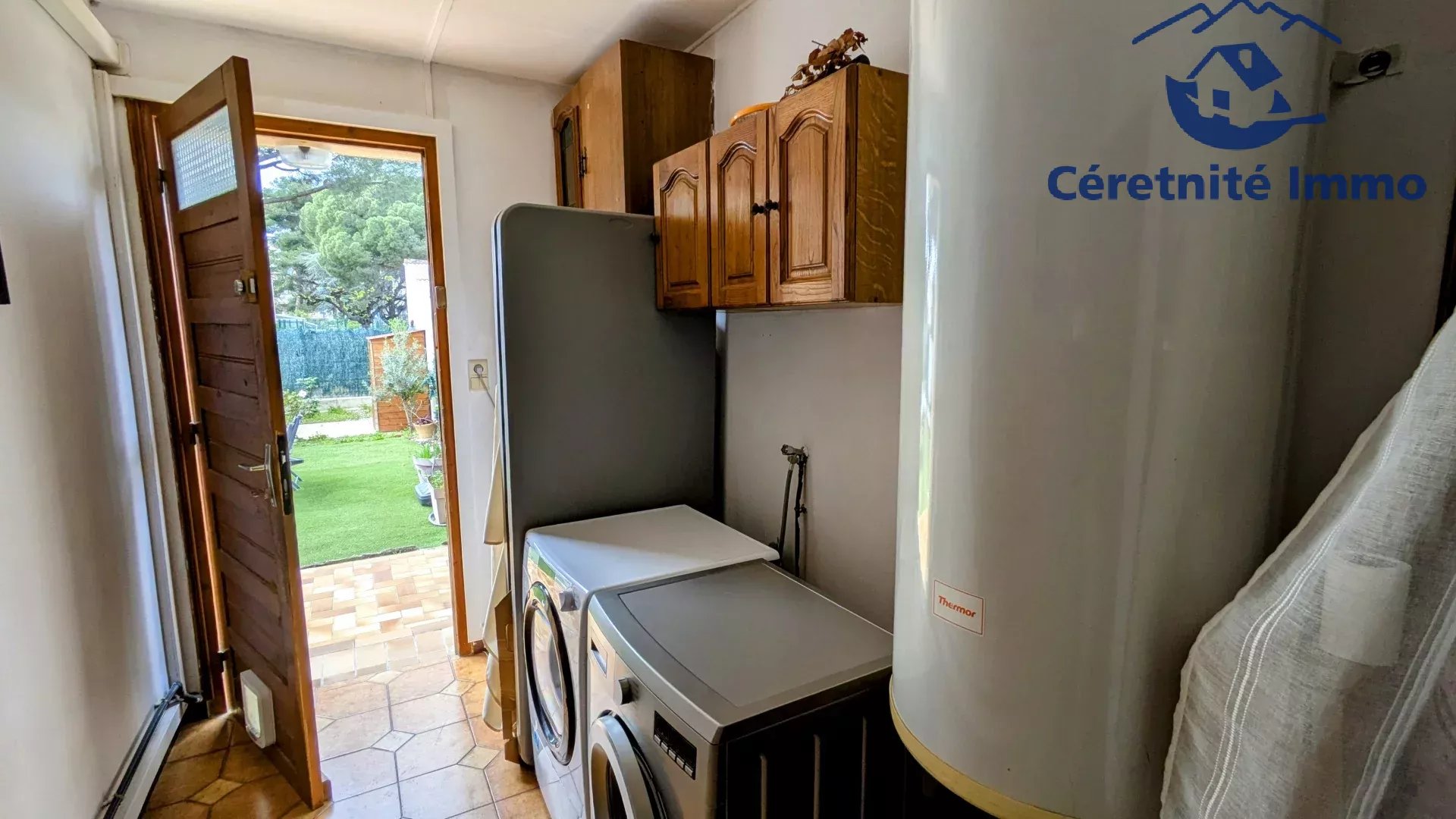 Céretnite-immo vous propose cette maison deux faces proche des commodités, au calme et permettant facilement de sortir vers les centres d'intérêts ( mer, montagne et villes...) La pièce de vie est lumineuse avec sa cuisine aménagée et équipée, une buanderie vient compléter cette prestation. Le jardin suffisamment dimensionné permet les repas et les activités en extérieur. Le système de climatisation réversibles par PAC dans le séjour et les chambres, permet de réaliser des économies d'énergie tout en assurant un confort optimal en toute saison. Cette maison est idéale pour une famille, pour un premier achat ou un secondaire. A visiter sans tarder.