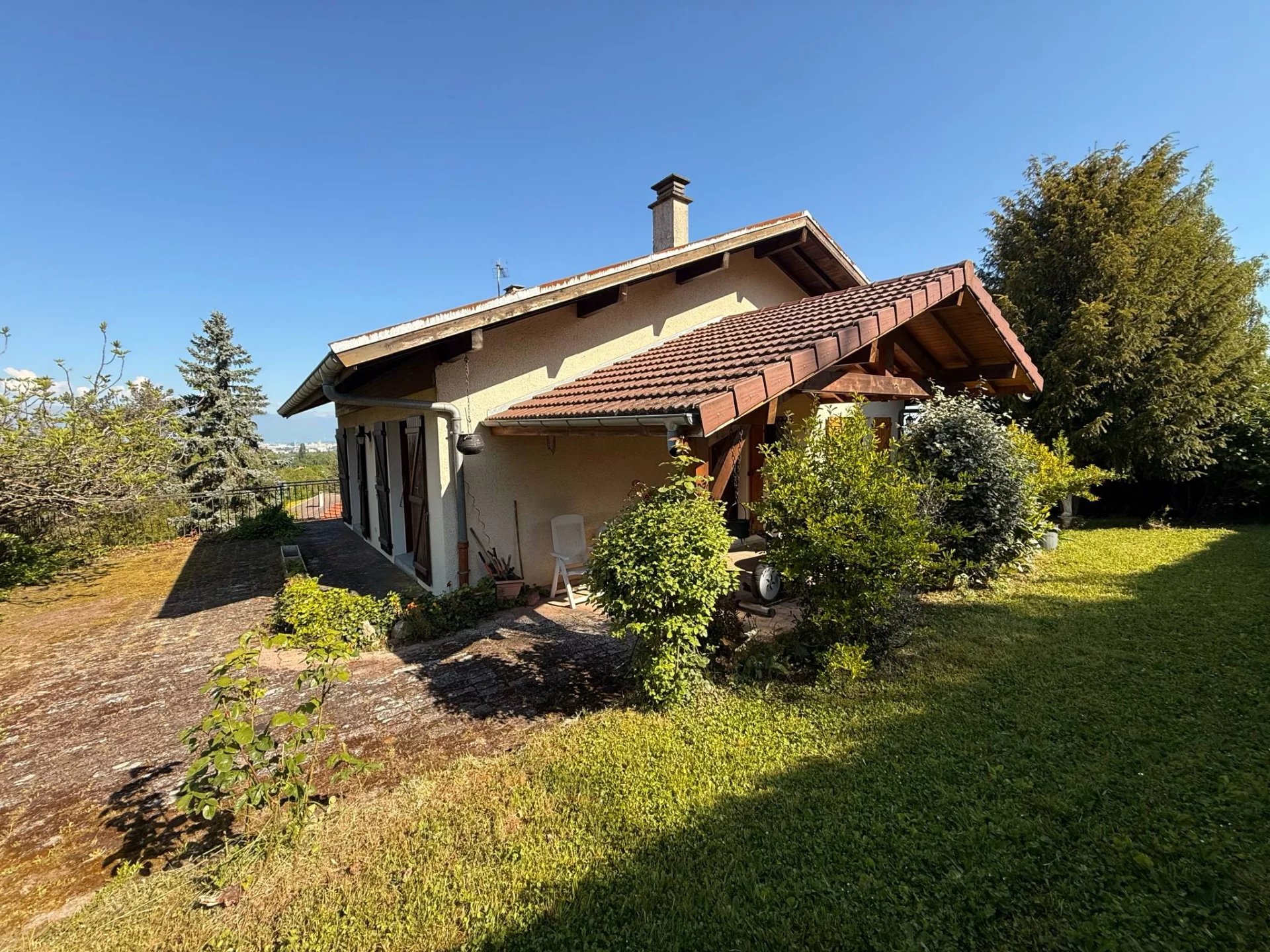 BOSSEY - Dans un quartier résidentiel et très demandé, proche de toutes commodités (école, commerces, golf, douane) venez découvrir sans tarder cette maison individuelle sur sous-sol à rénover. Implantée sur un joli terrain arboré de 857m². Cette propriété est composée de trois niveaux. En rez-de-chaussée vous y trouverez une entrée avec rangements, une cuisine aménagée donnant sur terrasse avec vue dégagée sur le bassin Genevois, un séjour lumineux avec cheminée donnant sur grande terrasse exposée sud-ouest. Le coin nuit est composé de deux chambres, une salle de bains et un WC séparé. L’escalier permettant de monter au premier étage donne quant à lui sur un palier qui dessert une chambre avec salle de bains et WC, une chambre avec point d'eau ainsi que des combles. La partie inférieure de cette maison dispose d’un spacieux garage permettant de recevoir plusieurs voitures, une cave et chaufferie. Cette propriété possède également une terrasse abritée. Très beau potentiel ! Prix : 735 000 € honoraires charge vendeur. Pour plus d'informations, contactez l'agence Invest&Immo: 06.25.91.48.47
