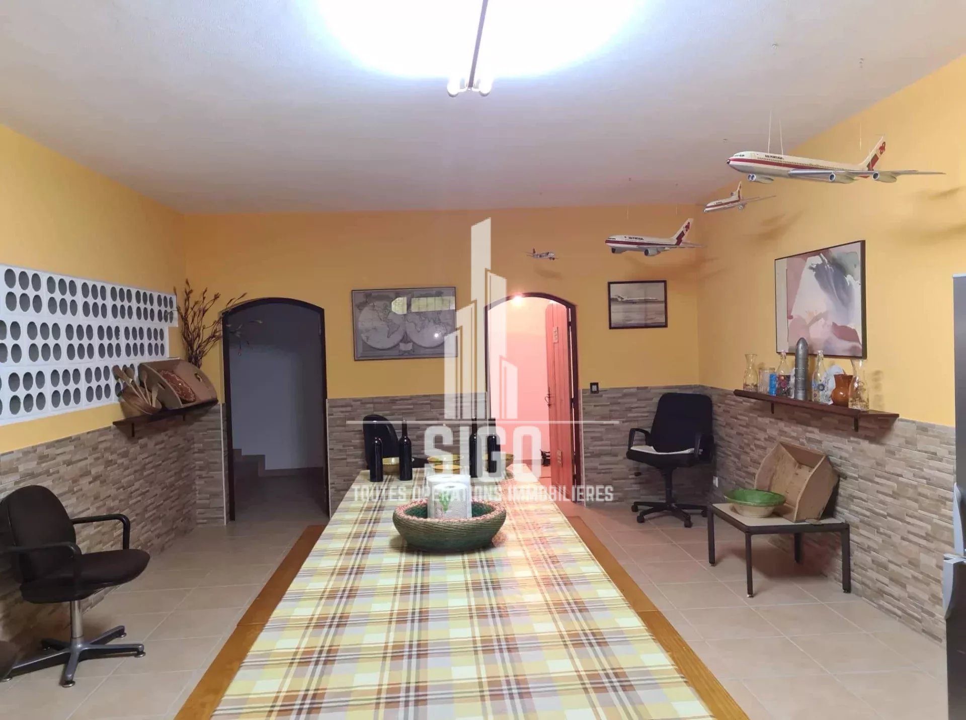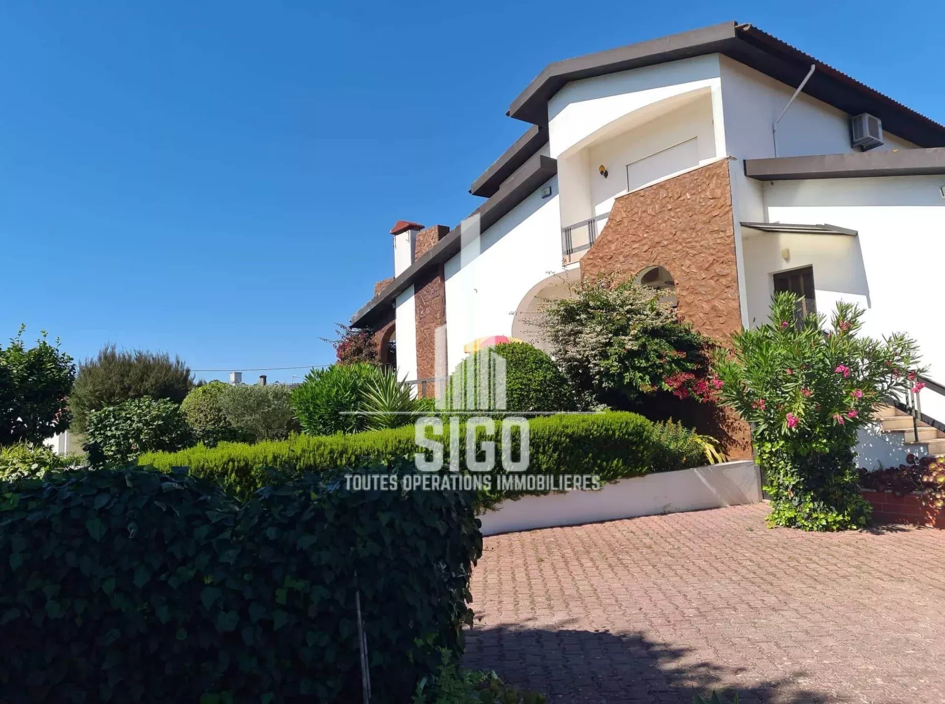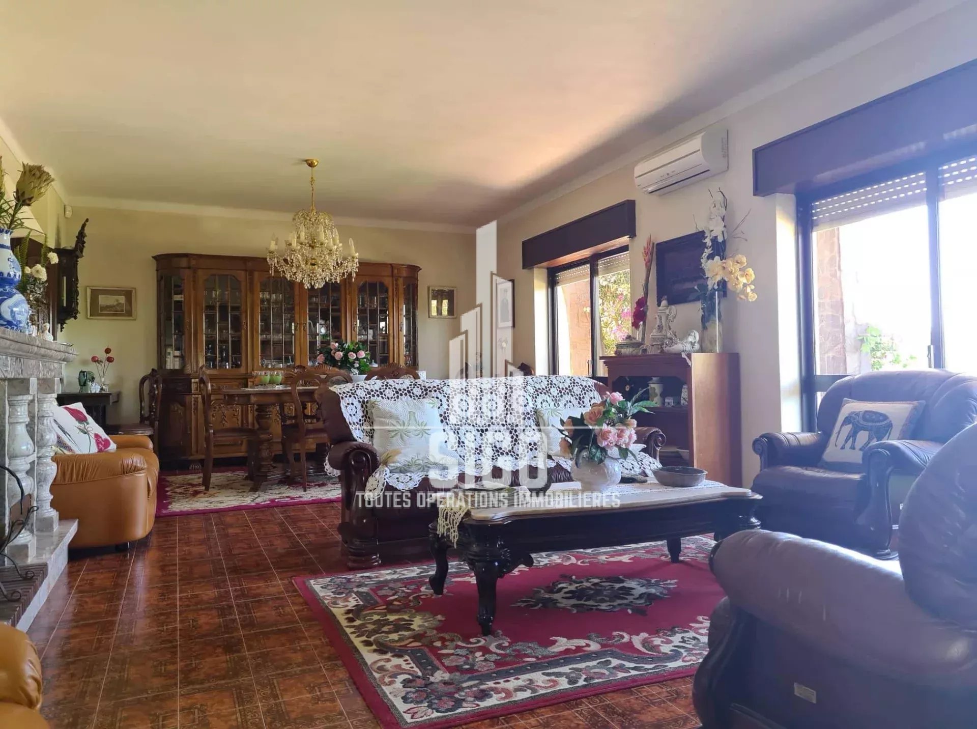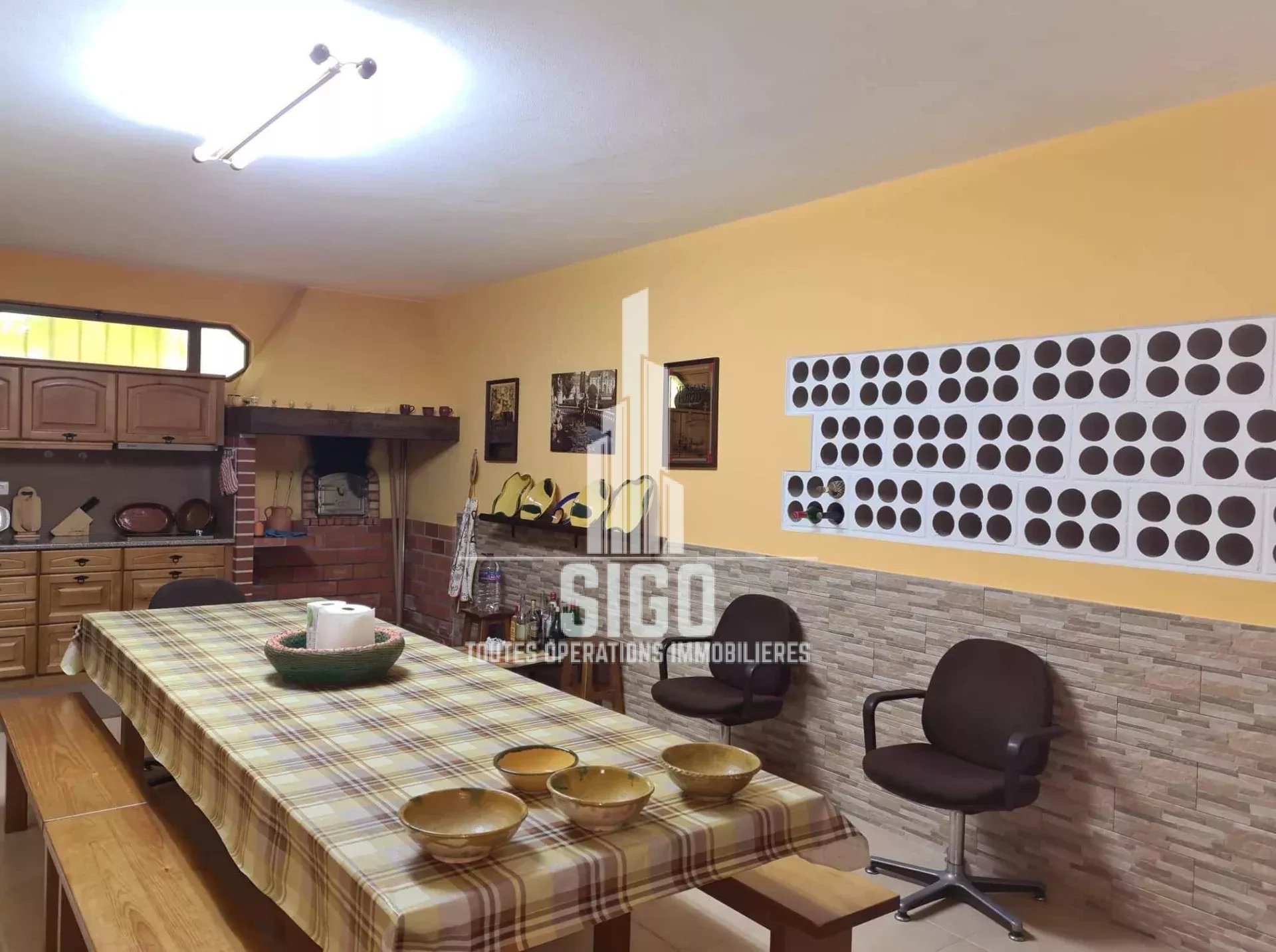 Cette villa spacieuse en parfaites conditions d'habitation située sur un terrain de 3826m2, est composée au rez-de-jardin d'un grand espace de vie, d'une cuisine, d'un four à bois, d'une cave à vin, d'une salle de bain, d'une chambre à coucher (actuellement transformée en débarras et d'un grand garage ; au rez-de-chaussée se trouve le hall d'entrée, une cuisine entièrement équipée avec salle à manger (style garde-manger), avec accès à un balcon fermé, un salon, deux chambres à coucher (dont une avec balcon), une salle de bain et une toilette ; au 1er étage se trouvent encore trois chambres à coucher et une salle de bain. La villa est équipée de la climatisation et d'une cheminée/feu ouvert.