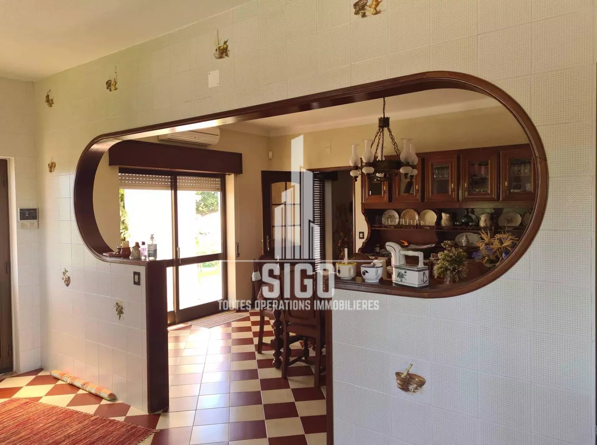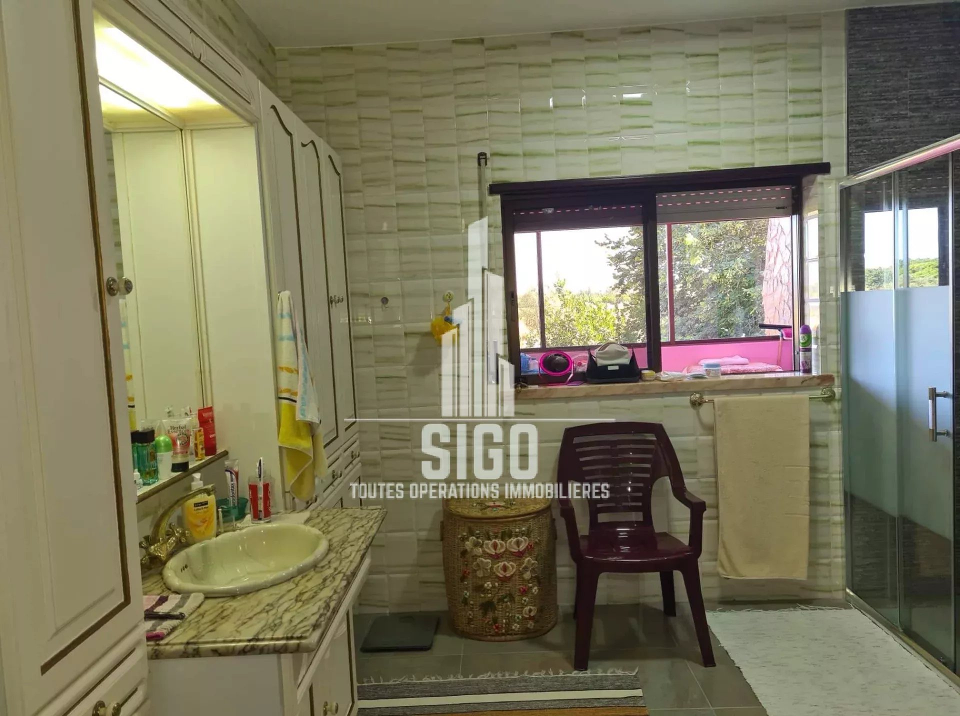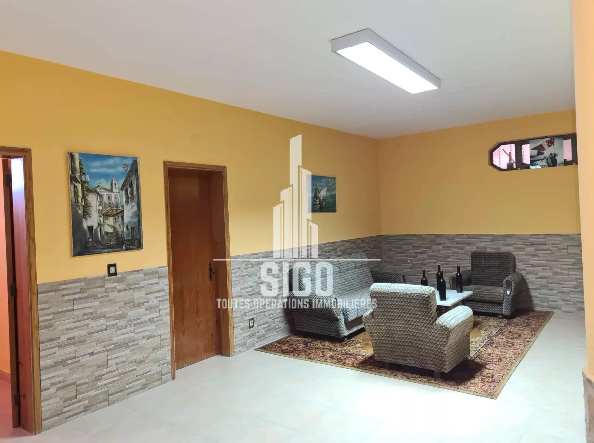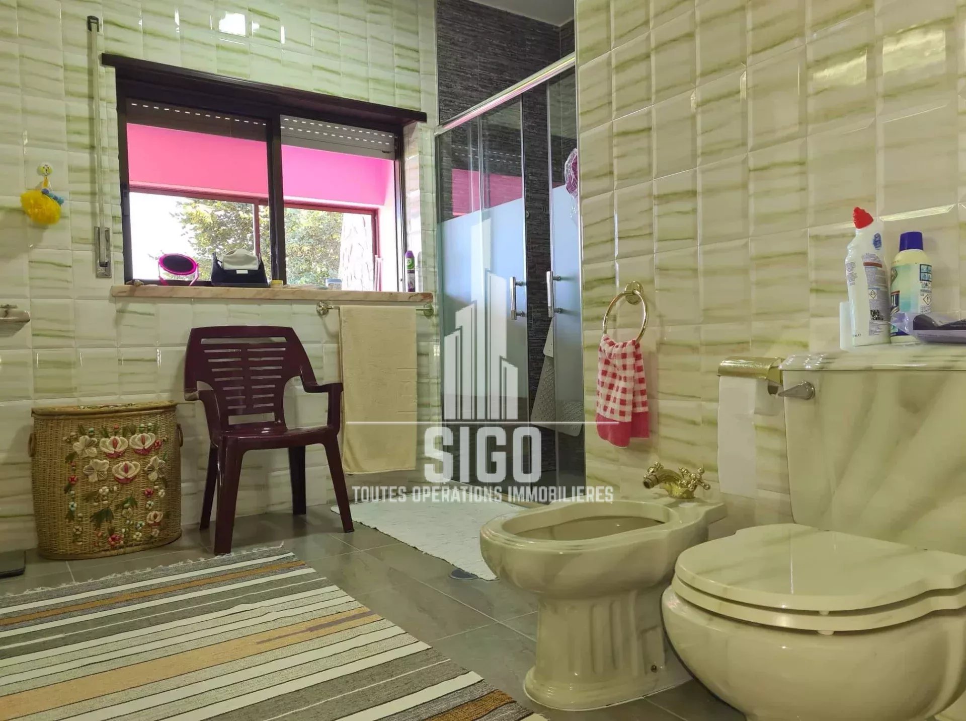 Cette villa spacieuse en parfaites conditions d'habitation située sur un terrain de 3826m2, est composée au rez-de-jardin d'un grand espace de vie, d'une cuisine, d'un four à bois, d'une cave à vin, d'une salle de bain, d'une chambre à coucher (actuellement transformée en débarras et d'un grand garage ; au rez-de-chaussée se trouve le hall d'entrée, une cuisine entièrement équipée avec salle à manger (style garde-manger), avec accès à un balcon fermé, un salon, deux chambres à coucher (dont une avec balcon), une salle de bain et une toilette ; au 1er étage se trouvent encore trois chambres à coucher et une salle de bain. La villa est équipée de la climatisation et d'une cheminée/feu ouvert.