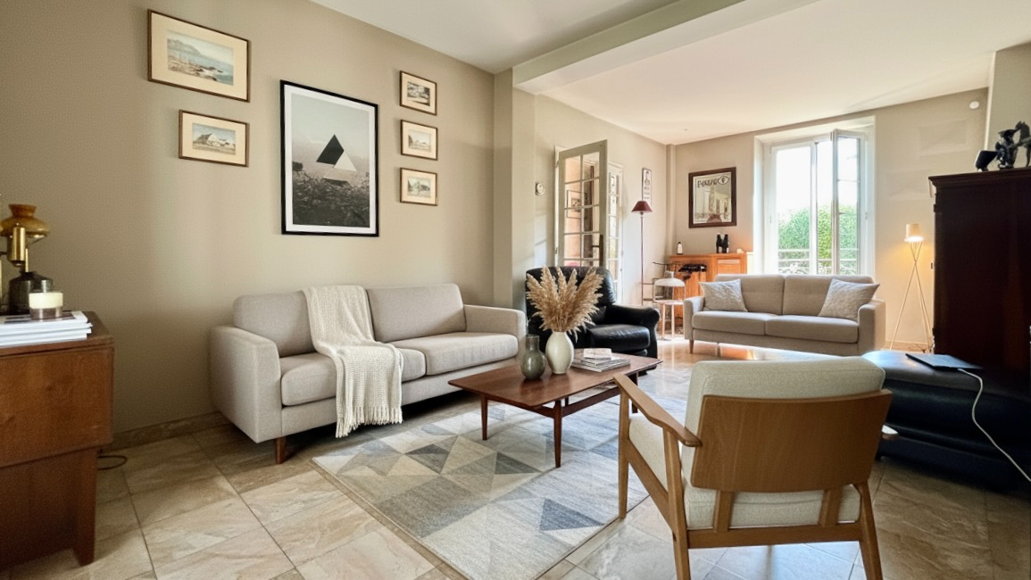 BELLE MAISON DES ANNÉES 1870 SUR 3 NIVEAUX ET TERRAIN DE +900M2 : Cette maison offre de beaux volumes avec un séjour-double, un petit salon et une cuisiné séparée. La VÉRANDA s'ouvre sur le grand jardin arboré et donne accès à la CAVE et au double GARAGE. Le 1er niveau s'ouvre sur un pallier avec placard qui dessert 3 CHAMBRES et une salle d'eau/wc. Et enfin, les 2 chambres du second niveau offrent un potentiel intéressant (suite parentale, dressing, ou bureau,...). Maison familiale, proches de toutes commodités à pieds. ATOUTS : triple vitrage et jardin sans vis-à-vis... Le reste est à découvrir lors d'une visite !