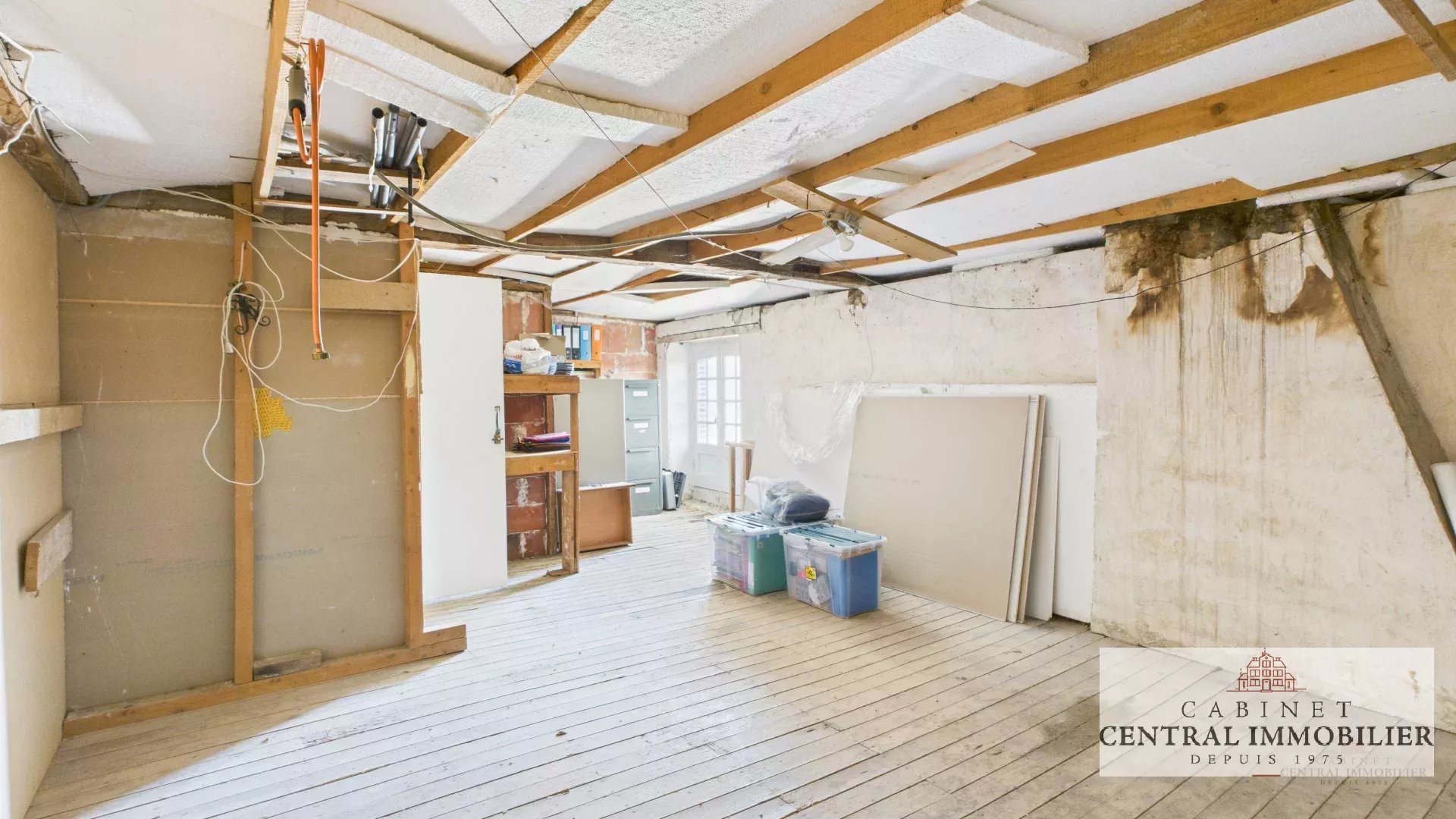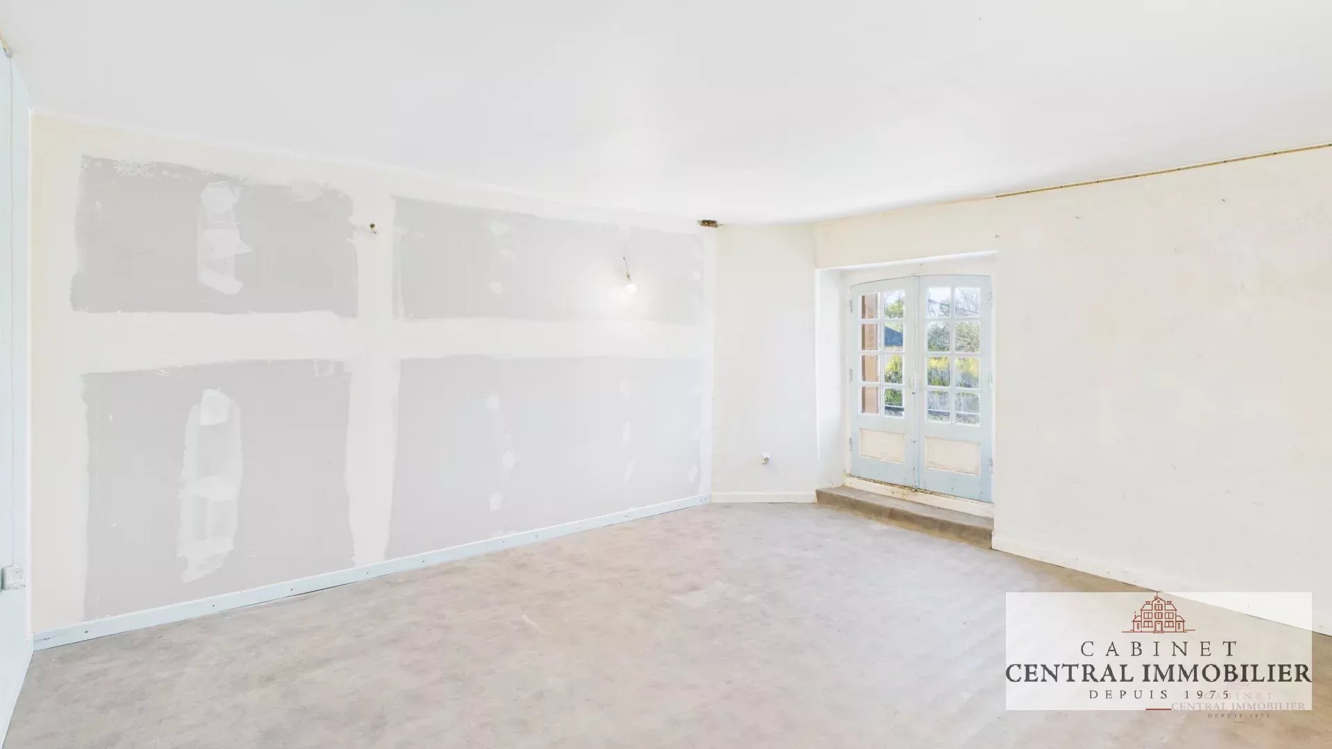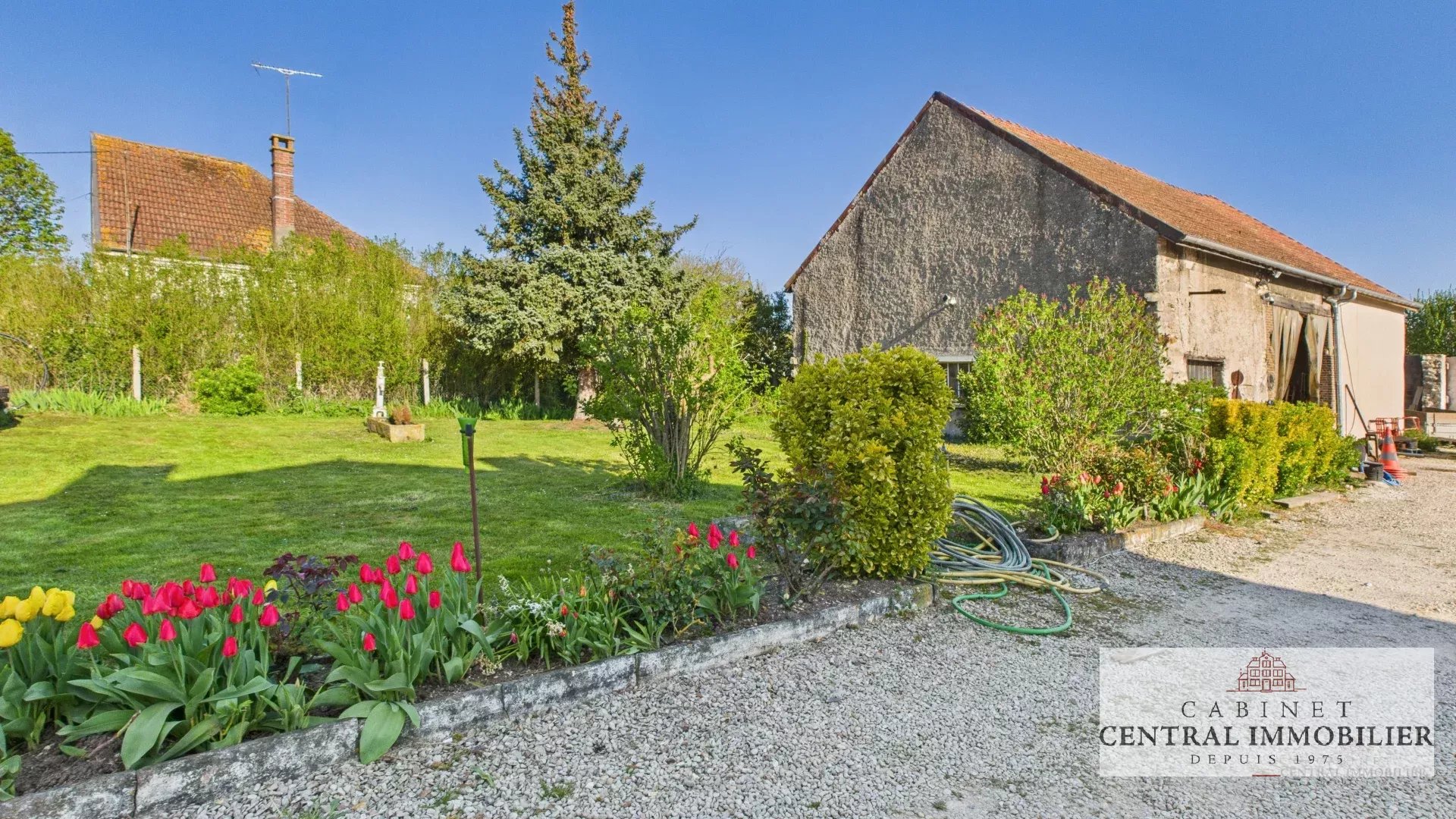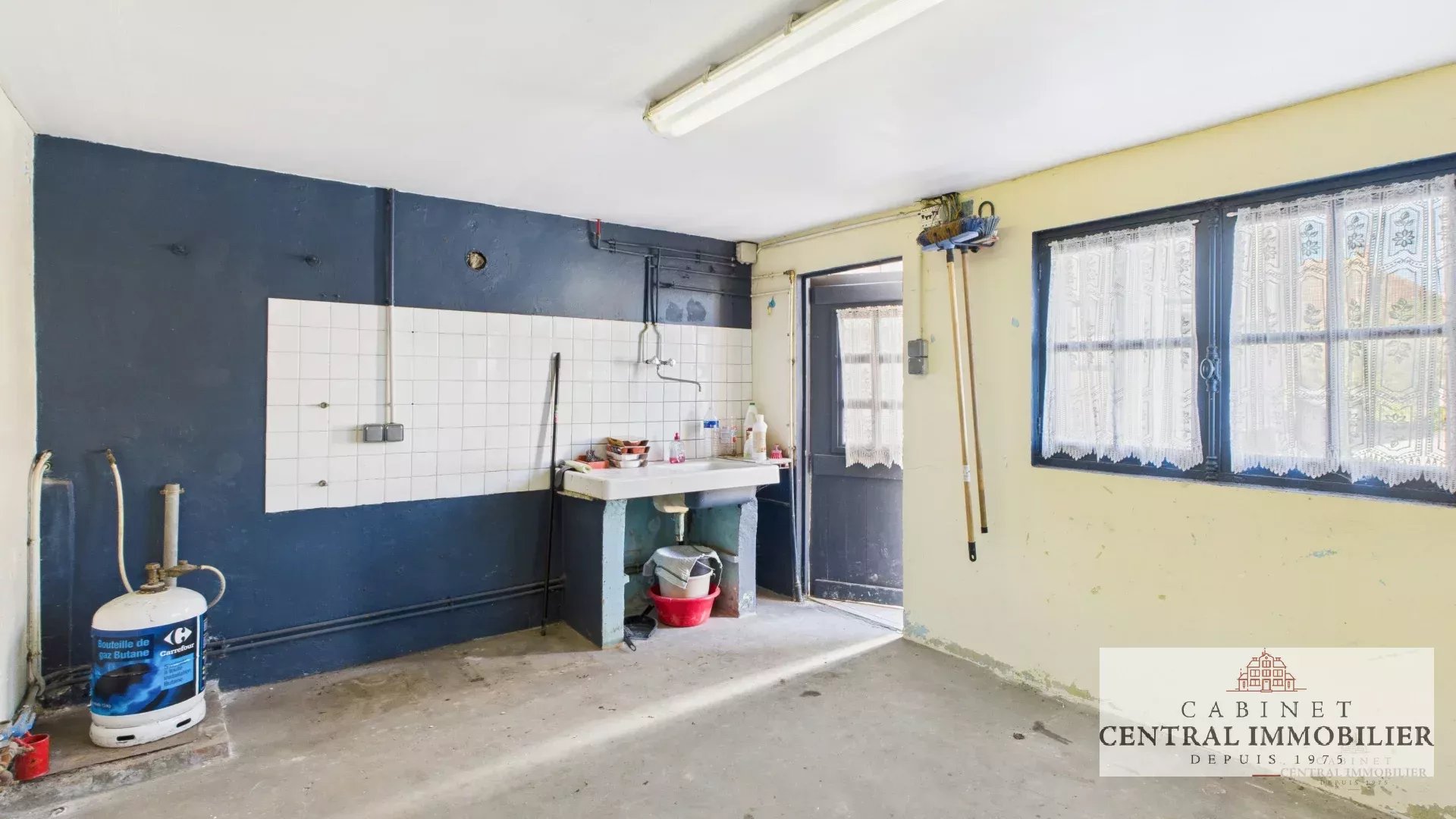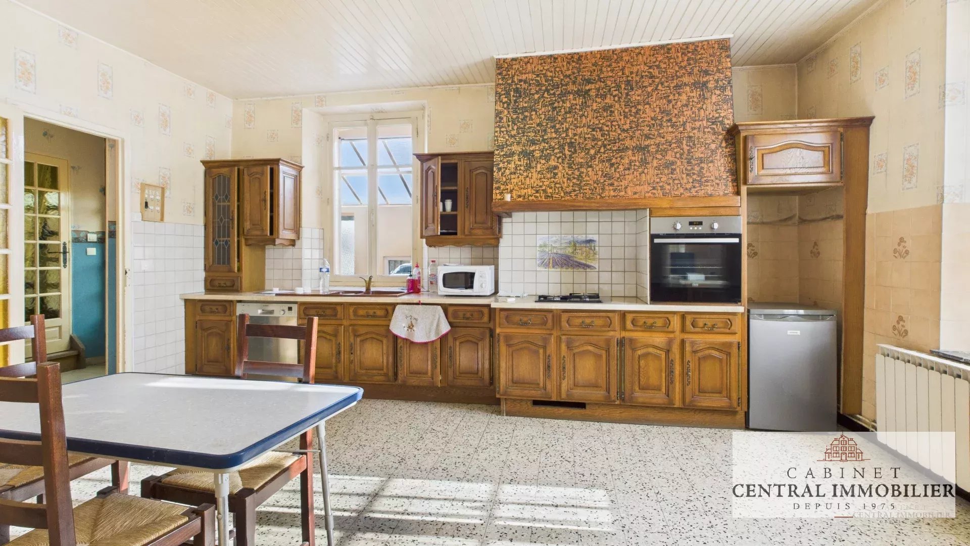 Maison comprenant entrée carrelée de 4.51m²avec véranda, une cuisine carrelée aménagée et équipée de 22.05m², un salon/séjour carrelée avec cheminée insert de 30.17m², WC, une salle de bain carrelée de 5.97m² avec coin buanderie et sèche serviettes, une pièce palière de 12.53m² (salle de jeux ou bureau) desservant deux chambres carrelées de 10.57m² et 11.14m². À l'étage: palier et couloir desservant 3 greniers (possibilité de créer une salle de bain et chambre), une chambre de 14.92m², un débarras, une chambre de 12.19m², une chambre de 14.80m². Simple vitrage, volets roulants électriques en partie, pompe à chaleur eau/eau, radiateurs électriques au 1er étage. Terrain clos de 1 794m² avec une cuisine d'été de 13.38m² avec WC sur fosse, une cave voutée, un espace bureau de 13.16m². Une grange, une remise en dur, tout à l'égout.