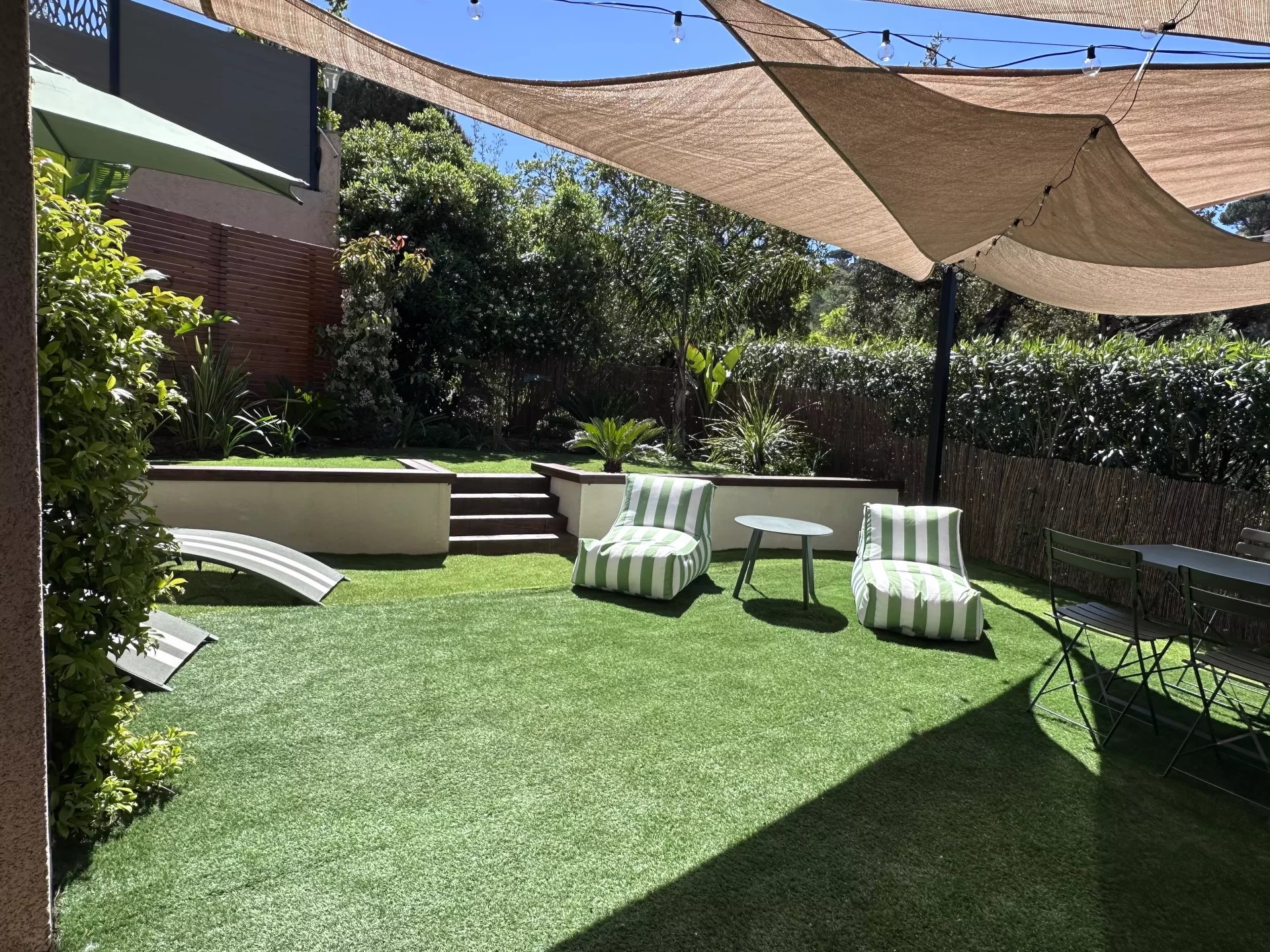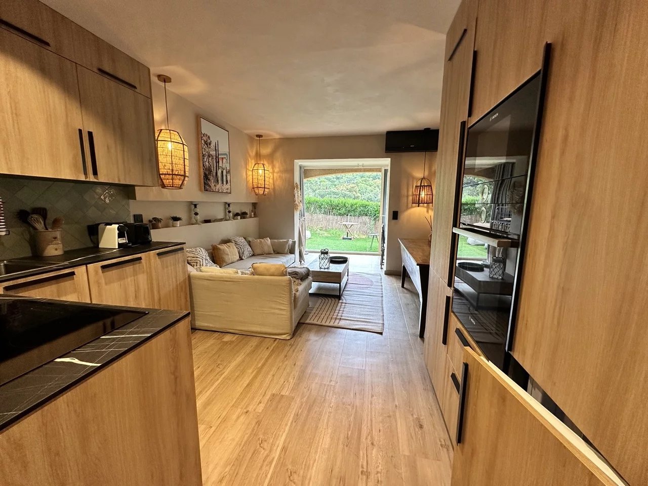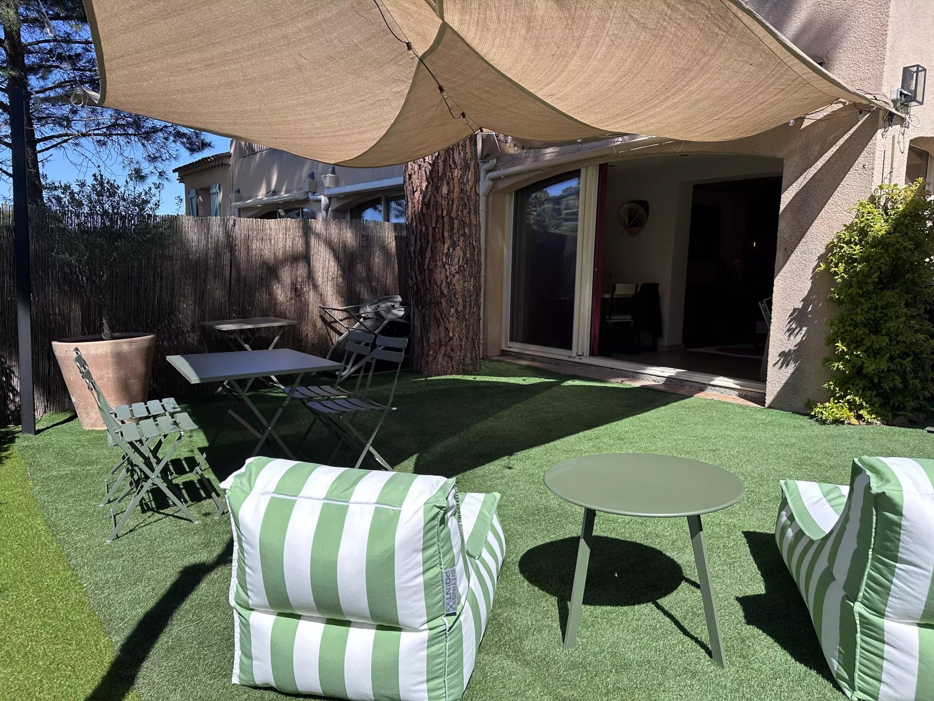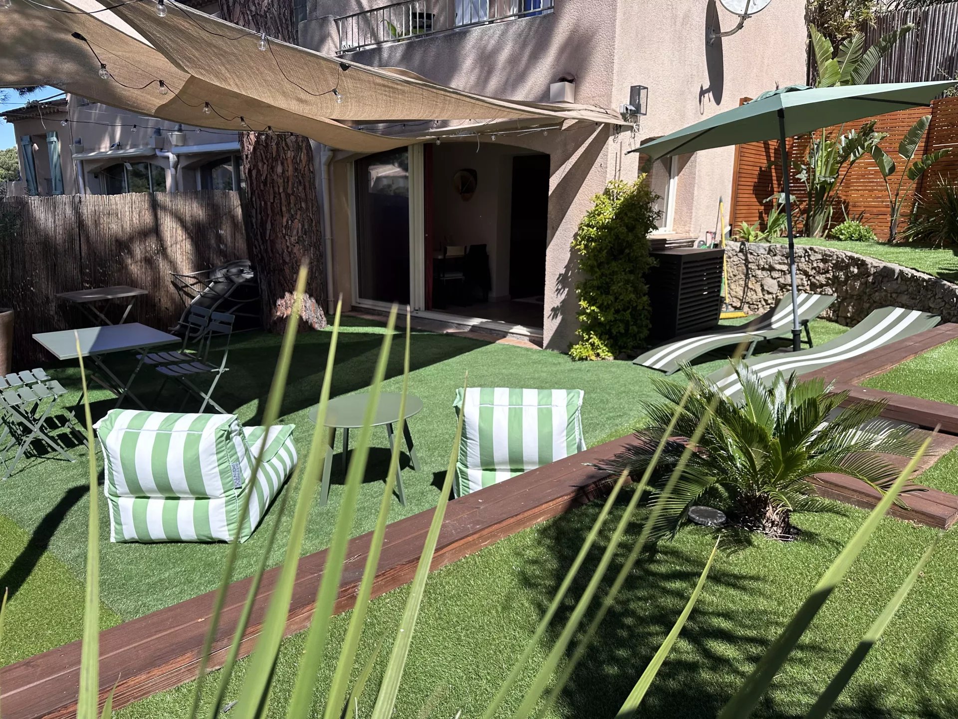 Coup de coeur assuré pour cet appartement dont la décoration bohème saura vous charmer. Proche du golf de Sainte-Maxime et à 1km des plages de la Nartelle, l'appartement se situe dans une résidence au calme. L'appartement se compose d'une chambre avec lit double, d'une pièce à vivre avec une superbe cuisine ouverte et canapé convertible pouvant accueillir 2 personnes. 1 salle de douche L'appartement est équipé de la climatisation, bouilloire, cafetière, four, micro onde, télévision. Internet Un jardinet de 150 m2 avec table et chaises extérieures et 2 transats. Coup de coeur assuré pour cet appartement superbement décoré. Pour votre information l'accès à l'appartement nécessite de monter quelques marches. Place de stationnement privative. Le linge de lit + serviettes fournis.