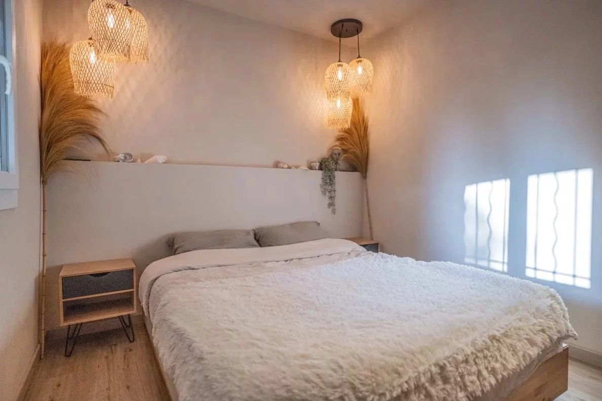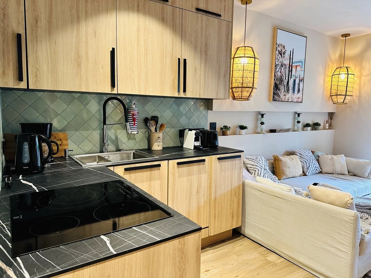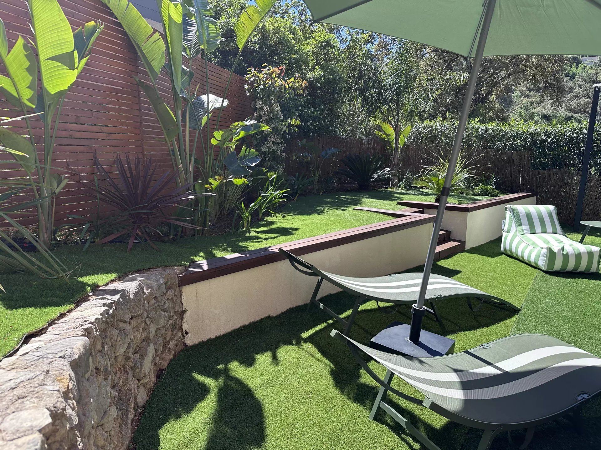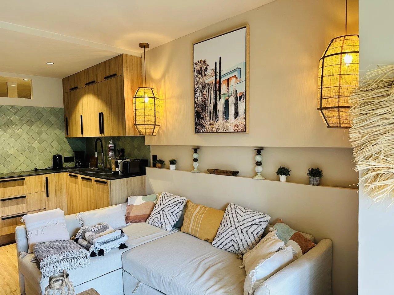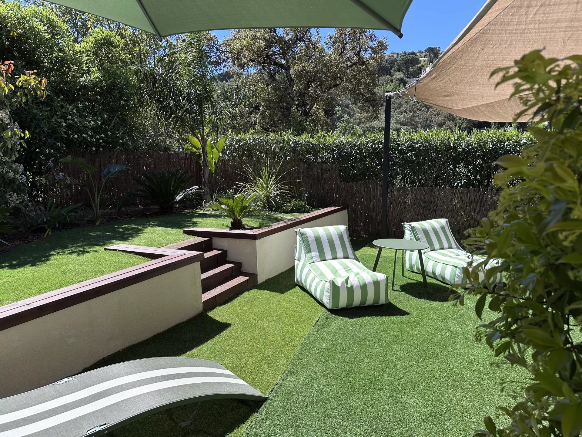 Coup de coeur assuré pour cet appartement dont la décoration bohème saura vous charmer. Proche du golf de Sainte-Maxime et à 1km des plages de la Nartelle, l'appartement se situe dans une résidence au calme. L'appartement se compose d'une chambre avec lit double, d'une pièce à vivre avec une superbe cuisine ouverte et canapé convertible pouvant accueillir 2 personnes. 1 salle de douche L'appartement est équipé de la climatisation, bouilloire, cafetière, four, micro onde, télévision. Internet Un jardinet de 150 m2 avec table et chaises extérieures et 2 transats. Coup de coeur assuré pour cet appartement superbement décoré. Pour votre information l'accès à l'appartement nécessite de monter quelques marches. Place de stationnement privative. Le linge de lit + serviettes fournis.