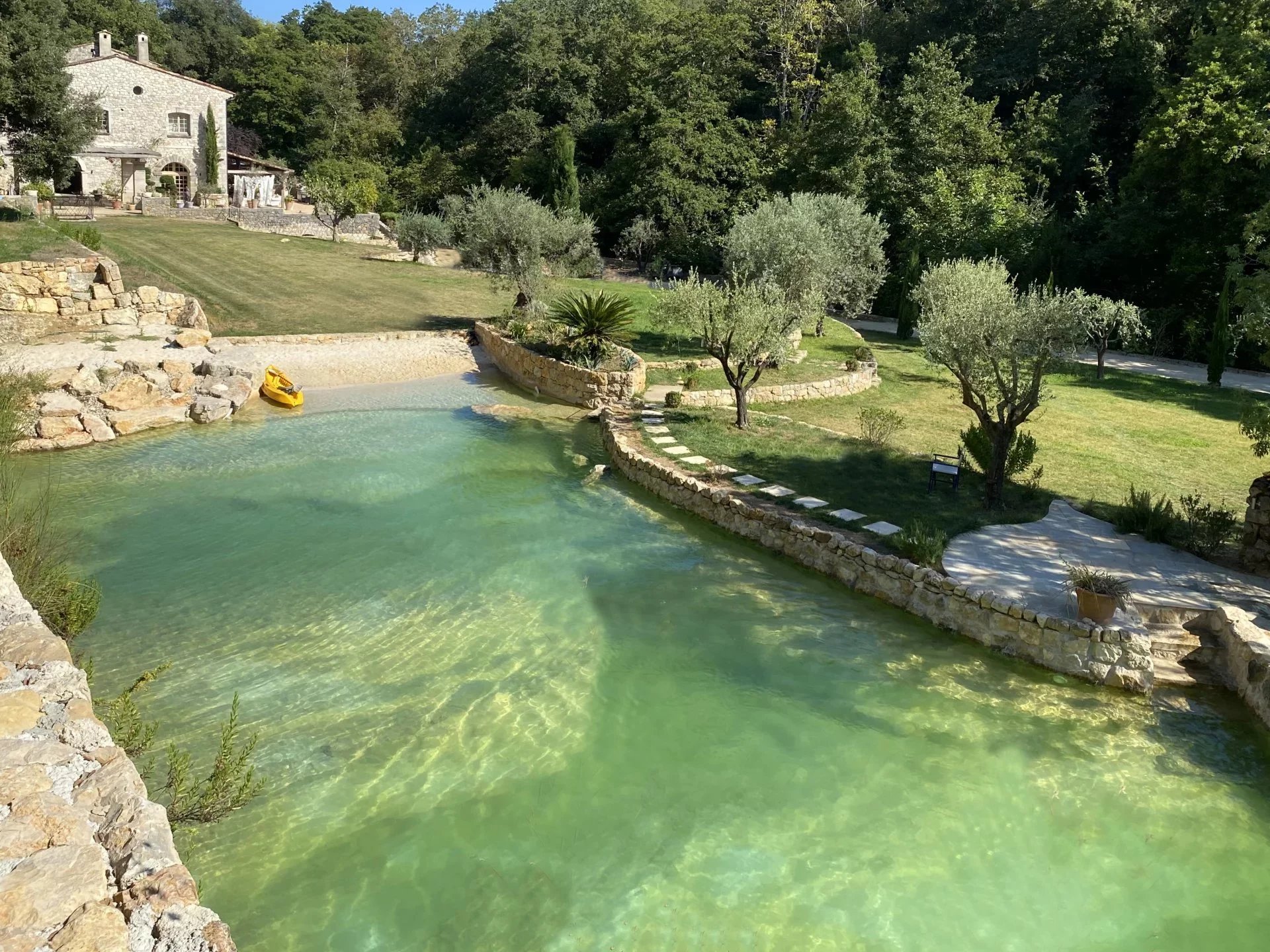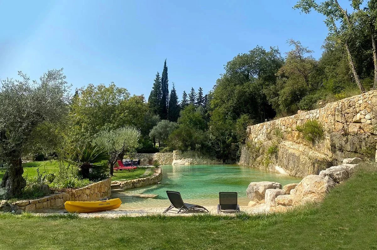 Le fabuleux terrain sur lequel est édifié la batisse est délimité d'un côté par une grande zone protégée et de l'autre par une très jolie rivière. On y trouve une grande piscine naturelle de 40 m creusée dans la roche doté de sa propre plage et alimentée par une source naturelle. On y trouve également de grandes pelouses, un jacuzzi et d'une cuisine professionnelle.