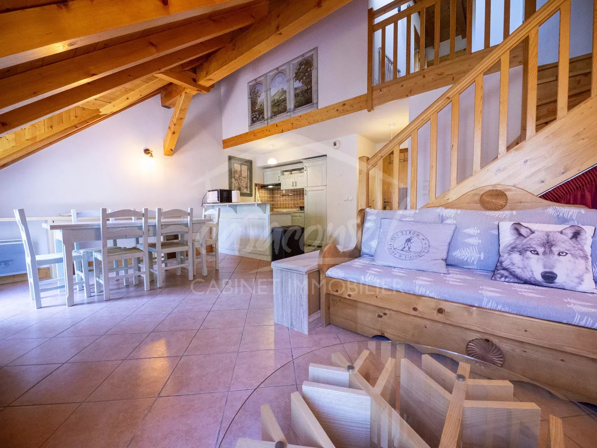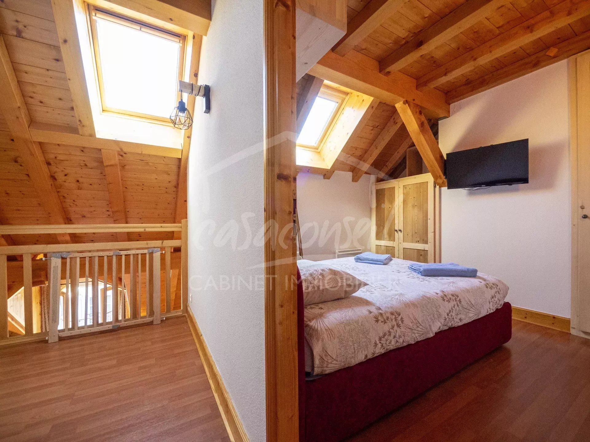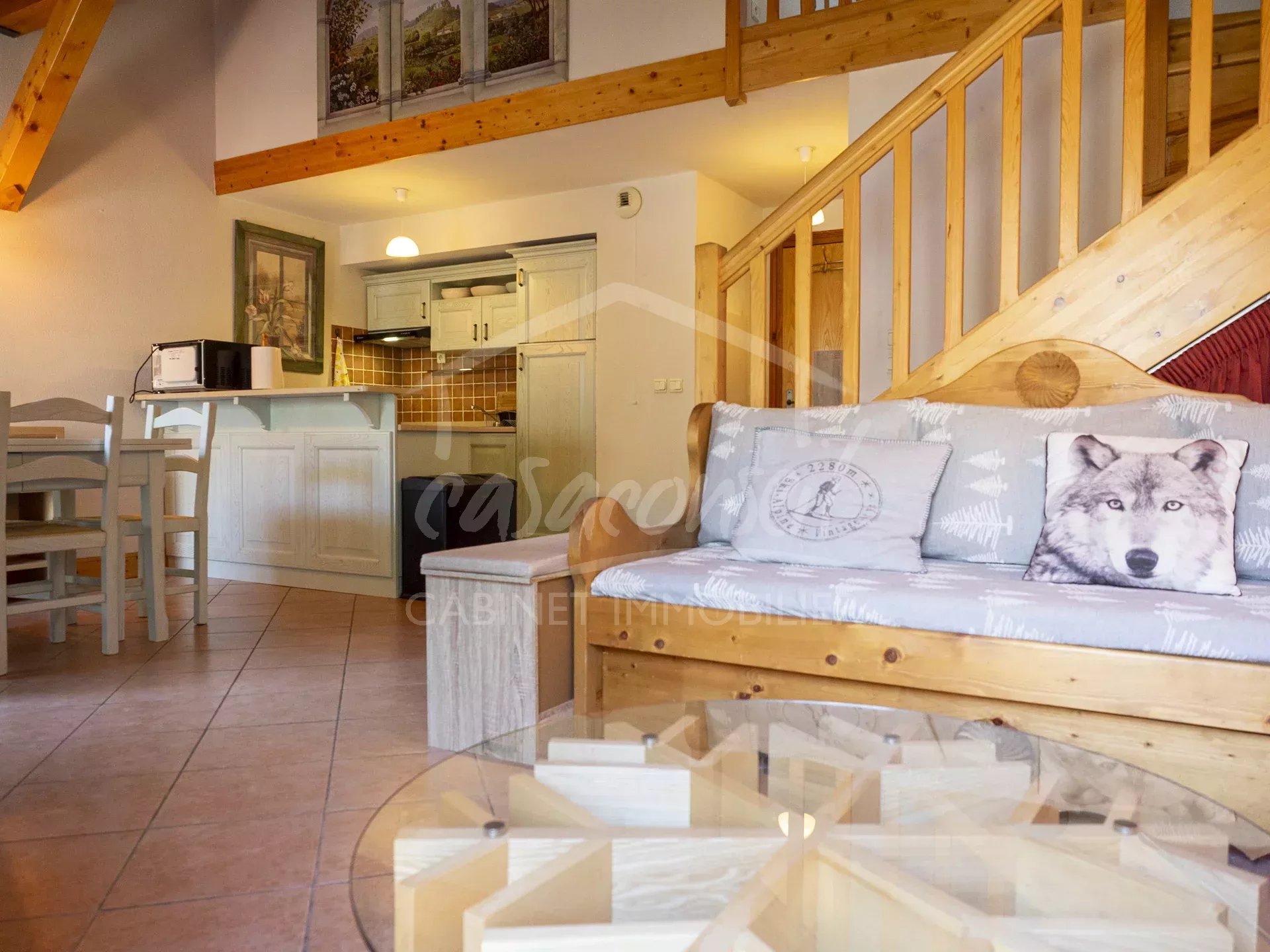 EXCLUSIVITE! Idéalement situé en plein cœur du village, ce large appartement profite de tous les atouts, soleil, vue et proximité! Très bien agencé il comprend: séjour, cuisine, espace salon avec 2 balcons côté sud, 1 salle de bains -toilette. A l'étage s'organise la zone nuit avec 3 chambres et une salle de bains avec toilette et buanderie. Annexes :Large garage fermé en sous sol, cave et casier à skis. Arrêt navettes gratuites au pied de l'immeuble pour oublier la voiture et faire tout à pieds ;-)