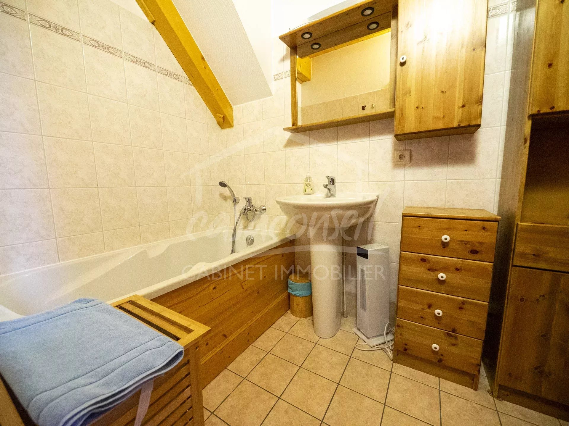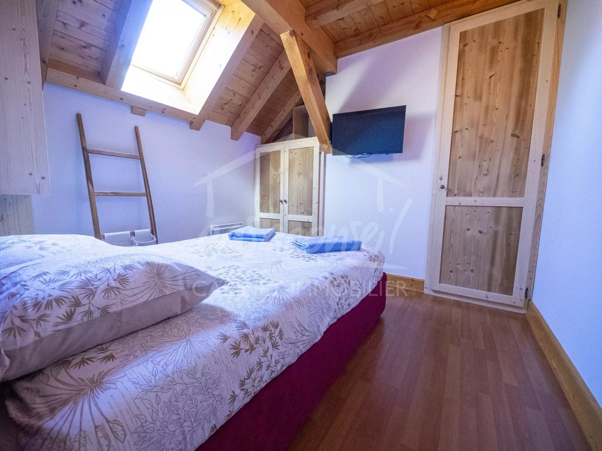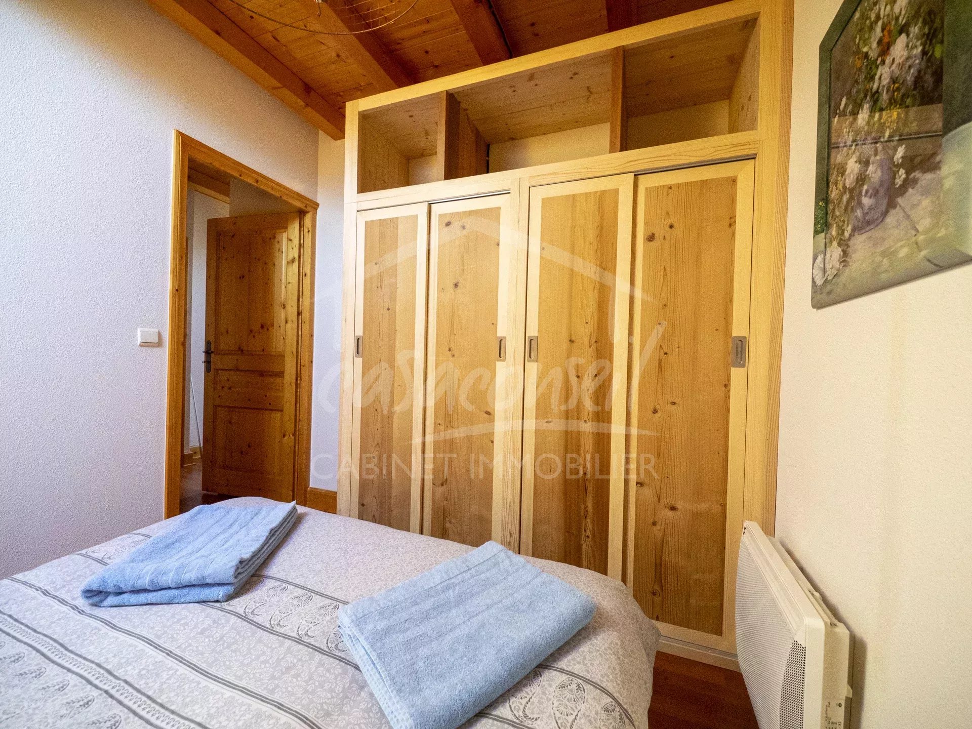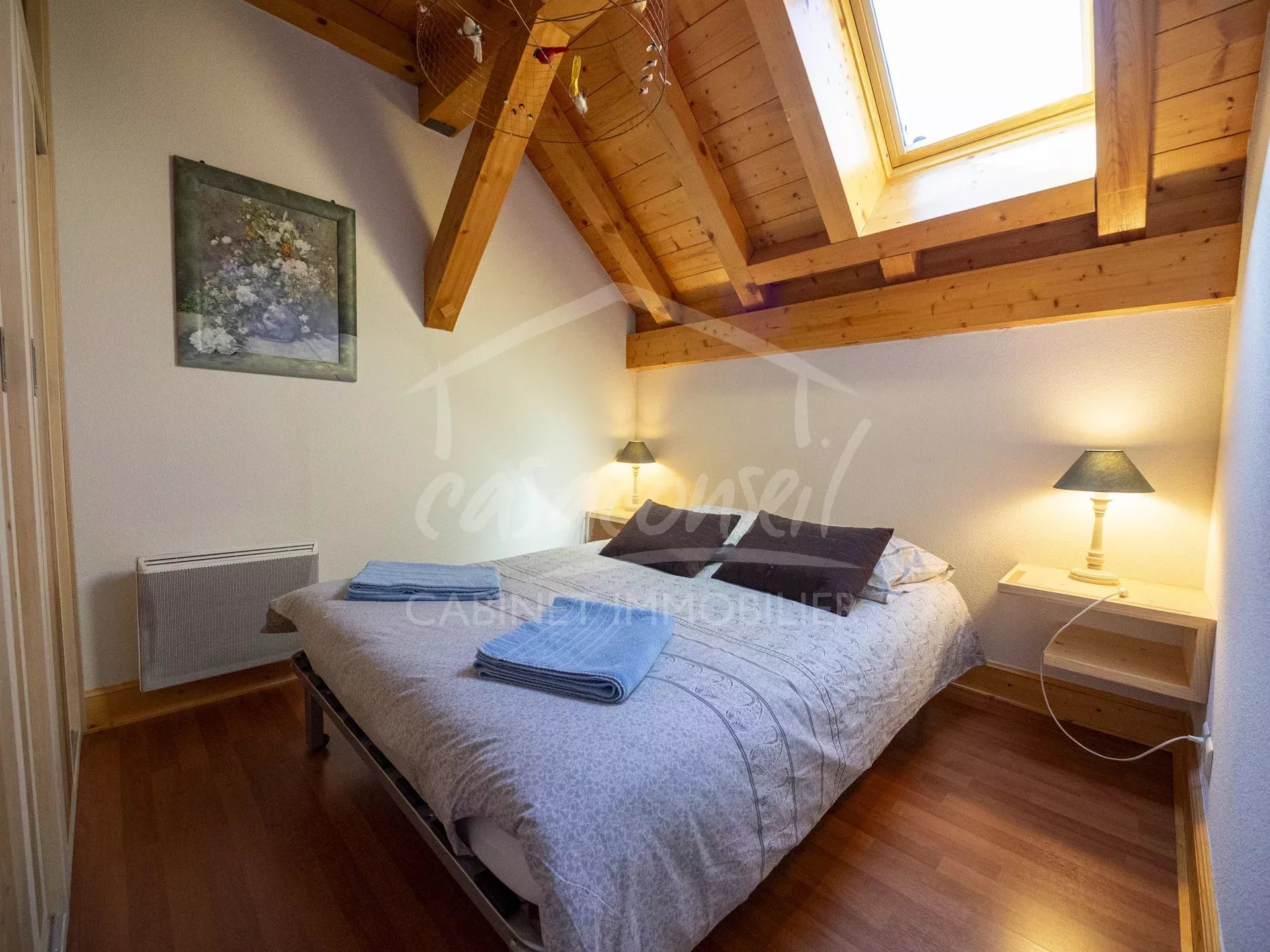 EXCLUSIVITE! Idéalement situé en plein cœur du village, ce large appartement profite de tous les atouts, soleil, vue et proximité! Très bien agencé il comprend: séjour, cuisine, espace salon avec 2 balcons côté sud, 1 salle de bains -toilette. A l'étage s'organise la zone nuit avec 3 chambres et une salle de bains avec toilette et buanderie. Annexes :Large garage fermé en sous sol, cave et casier à skis. Arrêt navettes gratuites au pied de l'immeuble pour oublier la voiture et faire tout à pieds ;-)