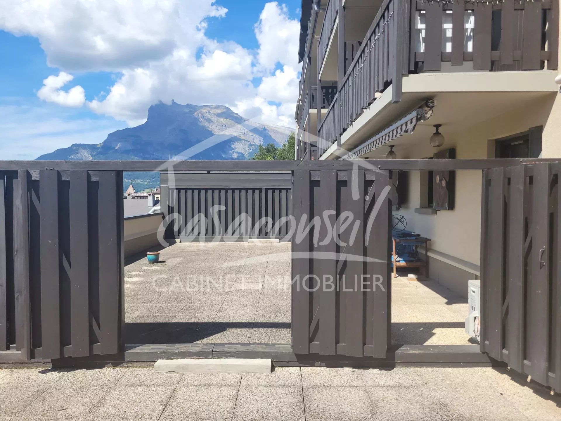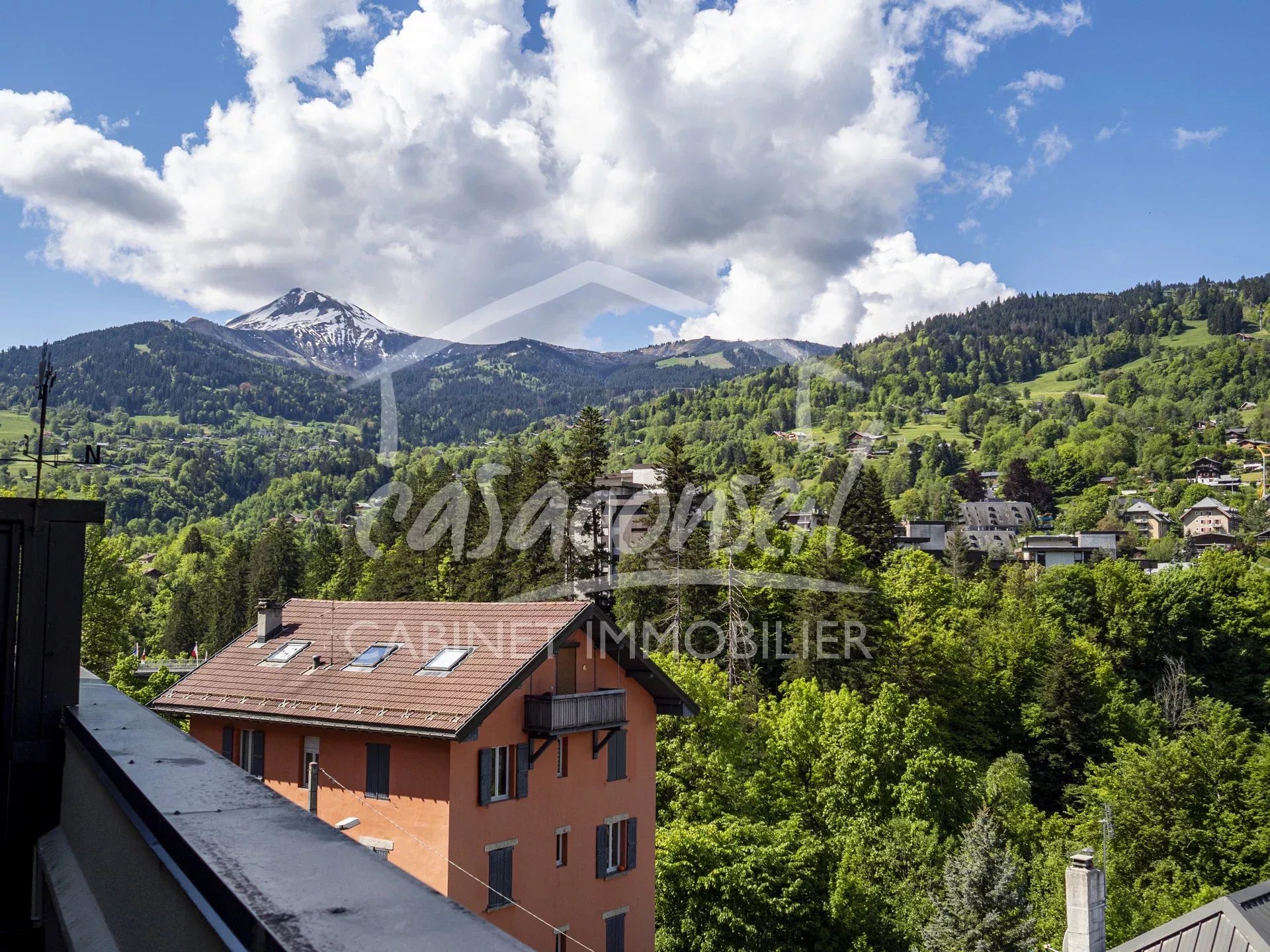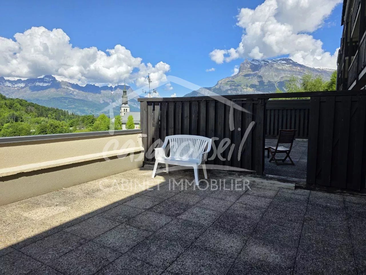 L'espace de vie et la cuisine profitent d'une magnifique terrasse de 69m² surplombant le village de St Gervais et la chaîne des Aravis.